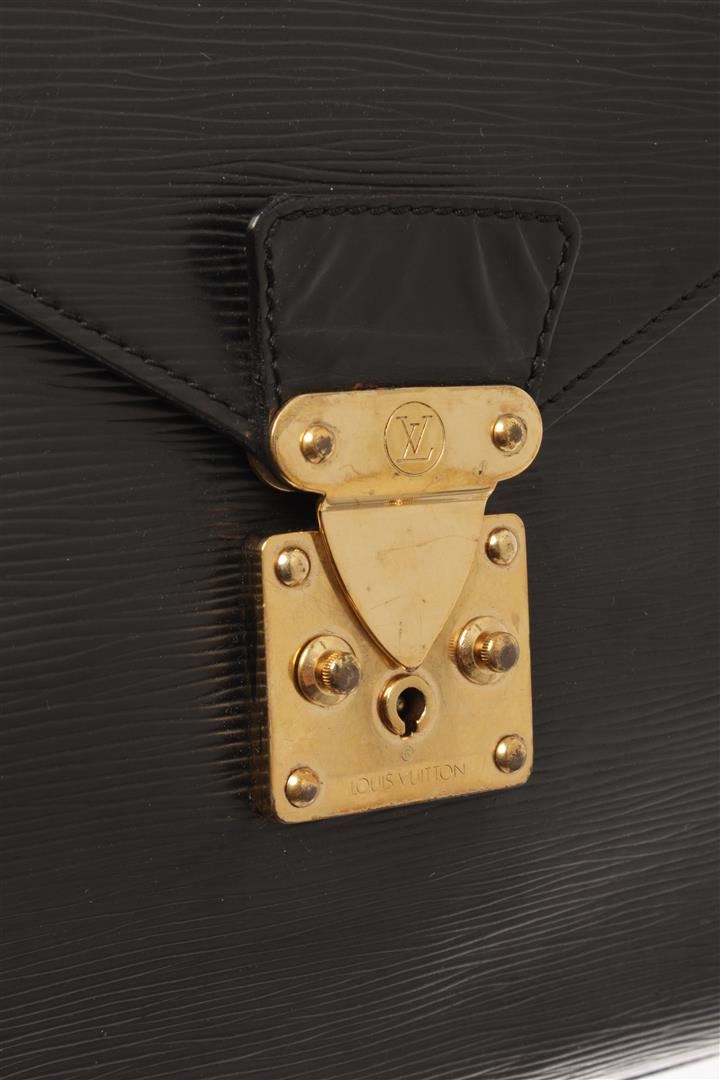 One Louis Vuitton Black Epi Leather Serviette Ambassador Briefcase. Item is sold AS-IS. All available information is listed in the description and shown in the photo. louis vuitton black epi leather serviette ambassador briefcase with gold-tone hardware, accordion details at sides, an internal zipped pocket and multiple interior compartments, top with flip-lock closure, a textured leather detail, a top handle. Width 16.1 in, Height 11.8 in, Depth 2.4 in/ Width 41 cm, Height 30 cm, Depth 6 cm