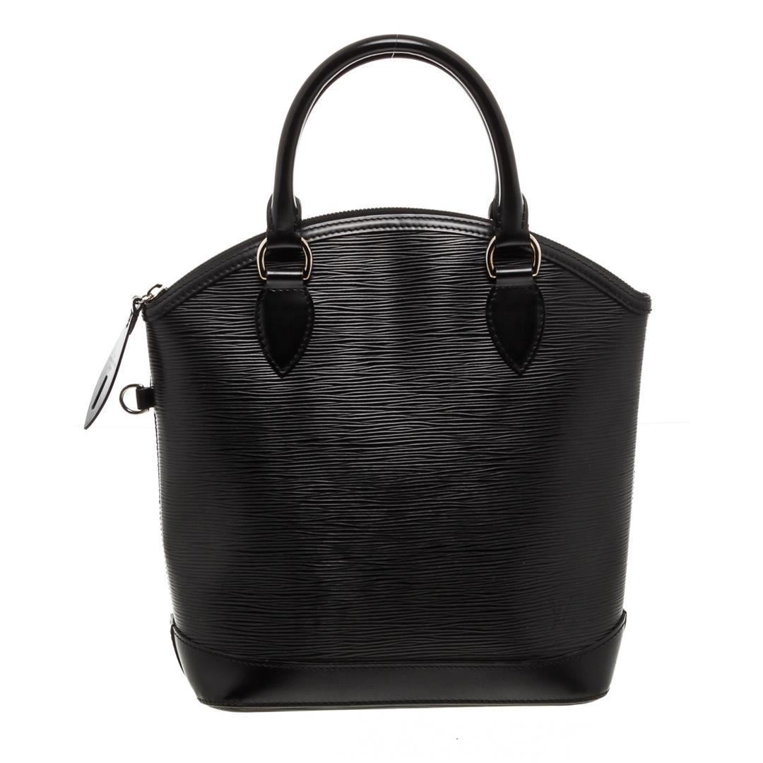 Black Epi leather Louis Vuitton Lockit Vertical bag with dual rolled top handles, black canvas lining, dual slit pockets at interior wall and zip closure at top. Authentic.