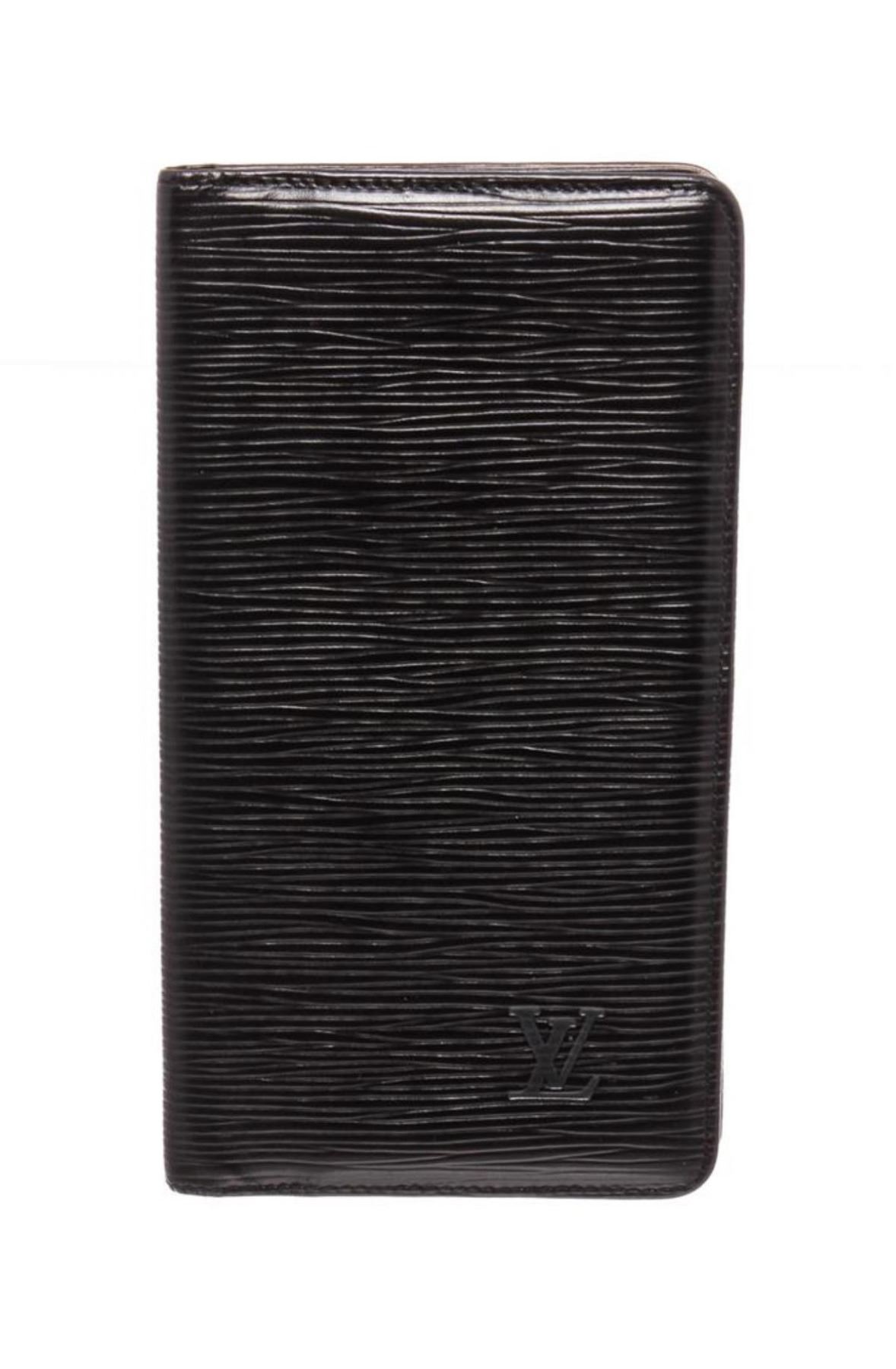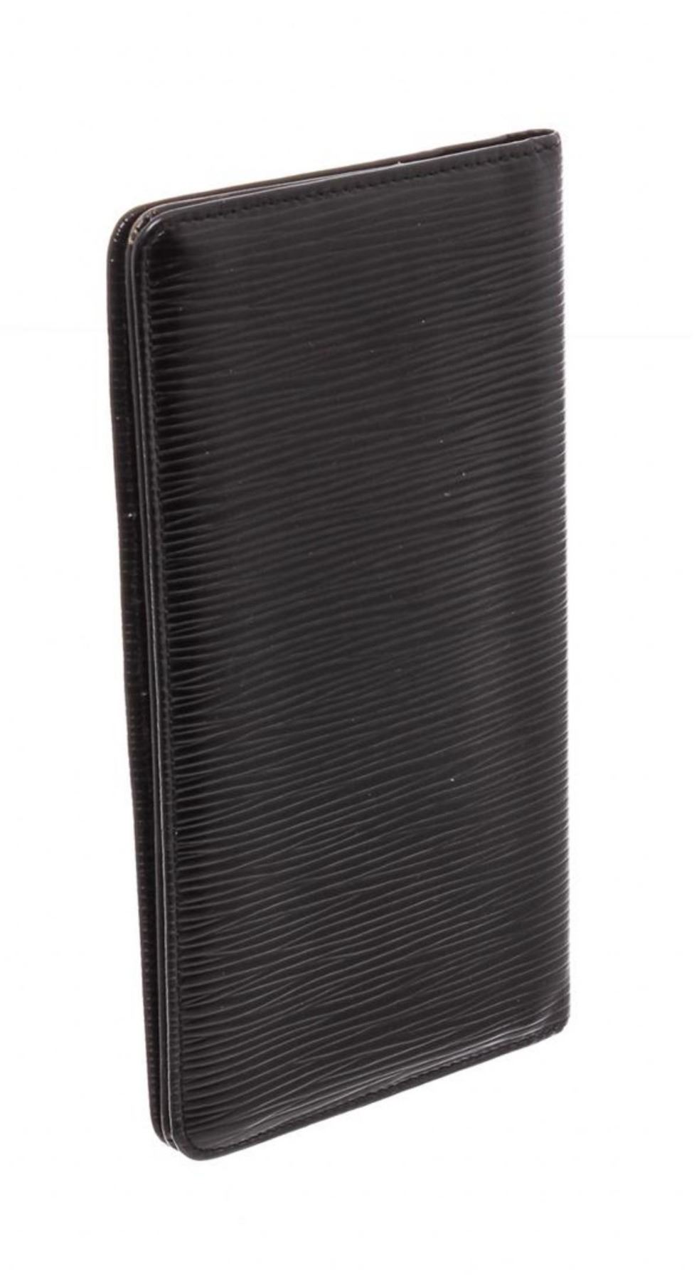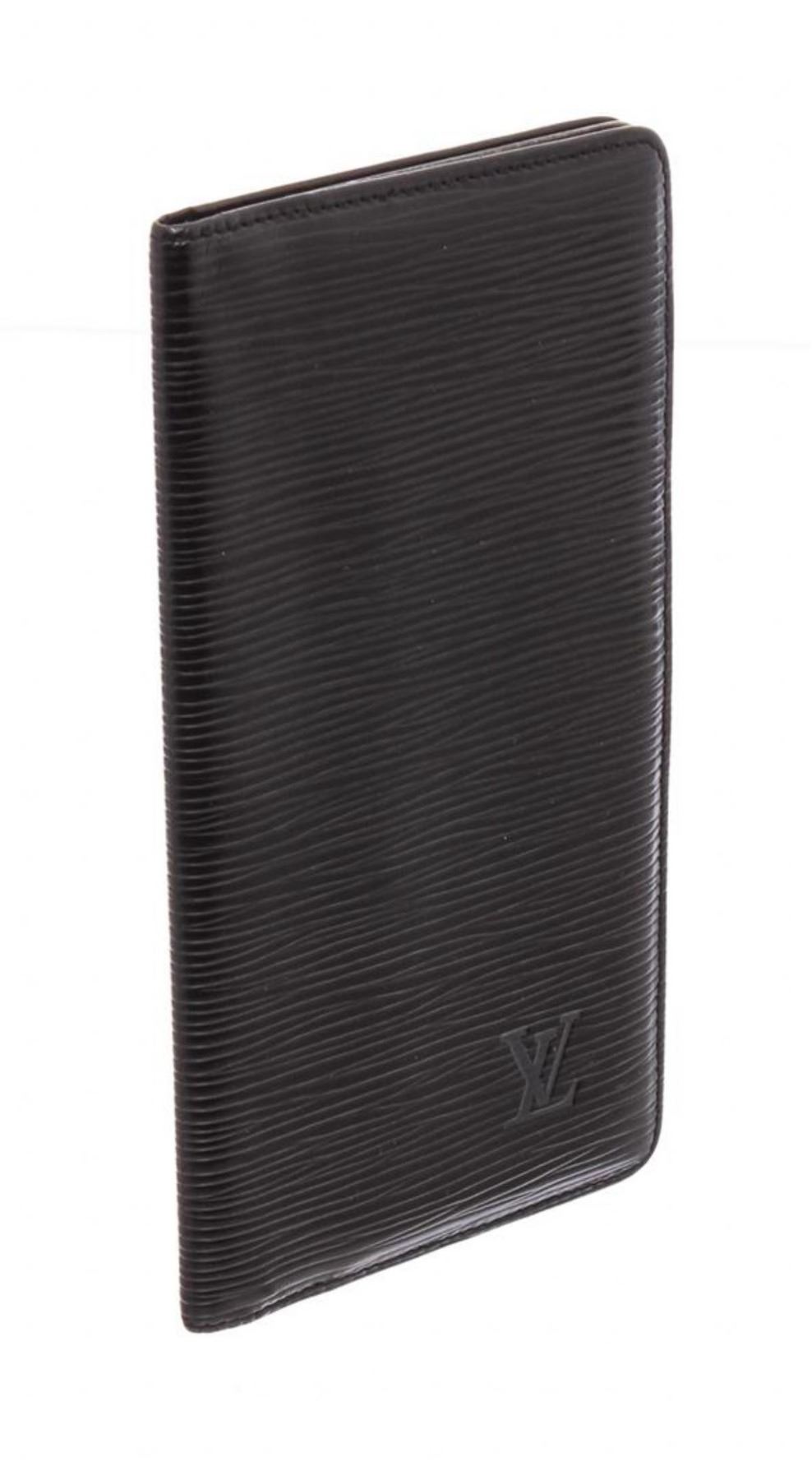 Black Epi leather Louis Vuitton vertical wallet with tonal stitching throughout, debossed logo at corner, tonal textured leather lining, three interior compartments, six card slots at interior wall and flap closure.