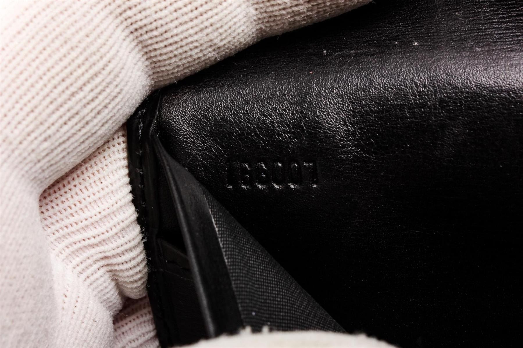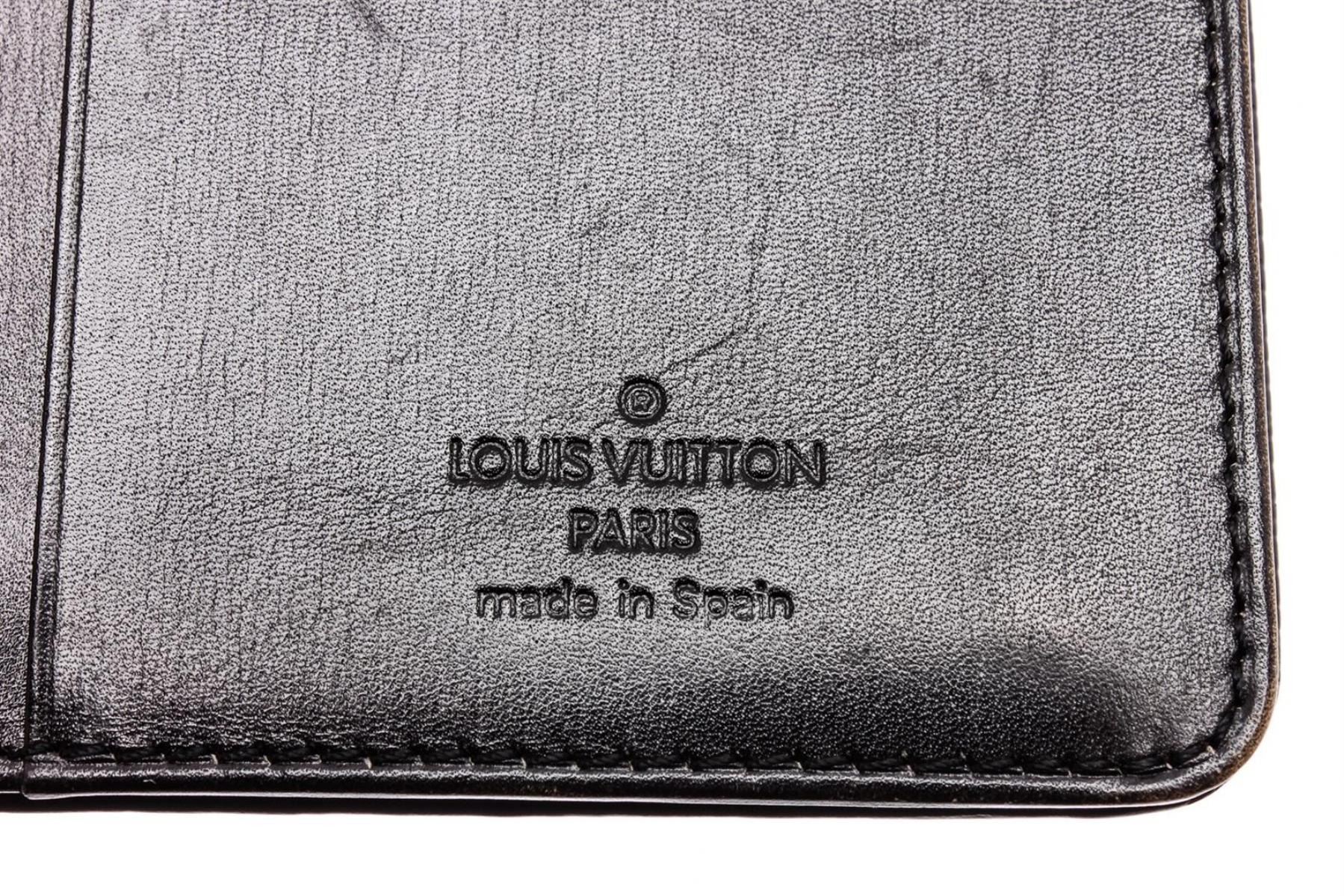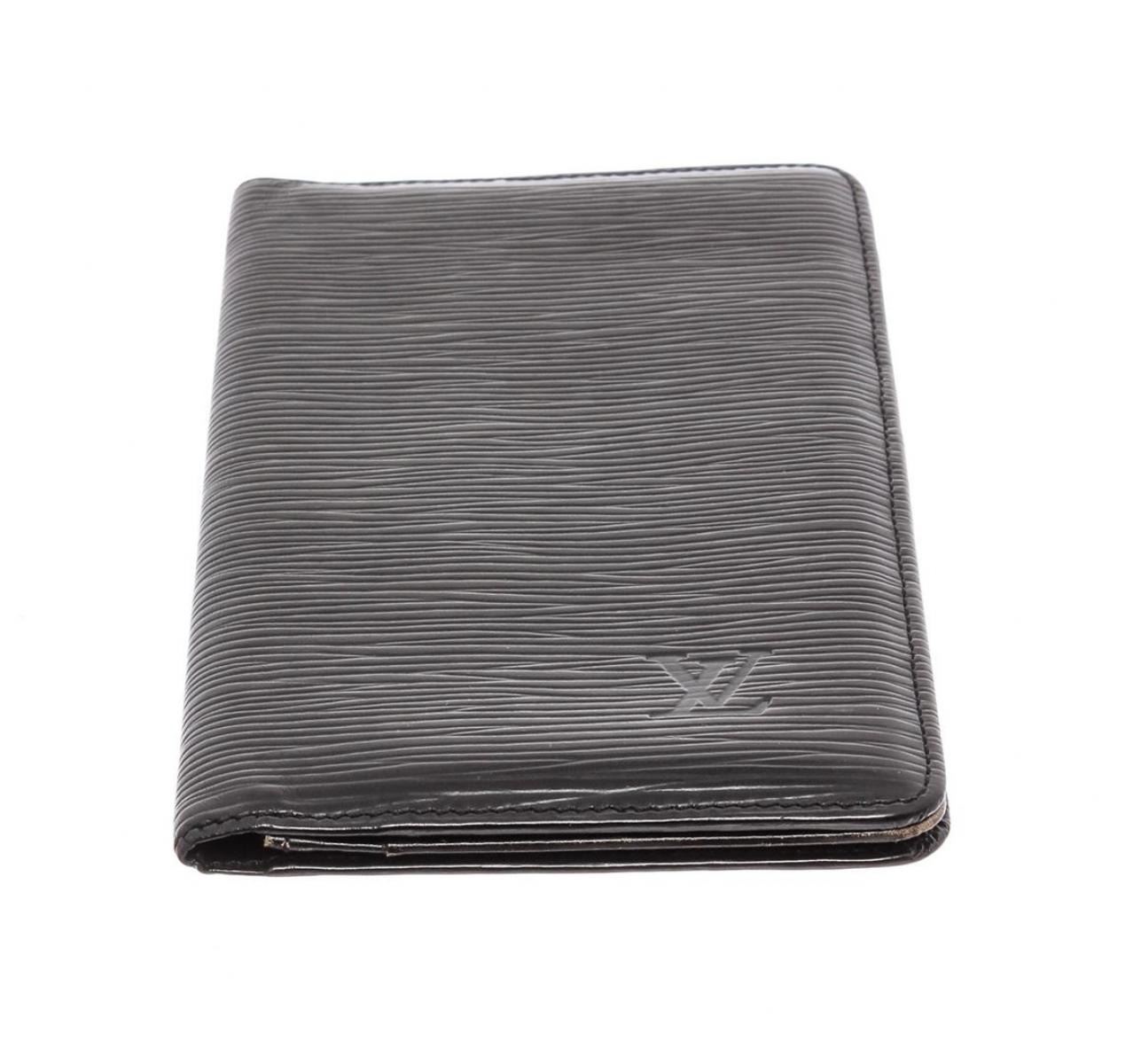 Black Epi leather Louis Vuitton vertical wallet with tonal stitching throughout, debossed logo at corner, tonal textured leather lining, three interior compartments, six card slots at interior wall and flap closure.