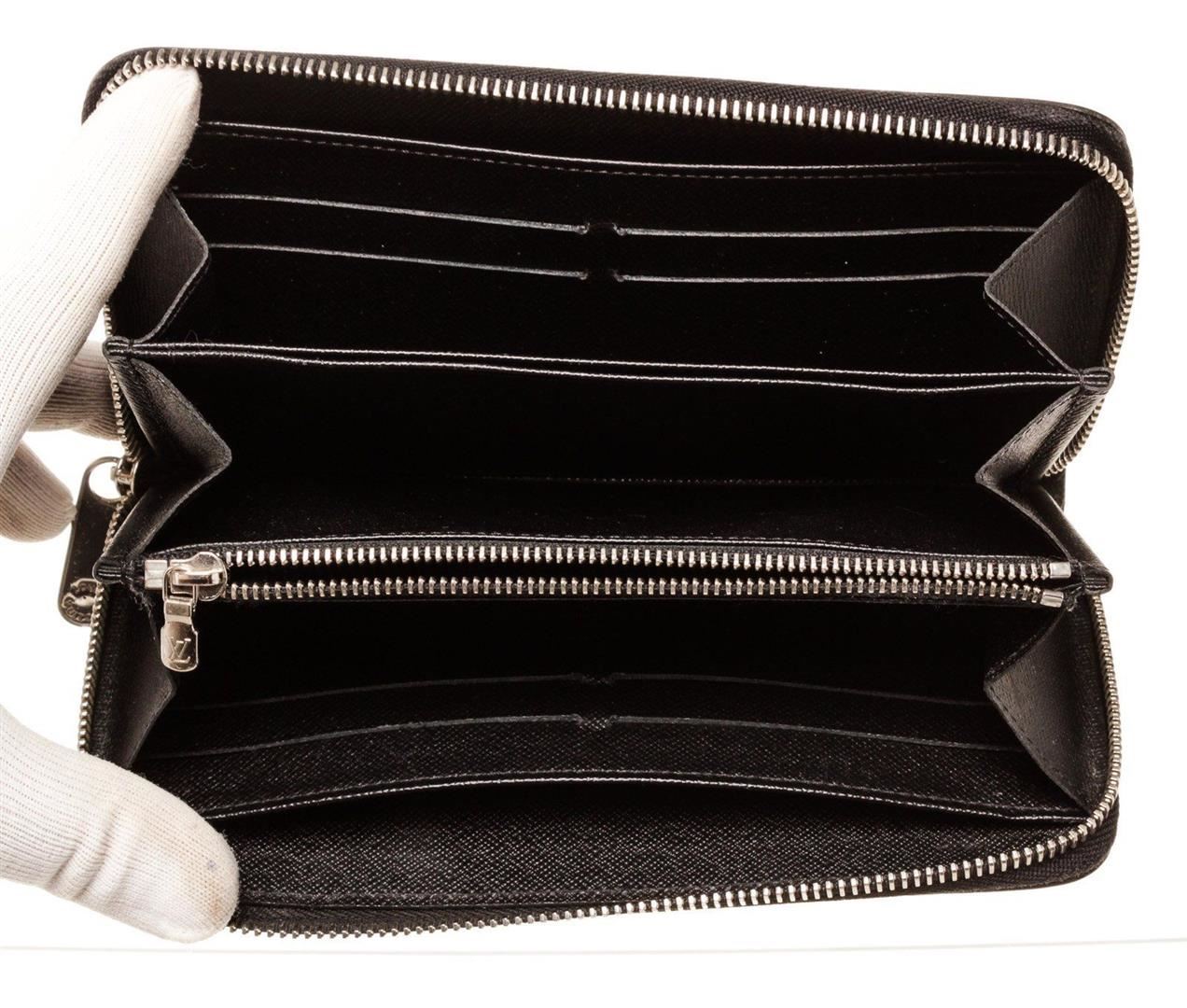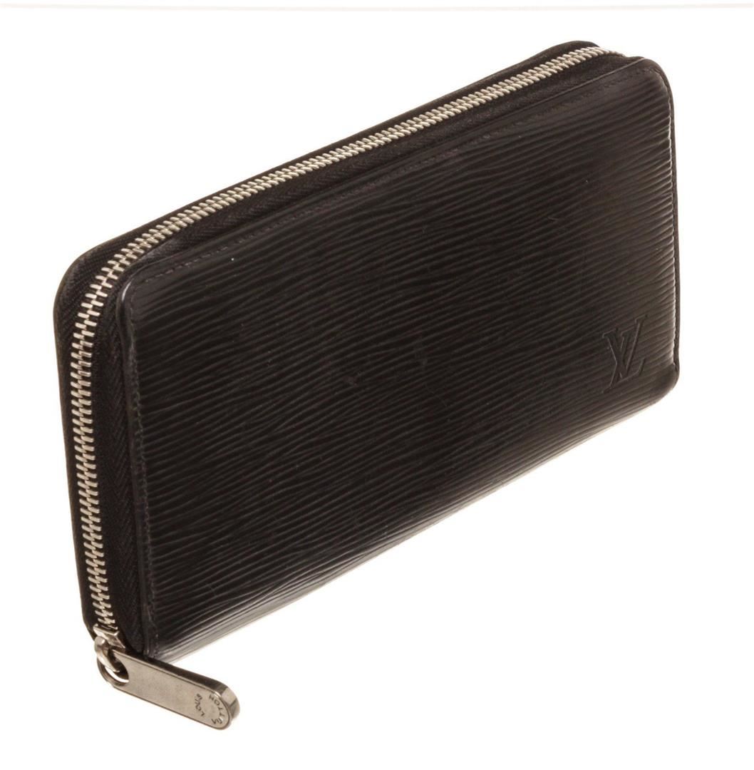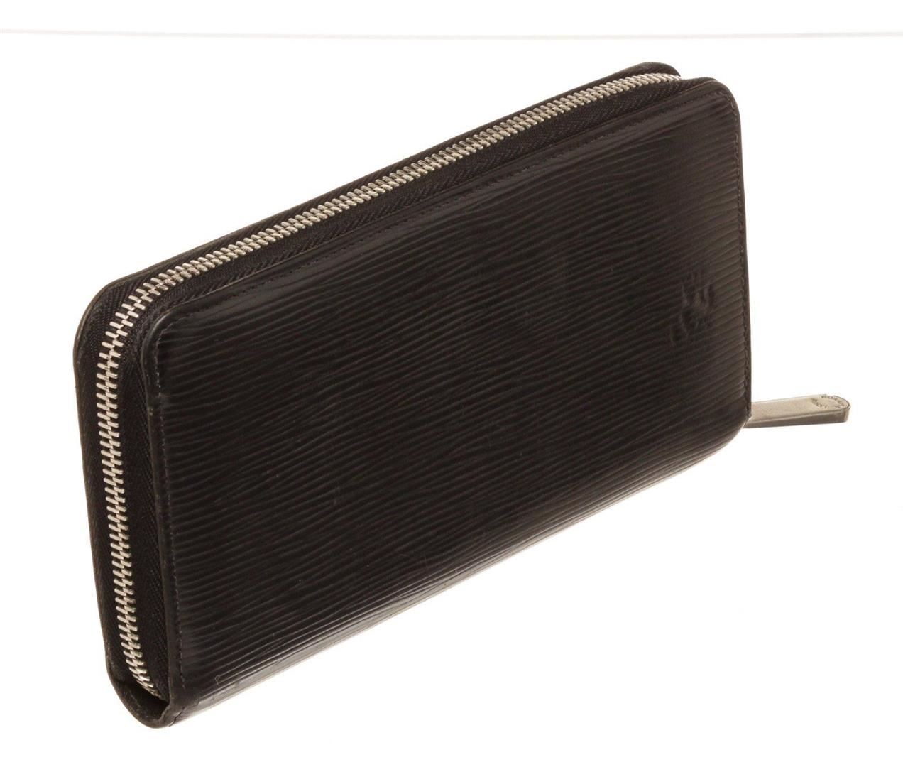 Louis Vuitton Black Epi Leather Zippy Wallet with silver hardware, embossed logo at corner, tonal leather lining, single interior zip pocket, bill compartment, eight card slots and zip front closure.
