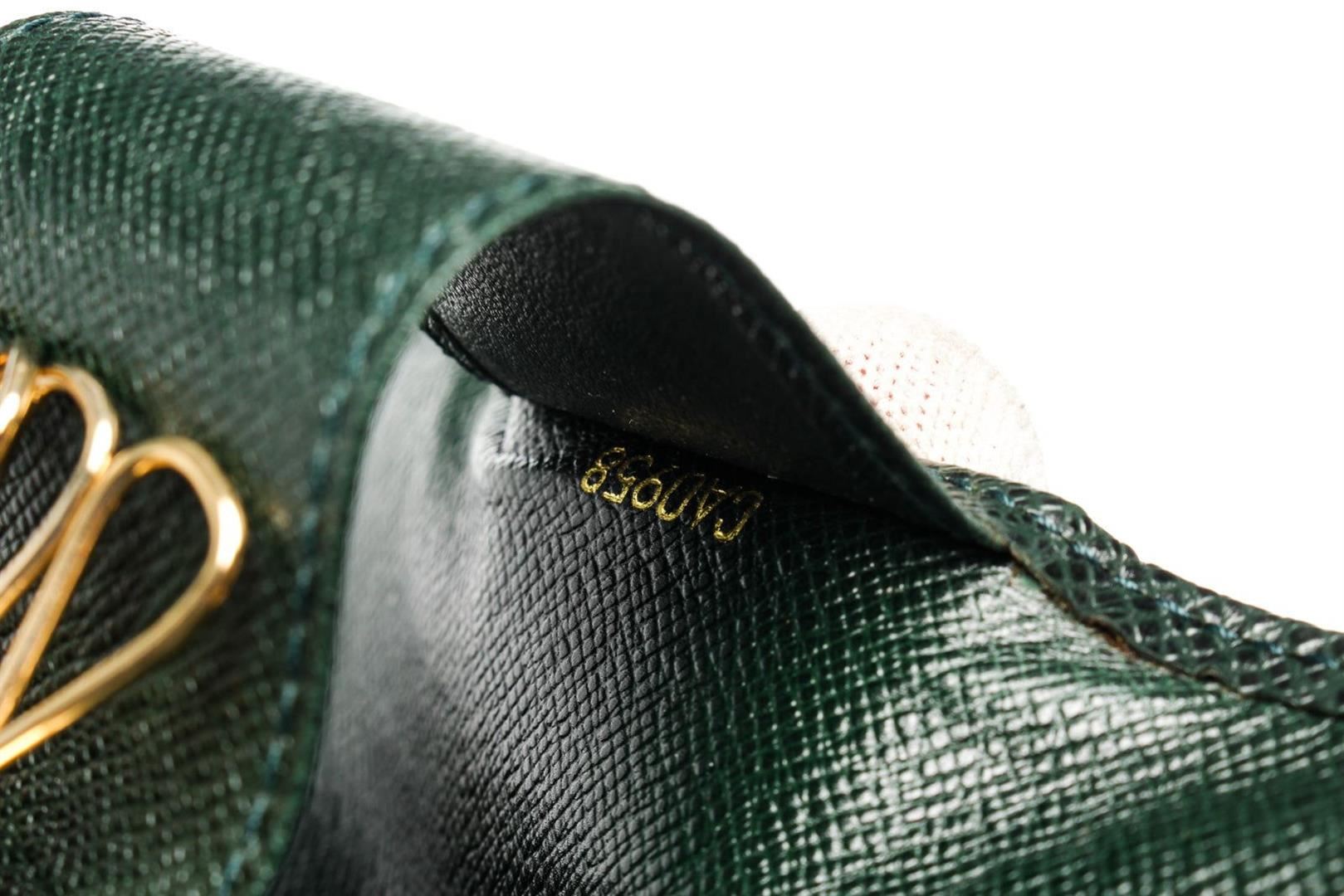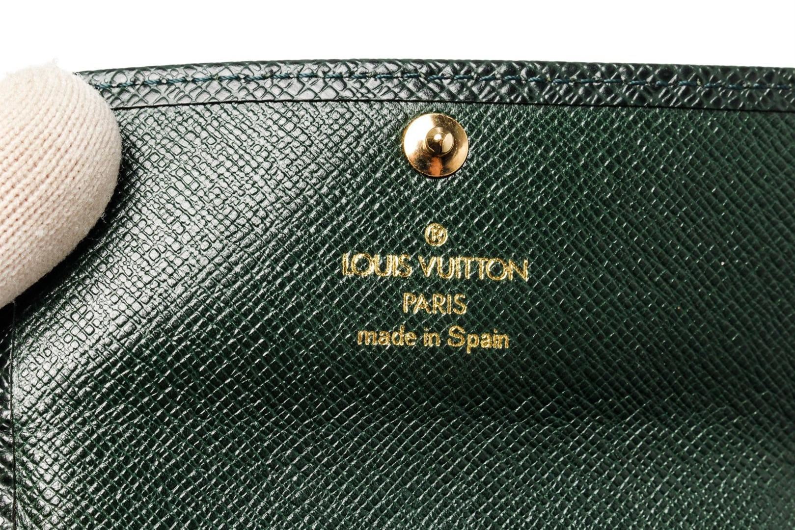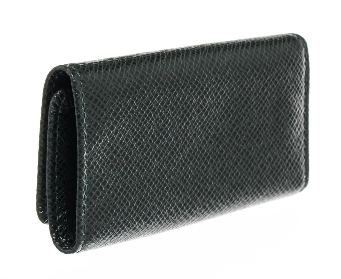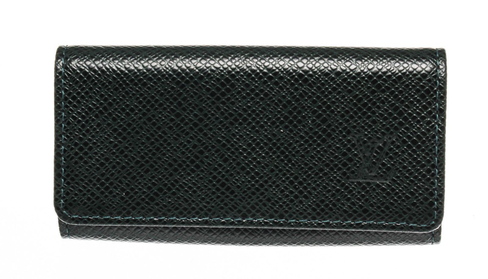 Louis Vuitton Black Leather 4 Key Holder Wallet with monogram canvas, gold-tone hardware, interior pen holder pockets, trim tan vachetta leather and snap closure.