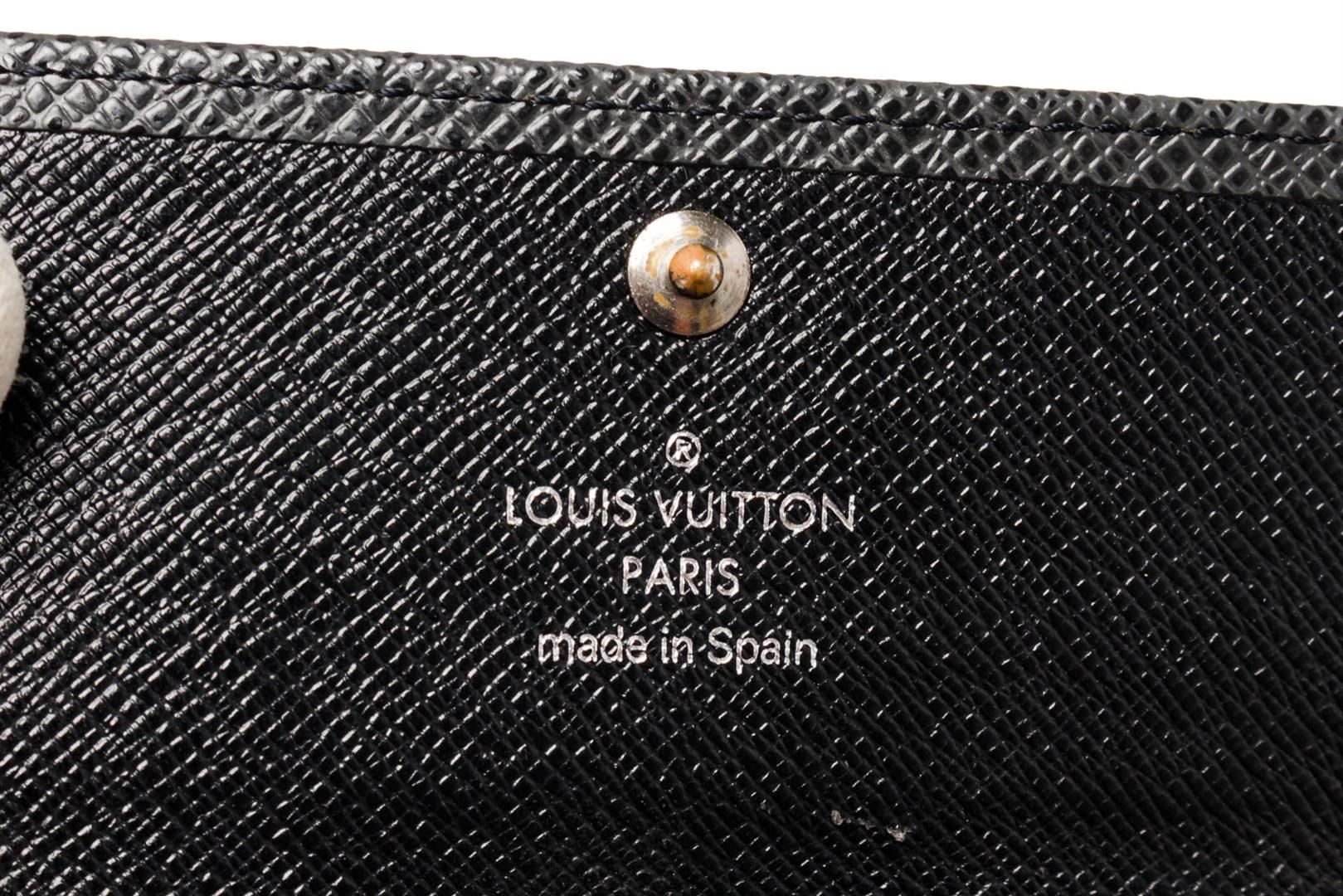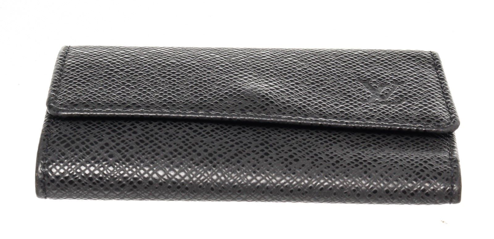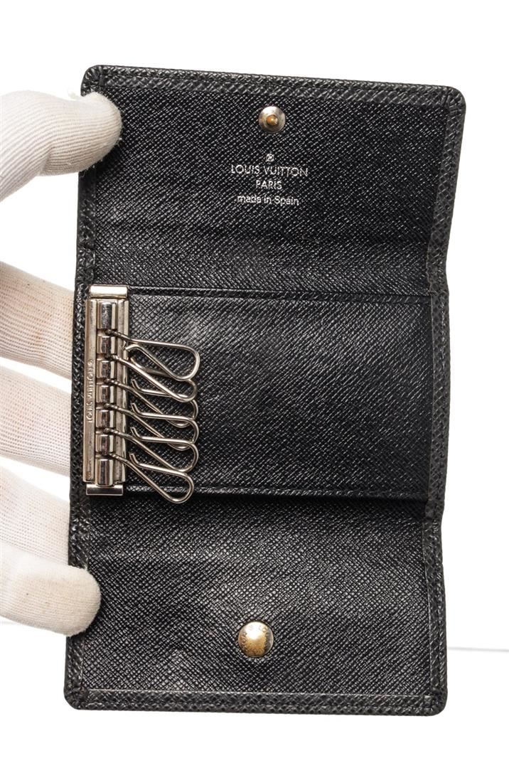 Louis Vuitton Black Leather 6 Key Holder Wallet with Leather, gold-tone hardware, interior pen holder pockets, trim tan vachetta leather and snap closure.