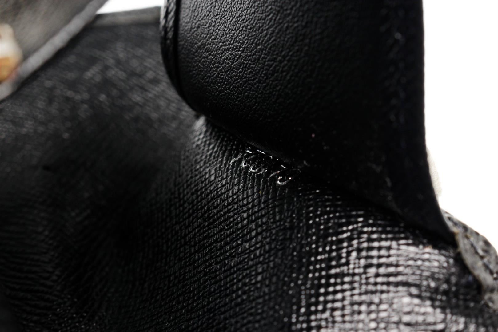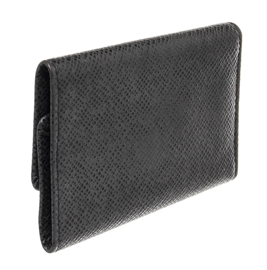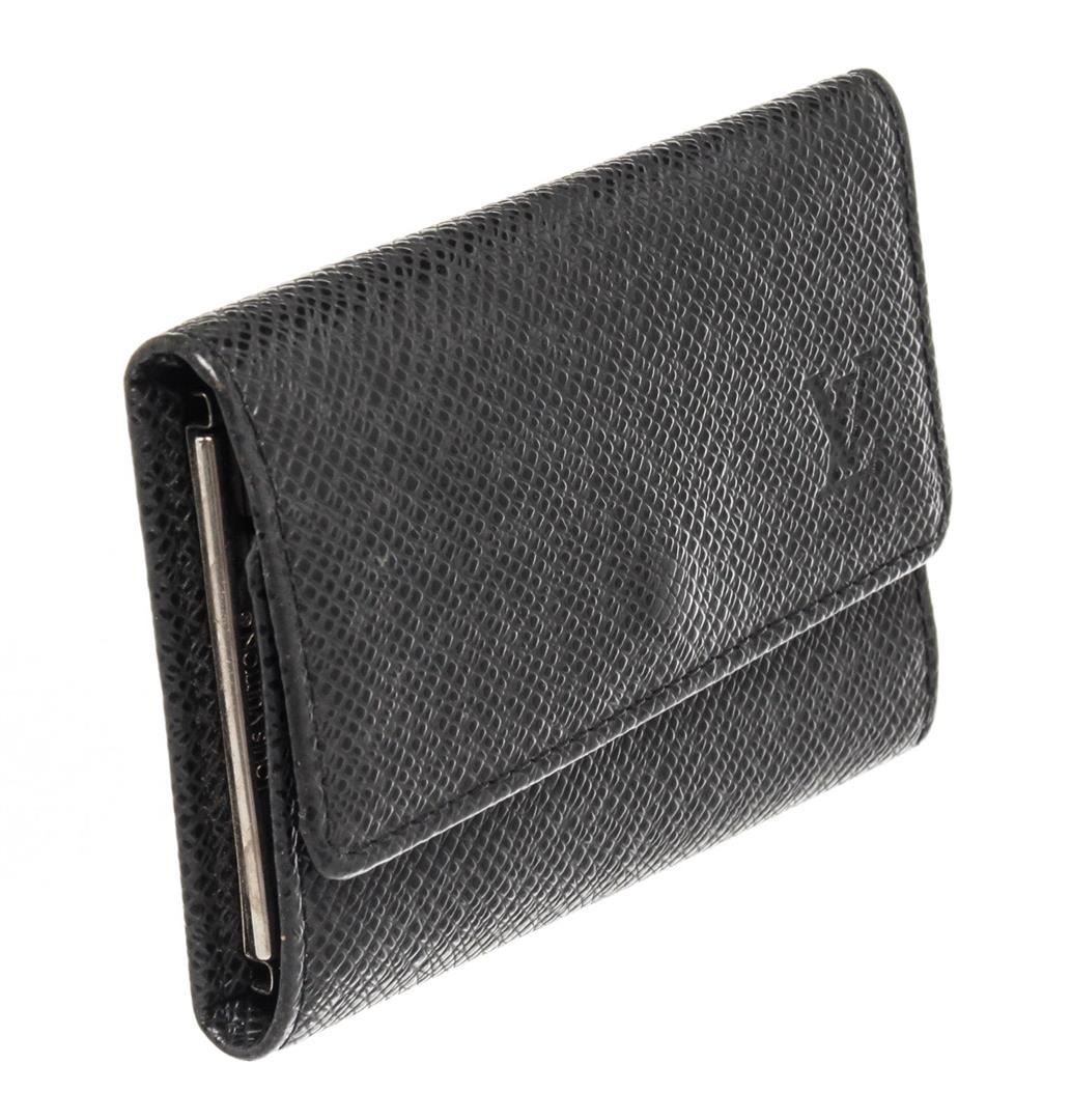 Louis Vuitton Black Leather 6 Key Holder Wallet with Leather, gold-tone hardware, interior pen holder pockets, trim tan vachetta leather and snap closure.