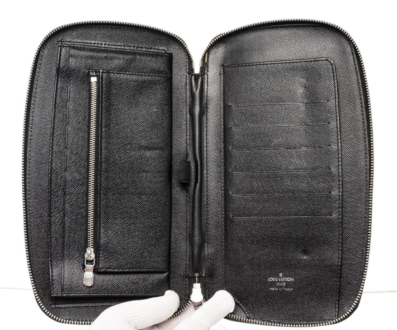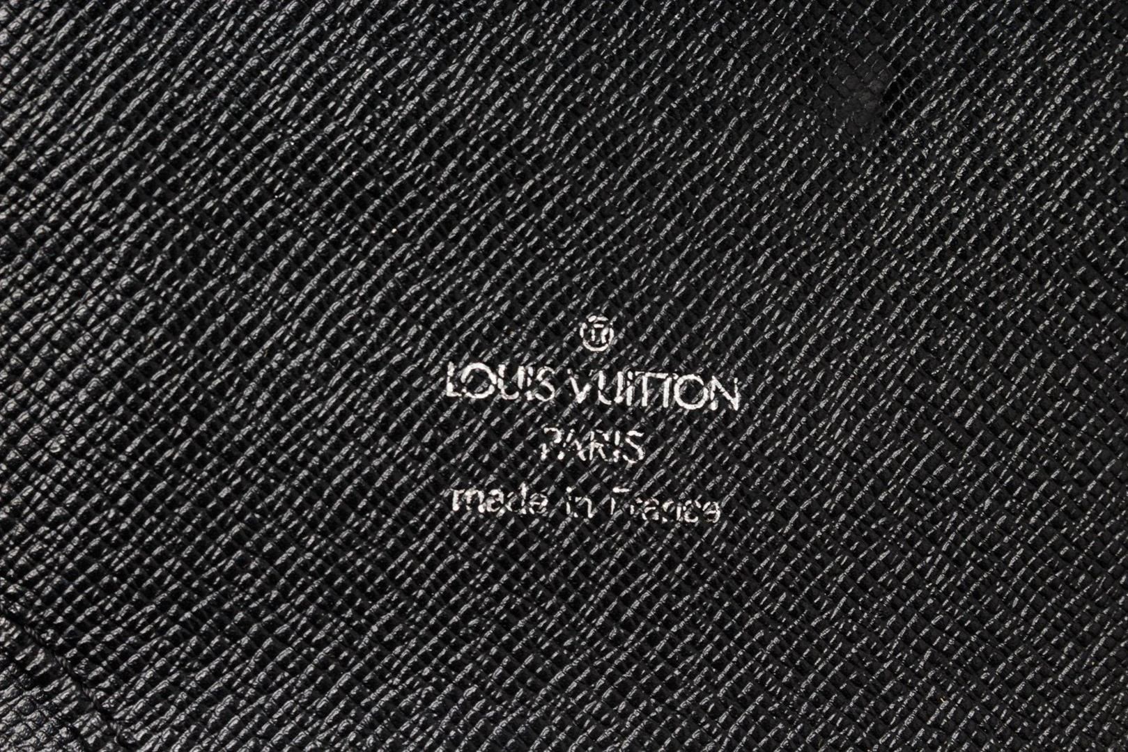 Louis Vuitton Black Leather Atoll Organizer Wallet with leather, gold-tone hardware, trim tan vachetta, interior cardholder pocket and zipper closure.
