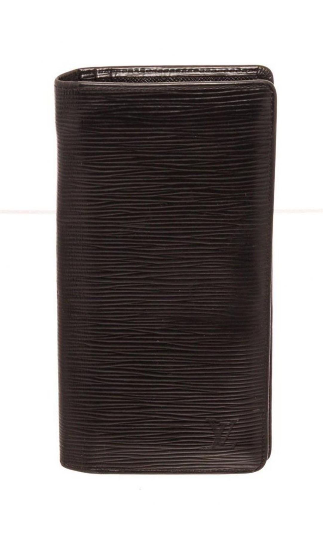 Louis Vuitton Black Leather Brazza Wallet. Louis Vuitton Black Leather Brazza Wallet with material leather, gold-tone hardware, trim tan vachetta leather, interior card holder pocket, leatherlining and flap closure. MEASUREMENTS: Length 13 in / 33 cm W