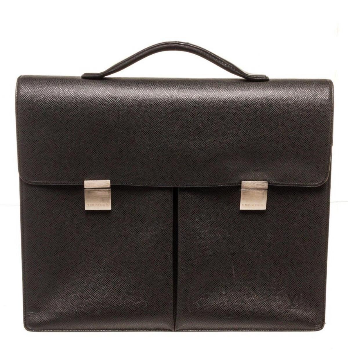 Louis Vuitton Black Leather Briefcase. Louis Vuitton Black Leather Briefcase with material leather, gold-tone hardware, tan vachetta leather trim, interior slip pocket, top handle, and push lock closure.
