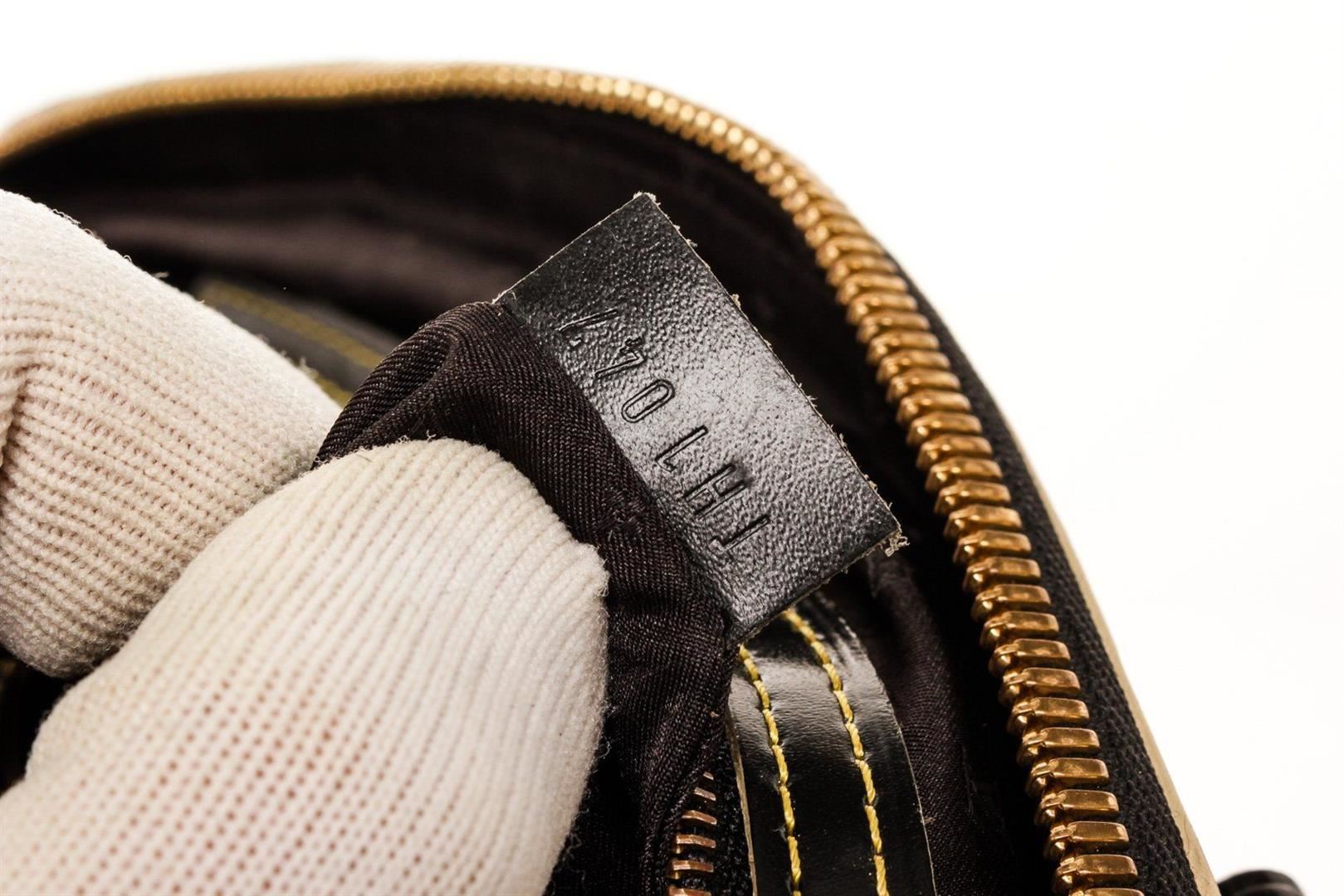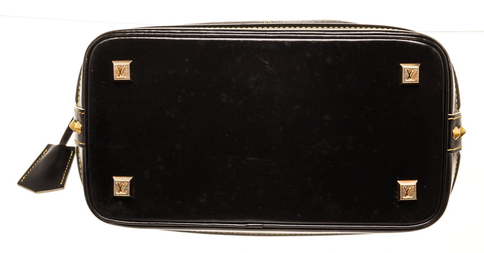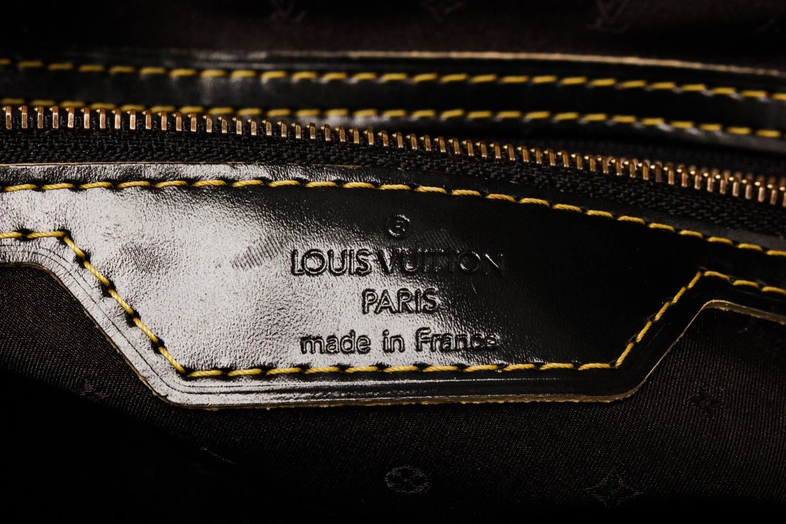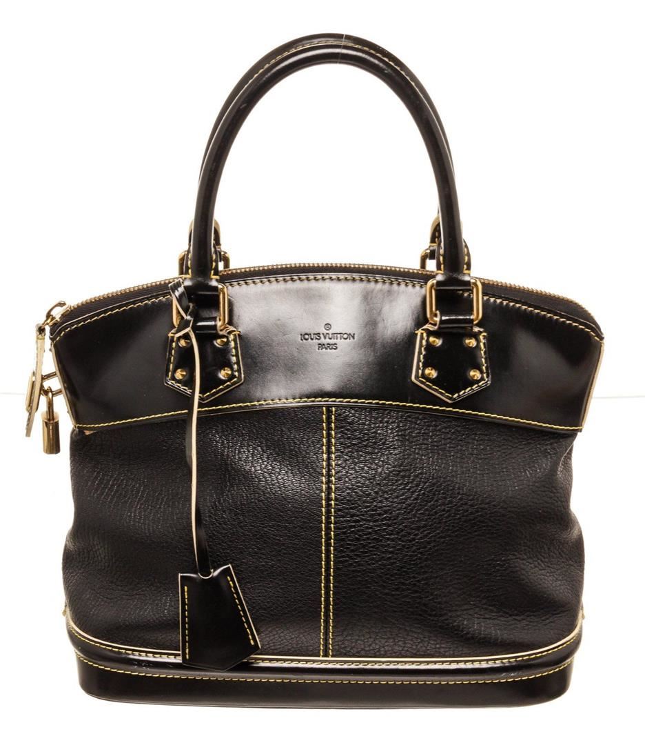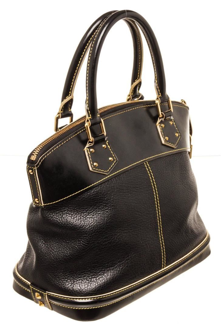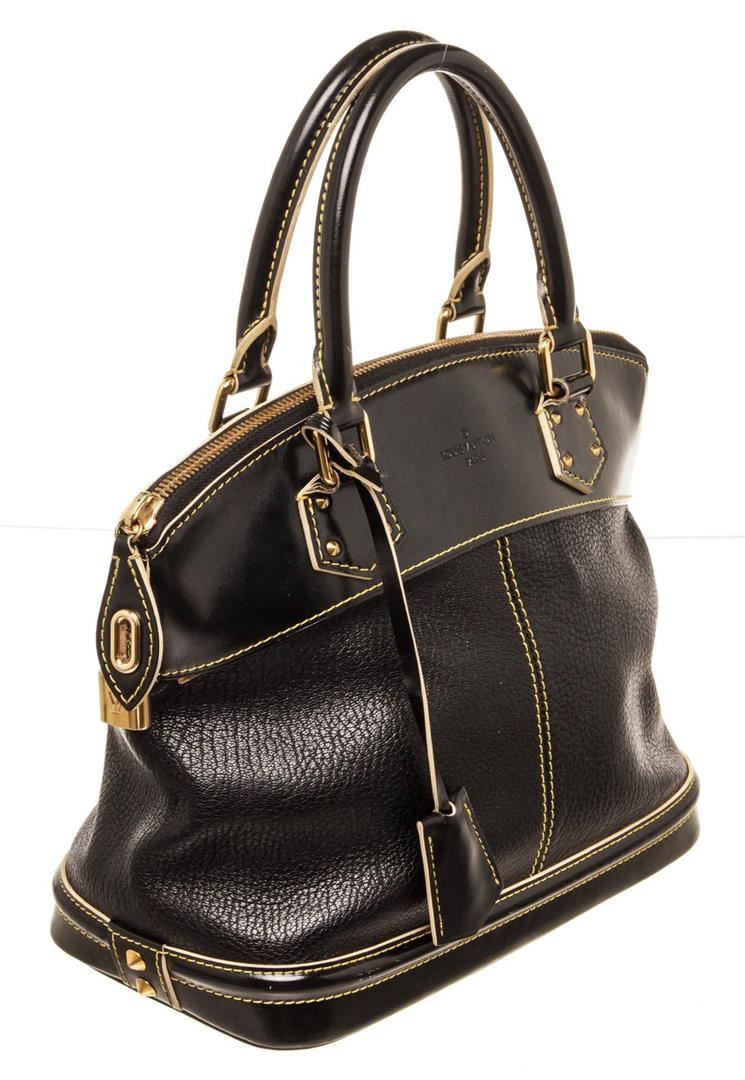Louis Vuitton Black Leather Lockit PM Tote Bag with leather, gold-tone hardware, leather material, tan vachetta leather trim, slip Interior pocket, dual top handle bag, and zipper closure.