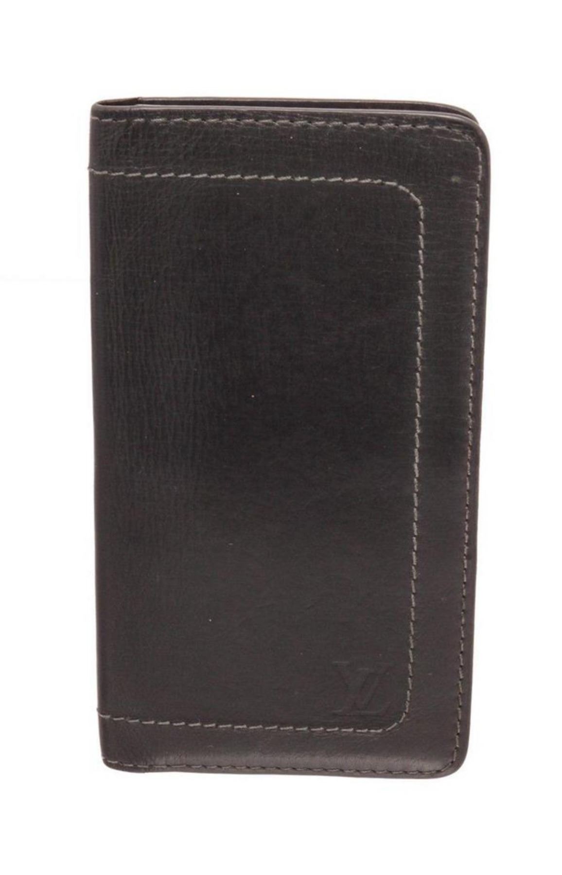 Louis Vuitton Black Leather Long Card Wallet. Louis Vuitton Black Leather Long Card Wallet with gold-tone hardware, interior card holder pockets, trim tan vachetta leather, flap closure. MEASUREMENTS: Length 6.5 in / 17 cm Width 3.5 in / 9 cm Heigh