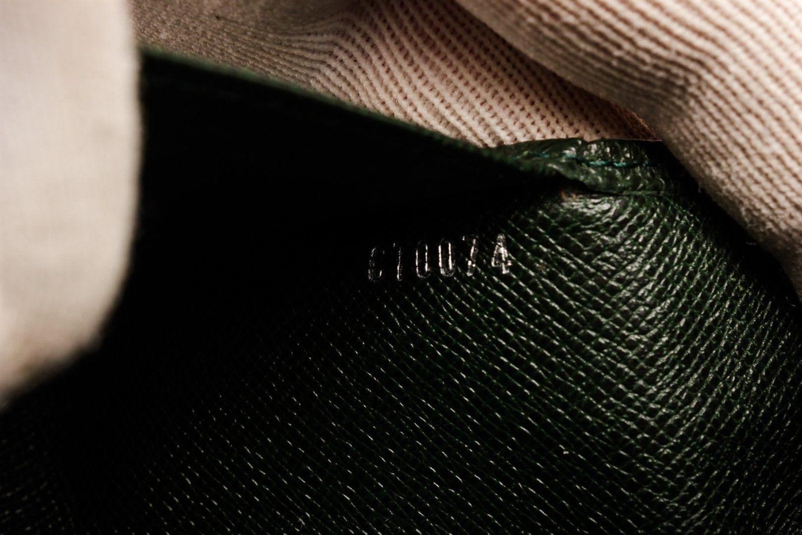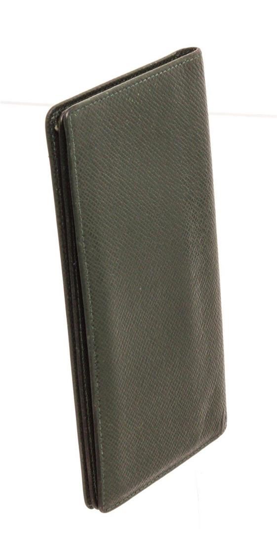 Louis Vuitton Black Leather Long Card Wallet with material leather, gold-tone hardware, interior card holder pockets, trim tan vachetta leather, flap closure. Measurements: Length 6.5 in / 17 cm Width 3.5 in / 9 cm Height 0.25 in / 1 cm Condition: Pre-Owned Good overall, please see photographs for detail.