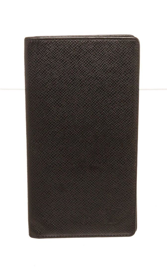 Louis Vuitton Black Leather Long Checkbook Wallet with material leather , gold-tone hardware, trim tan vachetta leather, interior cardholder pocket and snap closure.