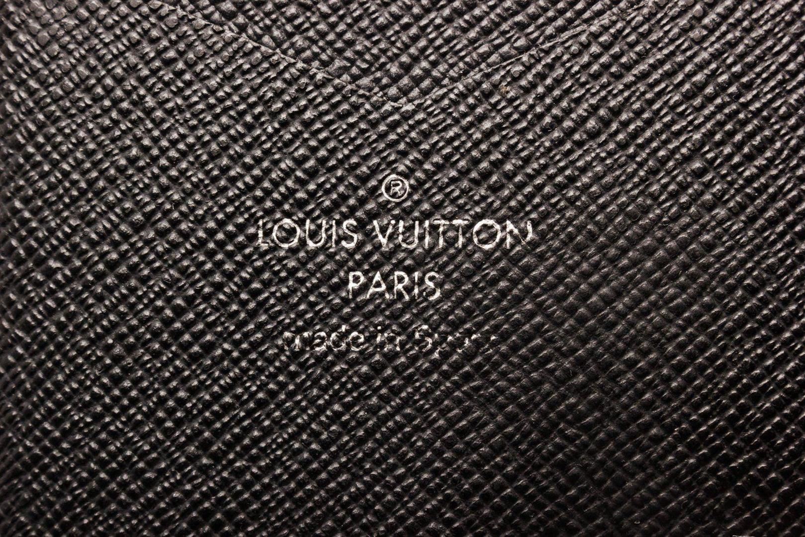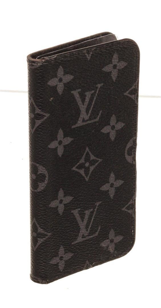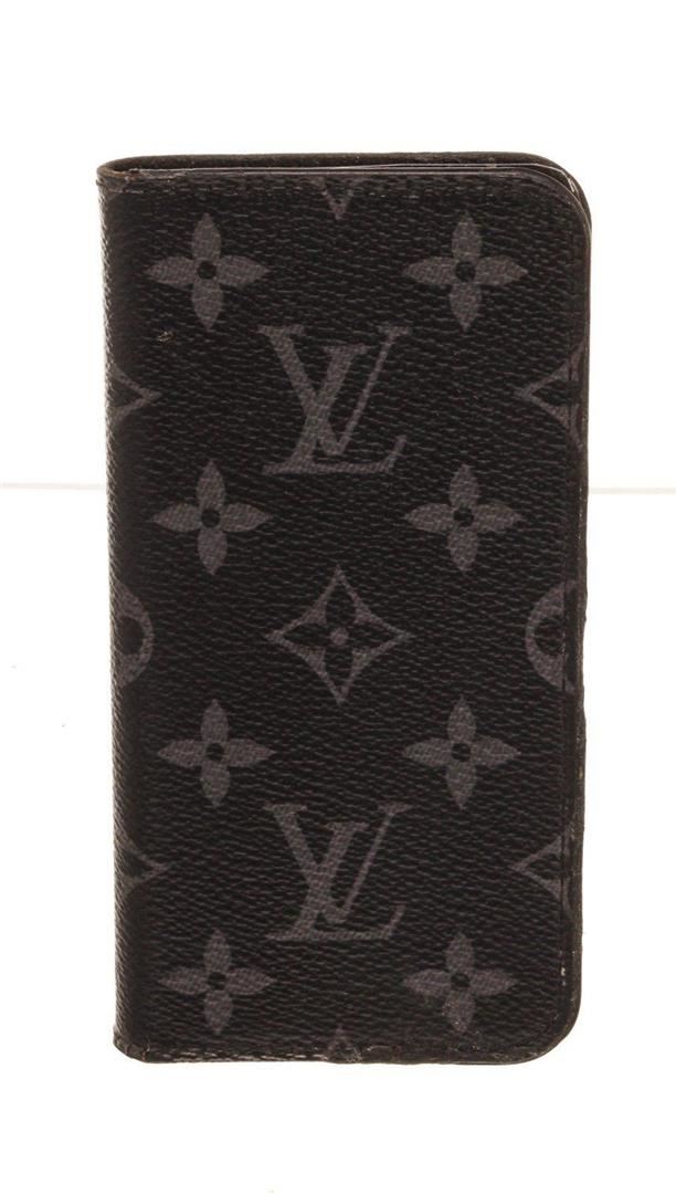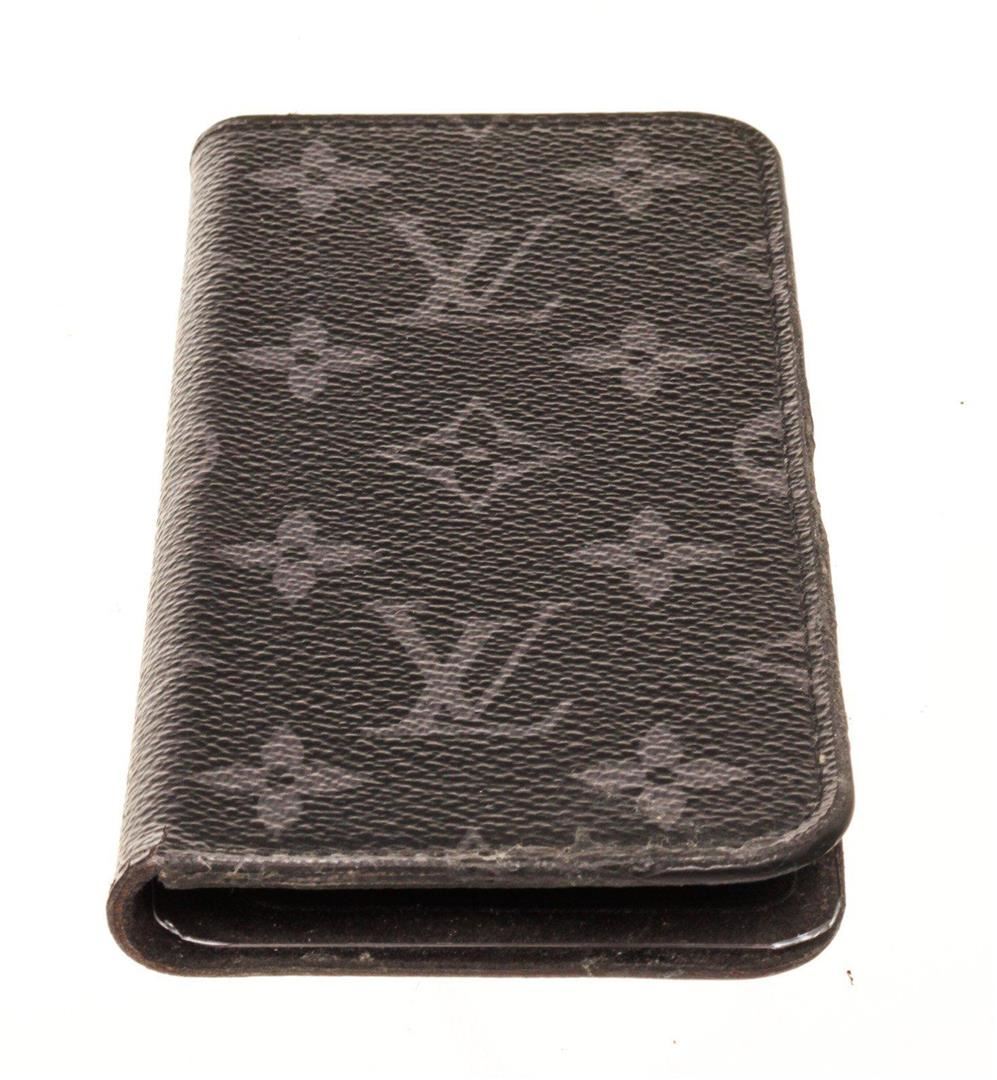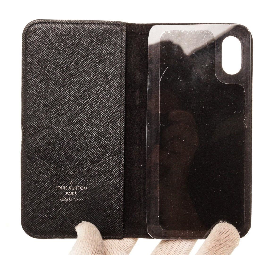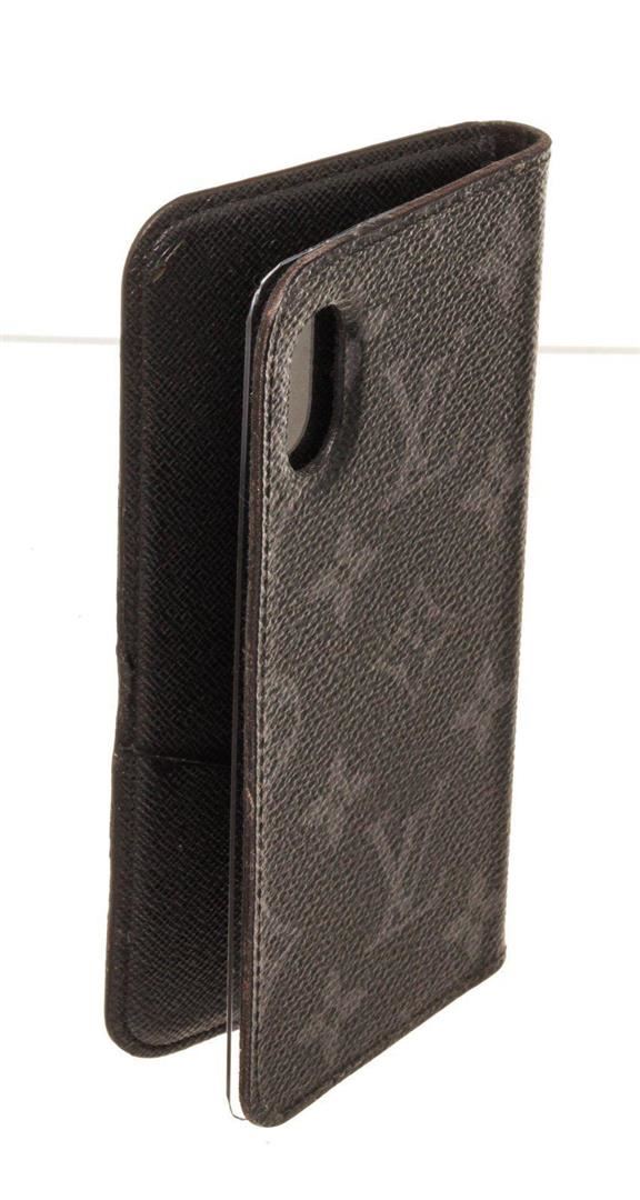 Louis Vuitton Black Leather Monogram Iphone 10 Case with monogram, gold-tone hardware, trim tan vachetta leather and flap closure.