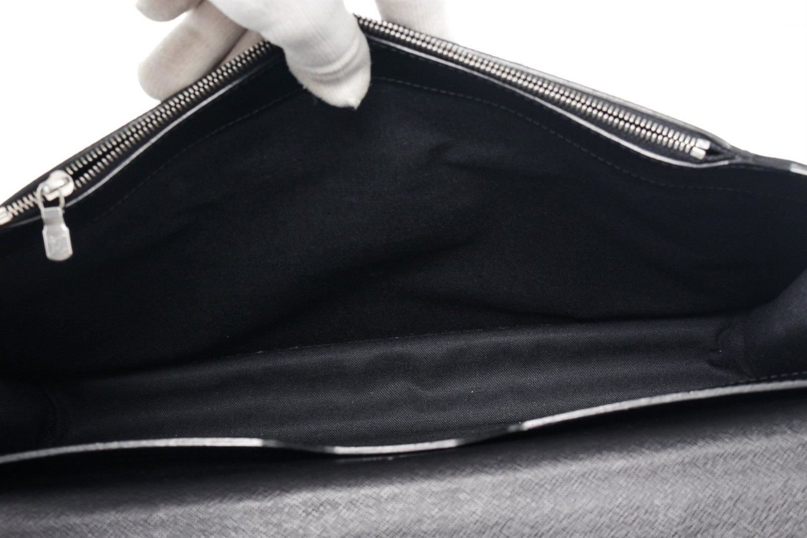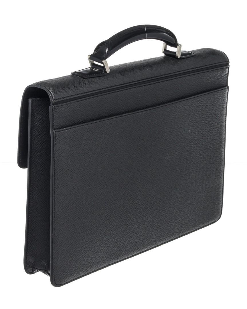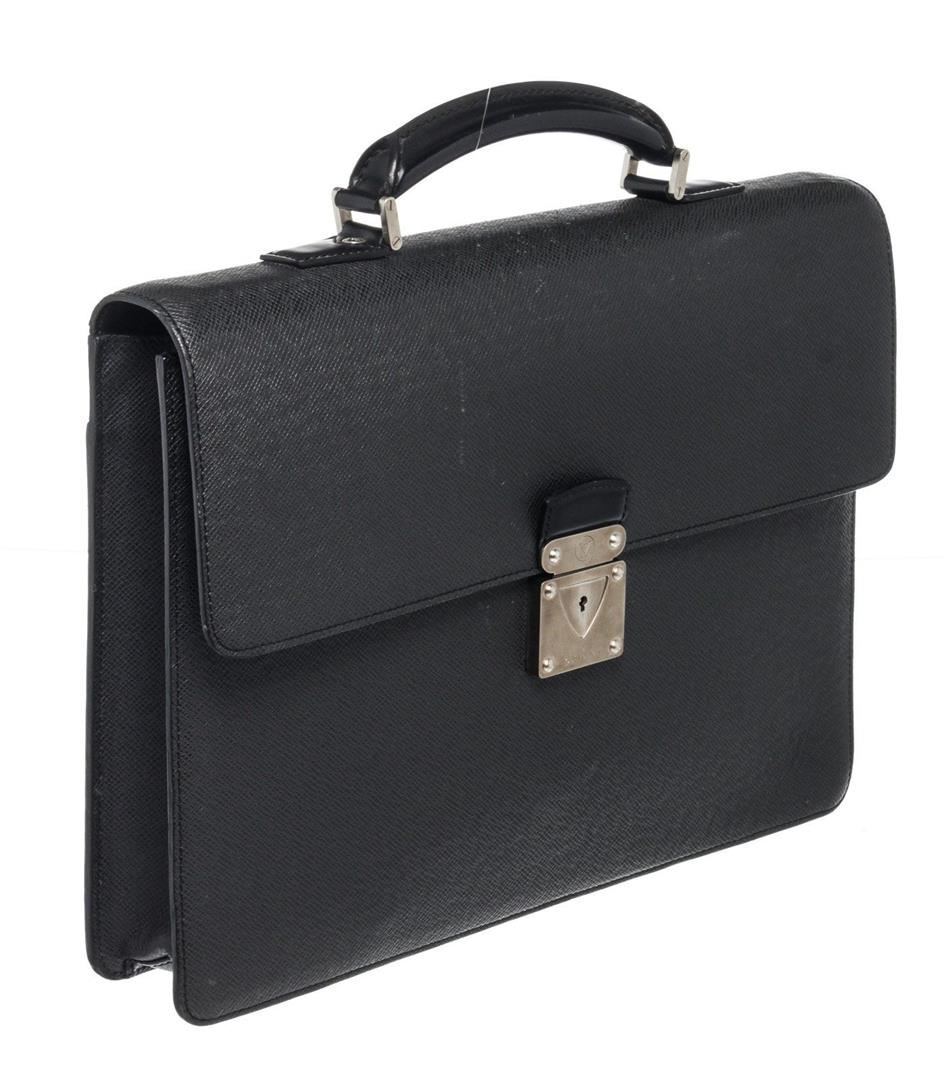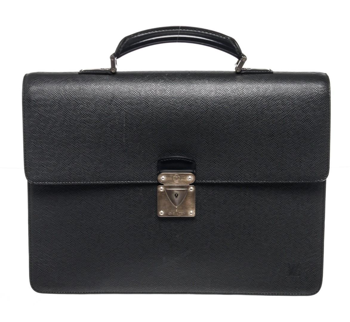 Louis Vuitton Black Leather Moskova Briefcase Bag with leather, gold ton hardware, tan vachetta leather trim, interior slip zip pockets, leather lining, top handle and push lock closures