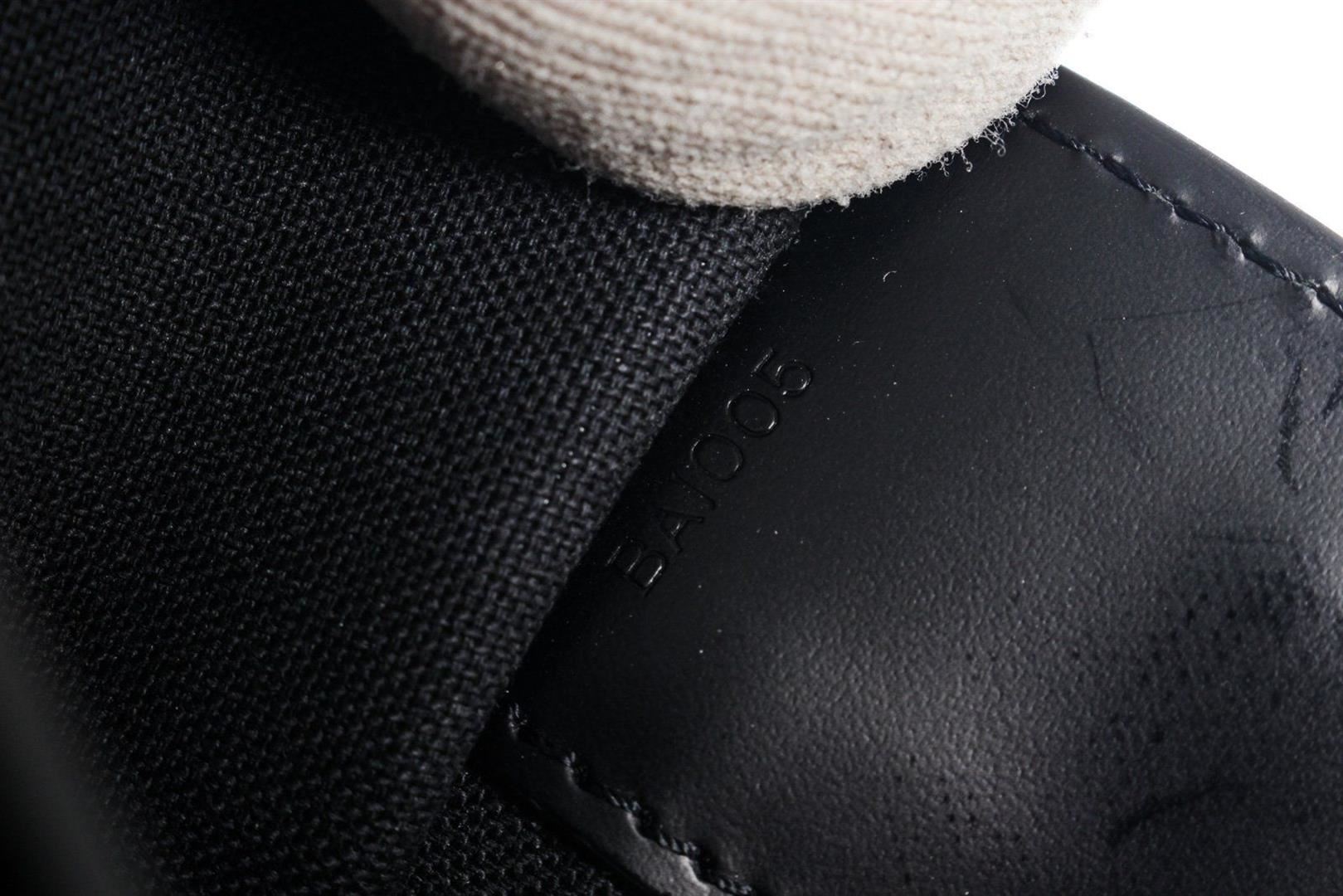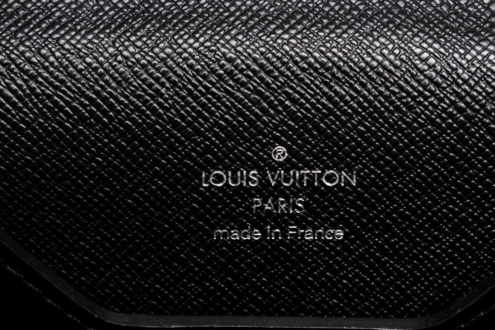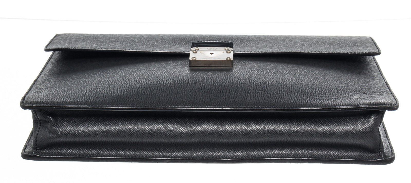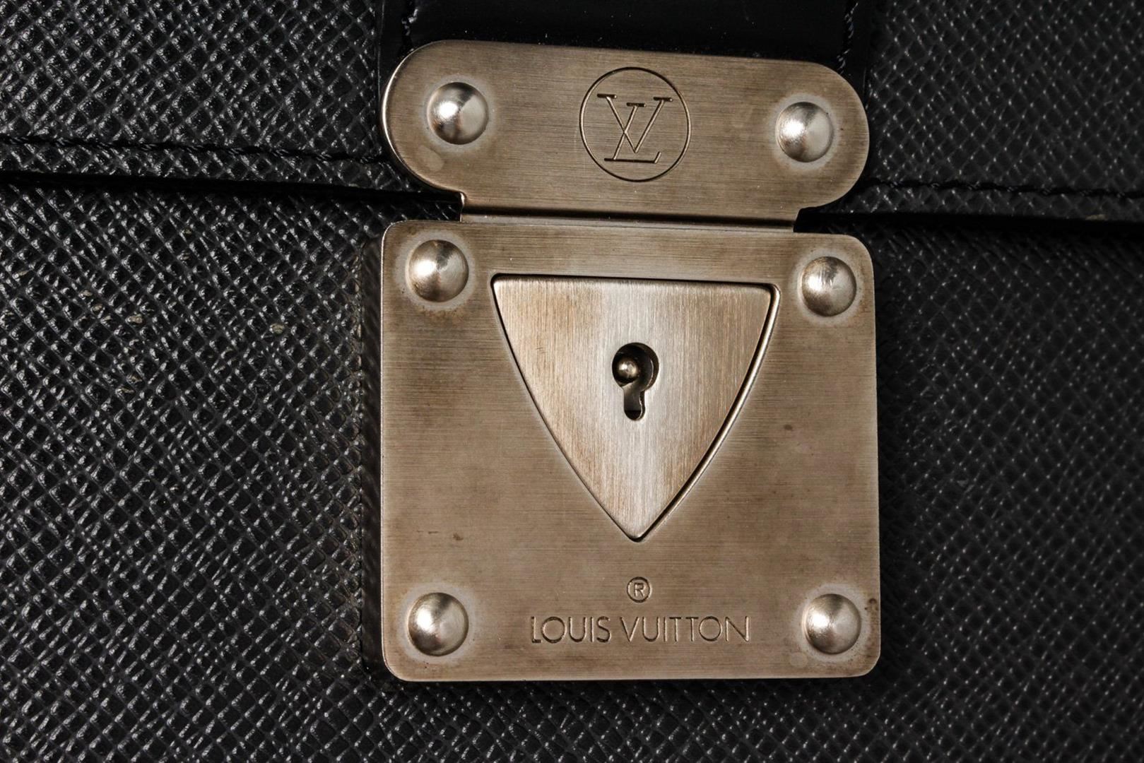 Louis Vuitton Black Leather Moskova Briefcase Bag with leather, gold ton hardware, tan vachetta leather trim, interior slip zip pockets, leather lining, top handle and push lock closures