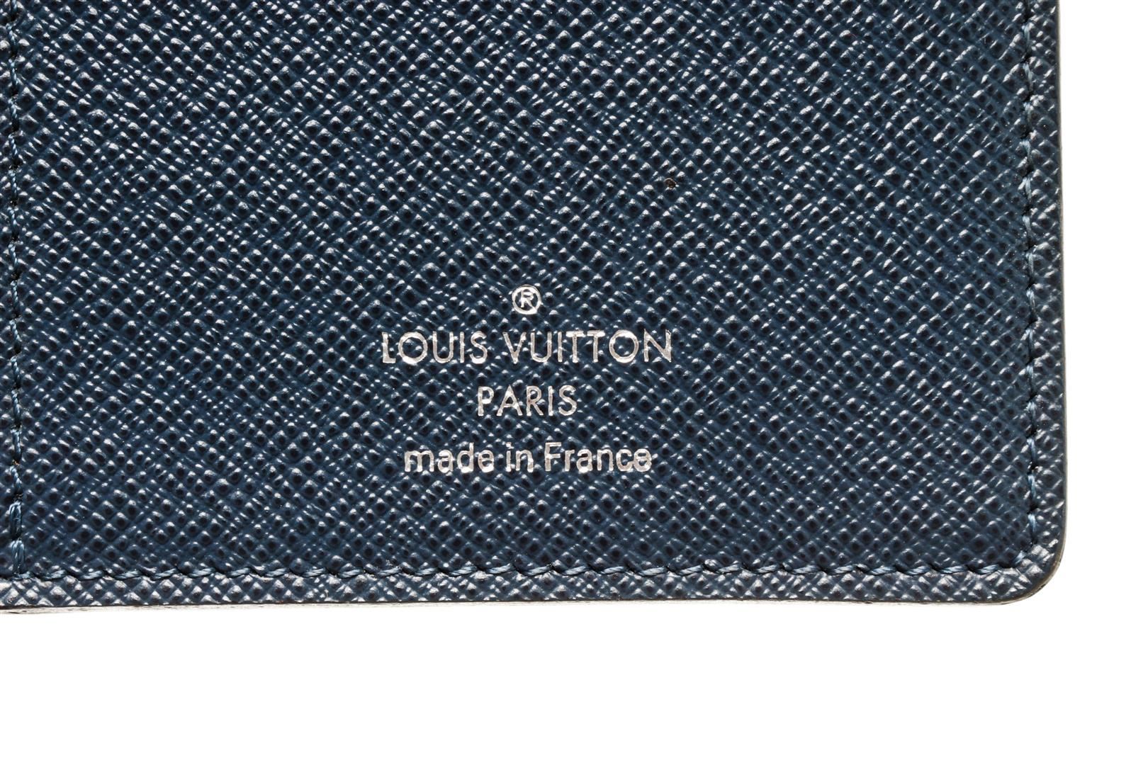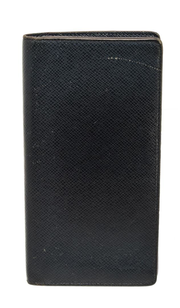 One Louis Vuitton Black Leather Portefeiulle Ron Bifold Wallet. Item is sold AS-IS. All available information is listed in the description and shown in the photo. Louis Vuitton black leather Portefeiulle Ron bifold wallet with black leather exterior, an LV logo embossed on the bottom right corner, blue leather inside, several compartments, and multiple card slots. There are markings and scratches on the exterior leather. Please refer to photos. 3.54"L x 7.48"W x 0.78"H / 8.99 x 18.9 x 1.98 cm