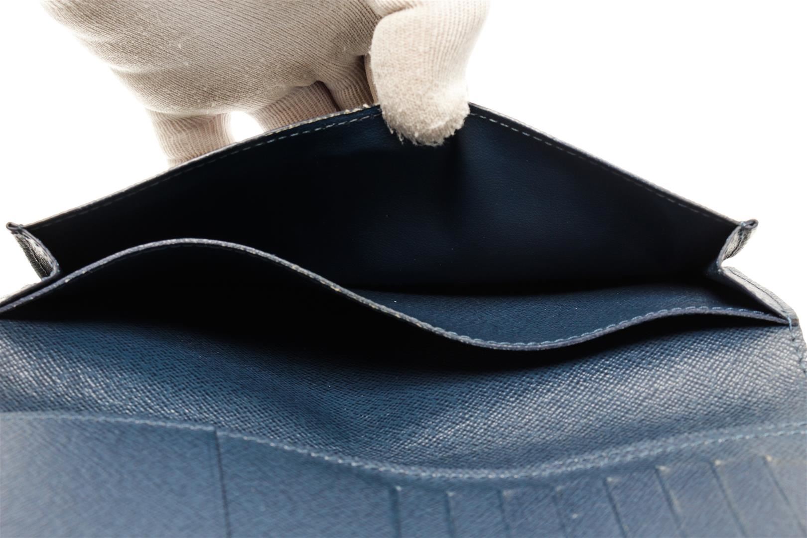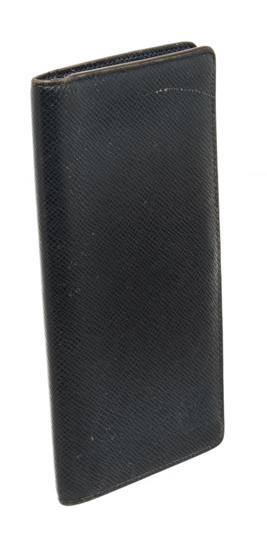 One Louis Vuitton Black Leather Portefeiulle Ron Bifold Wallet. Item is sold AS-IS. All available information is listed in the description and shown in the photo. Louis Vuitton black leather Portefeiulle Ron bifold wallet with black leather exterior, an LV logo embossed on the bottom right corner, blue leather inside, several compartments, and multiple card slots. There are markings and scratches on the exterior leather. Please refer to photos. 3.54"L x 7.48"W x 0.78"H / 8.99 x 18.9 x 1.98 cm
