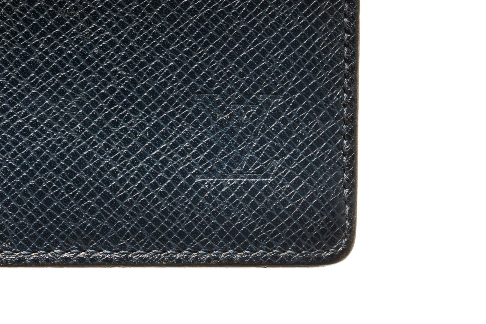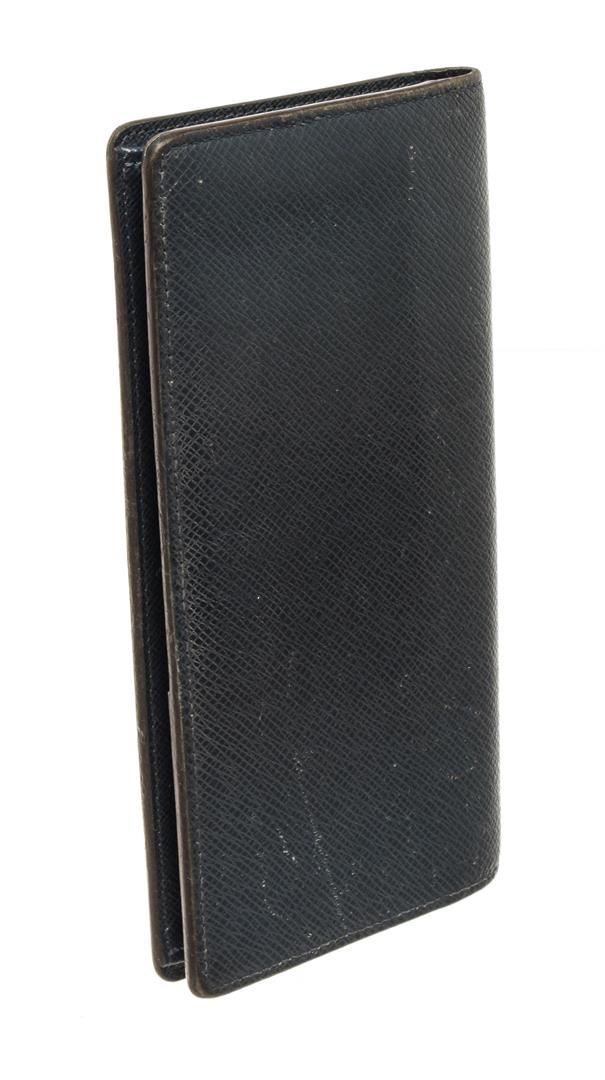 One Louis Vuitton Black Leather Portefeiulle Ron Bifold Wallet. Item is sold AS-IS. All available information is listed in the description and shown in the photo. Louis Vuitton black leather Portefeiulle Ron bifold wallet with black leather exterior, an LV logo embossed on the bottom right corner, blue leather inside, several compartments, and multiple card slots. There are markings and scratches on the exterior leather. Please refer to photos. 3.54"L x 7.48"W x 0.78"H / 8.99 x 18.9 x 1.98 cm