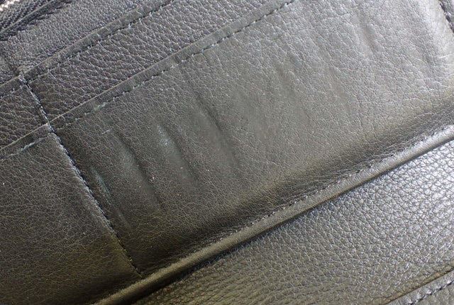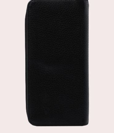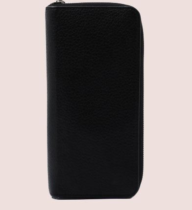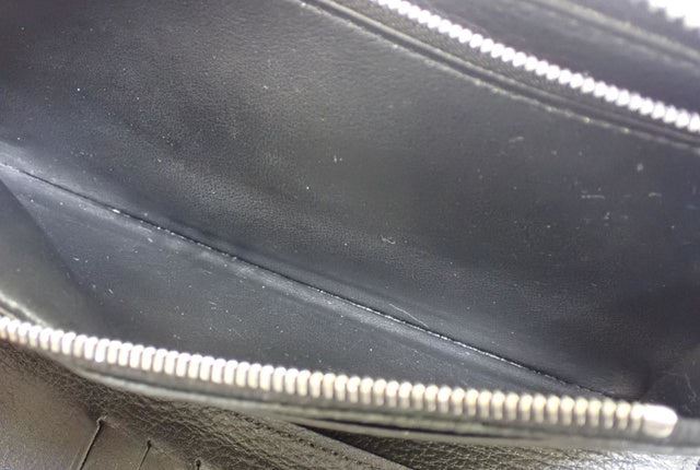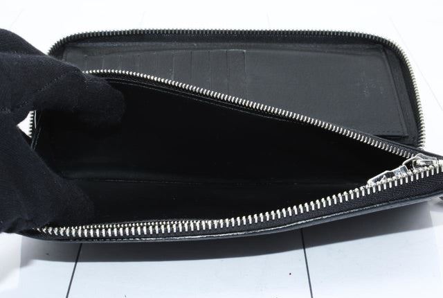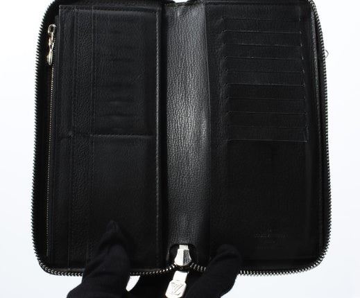 Black leather Louis Vuitton Vertical Zippy wallet with silver-tone hardware, black leather lining interior pockets with card slots and exposed zip-around closure. Height 4" Width: 8" Depth: 1"