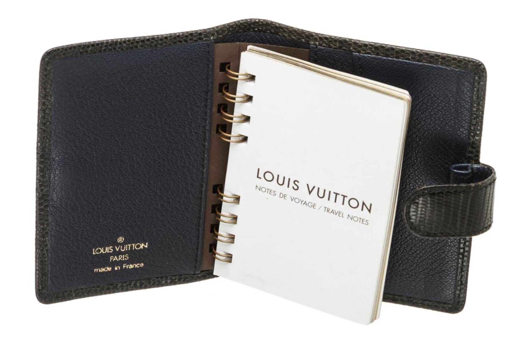 One Louis Vuitton Black Lizard Mini Agenda Notes de Voyage Travel Notes. Louis Vuitton black lizard blank note pad with card slot and snap closure. MKR