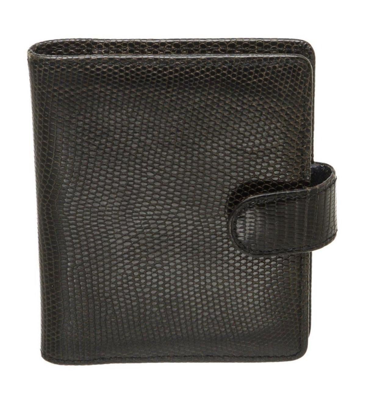 Louis Vuitton black lizard blank note pad with card slot and snap closure. Measurements: Length: 3.25 in / 8 cm Width: 0.5 in / 1 cm 4.25 in / 11 cmCONDITION: Pre-Owned Good overall, please see photographs for detail.