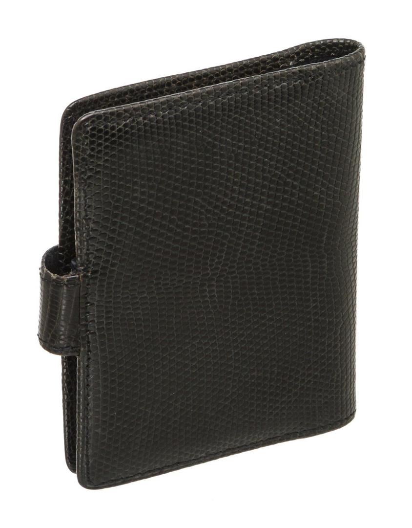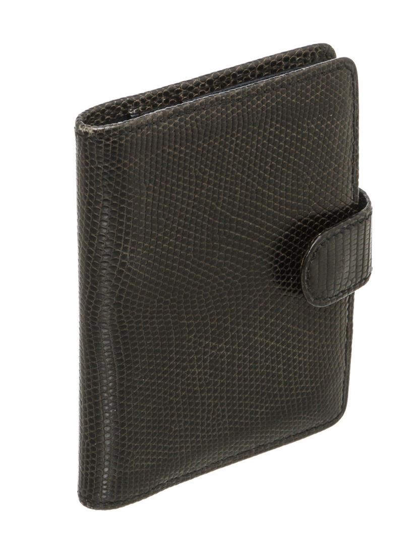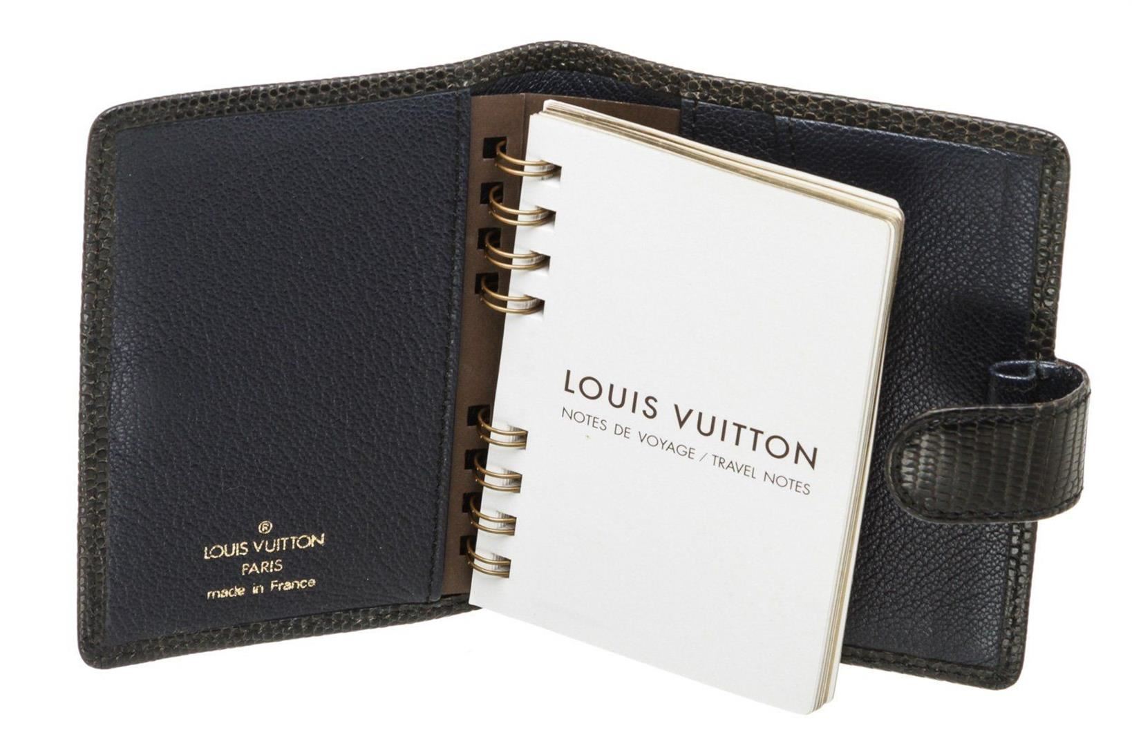 Louis Vuitton black lizard blank note pad with card slot and snap closure.