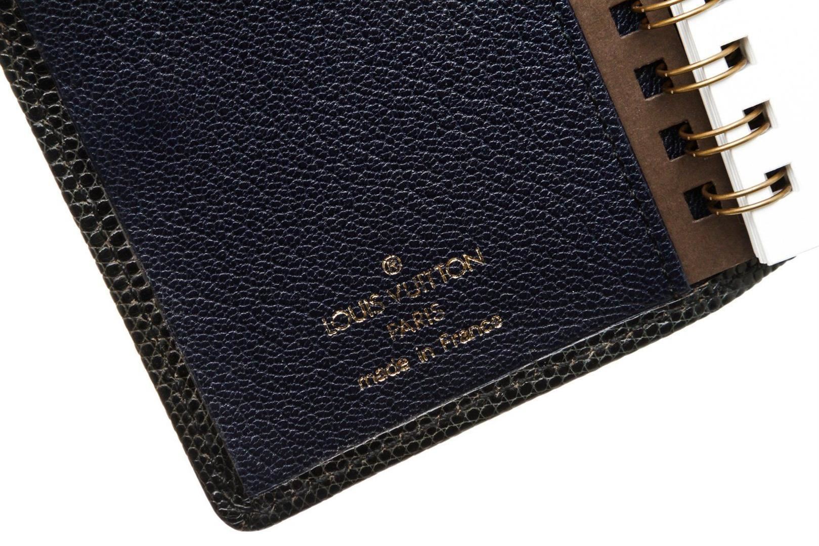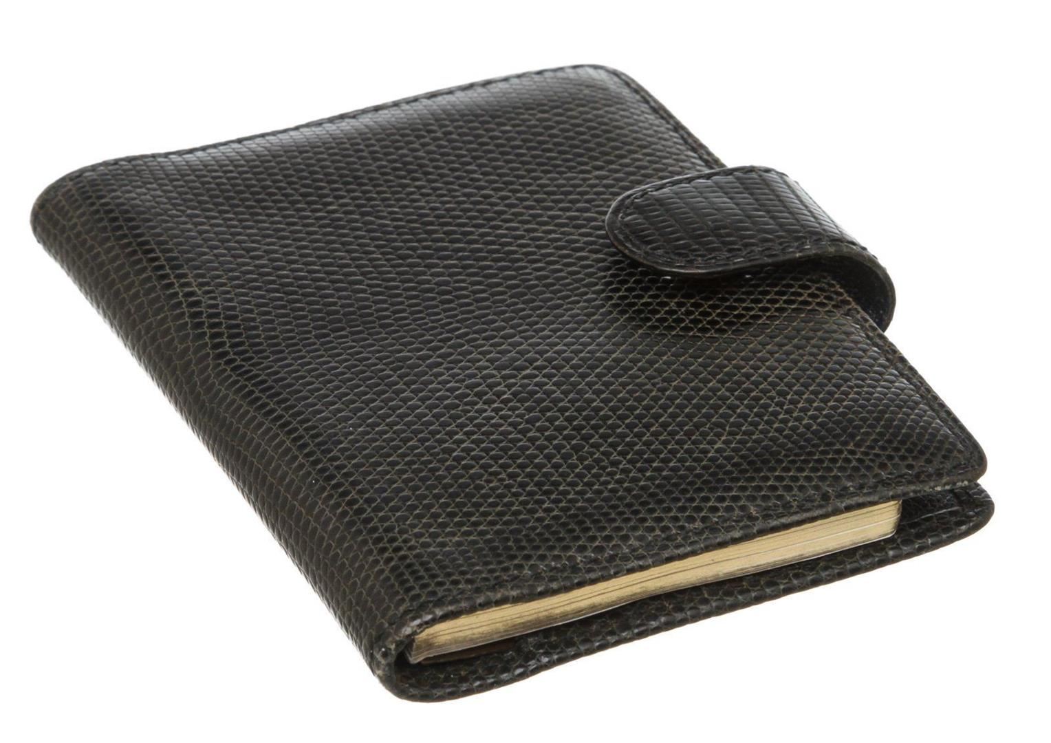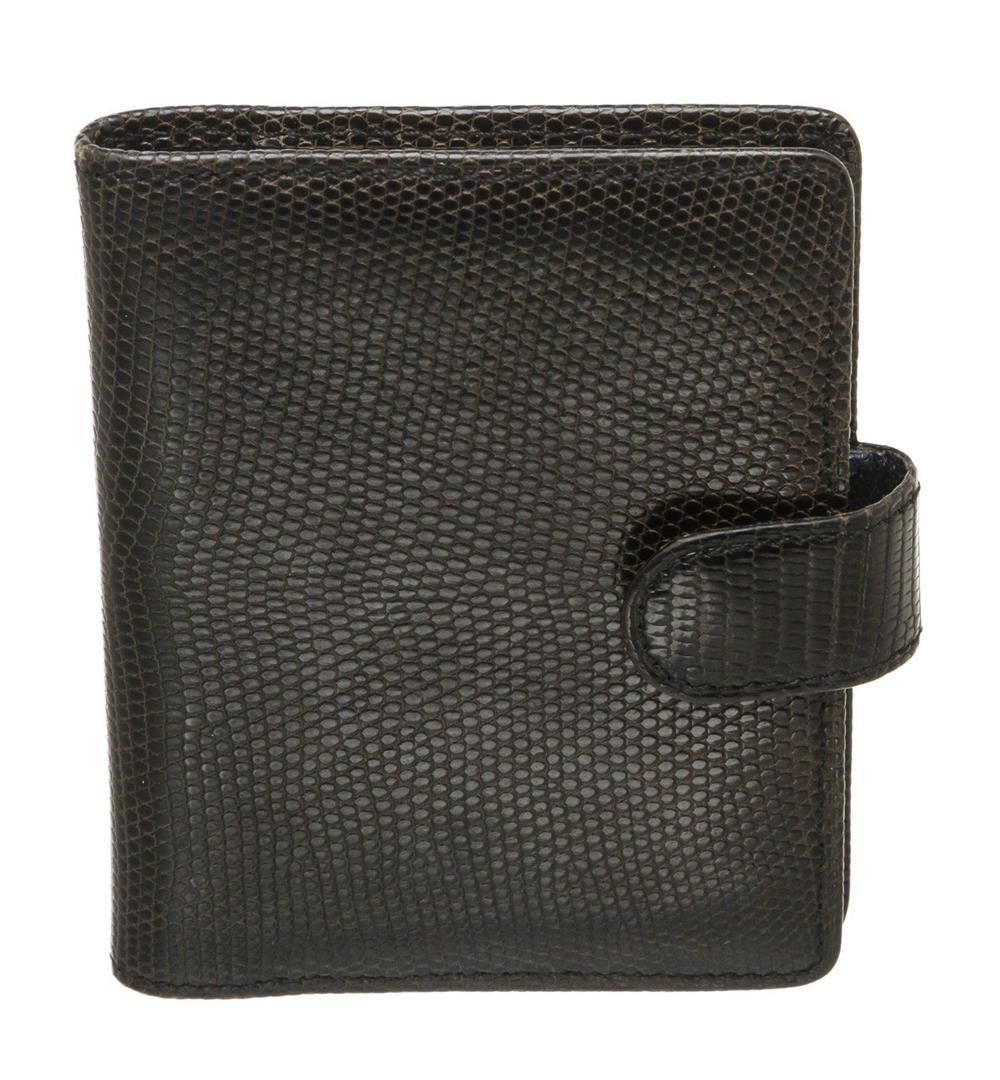 Louis Vuitton black lizard blank note pad with card slot and snap closure.