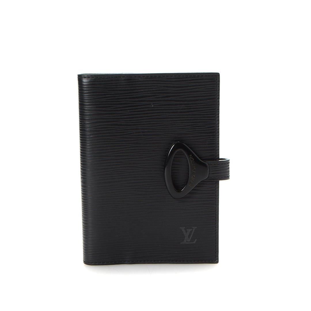 Louis Vuitton Black Monogram Agenda PM Wallet with gold-tone hardware, tan vachetta leather trim, snap closure. Measurements: Length: 17.2 in / 44 cm Width: 5 in / 13 cm 14.1 in / 36 cmCONDITION: Pre-Owned Good overall, please see photographs for detail.
