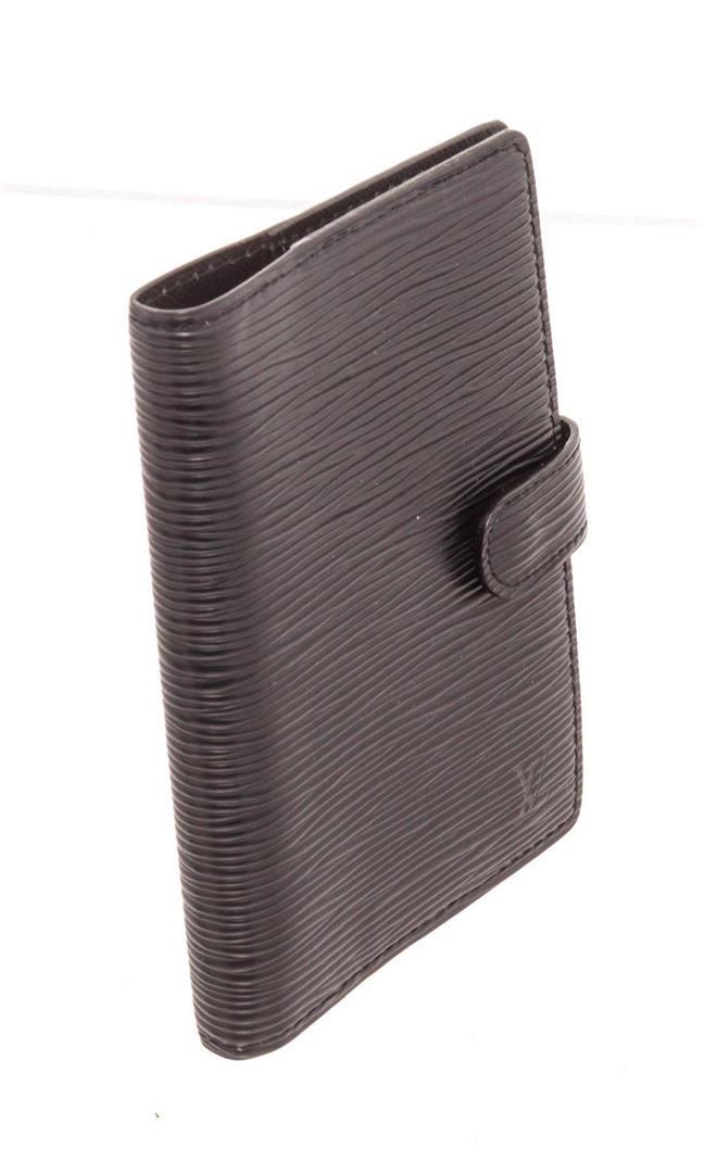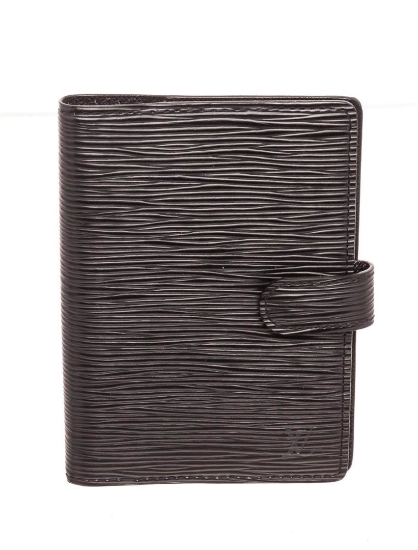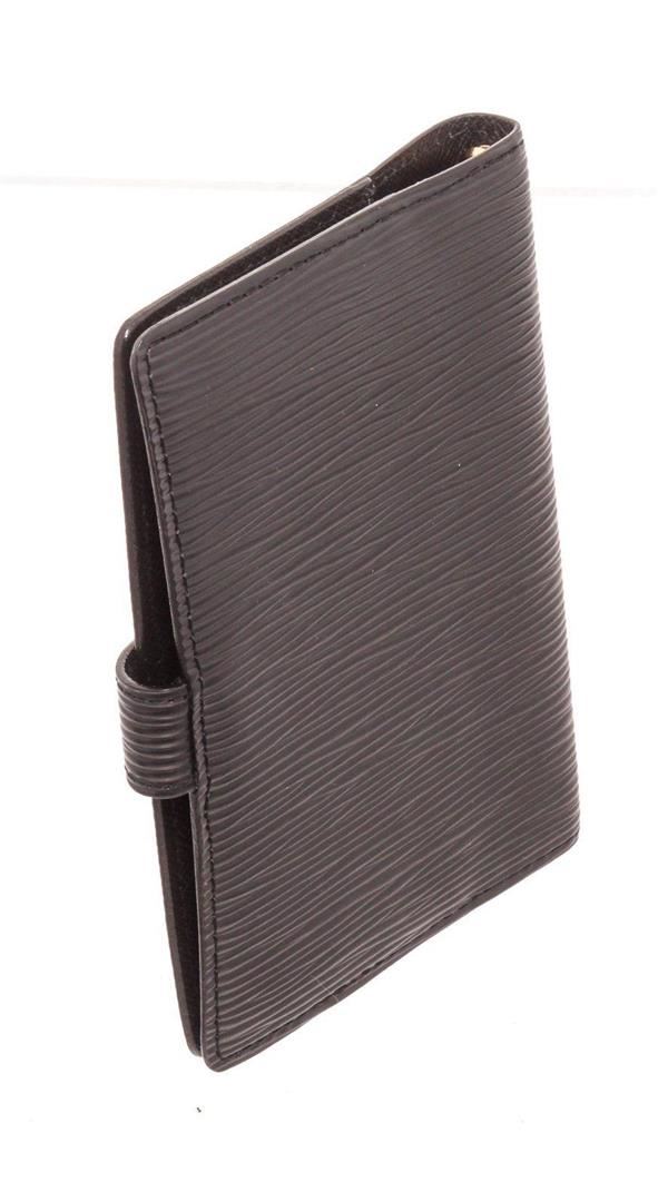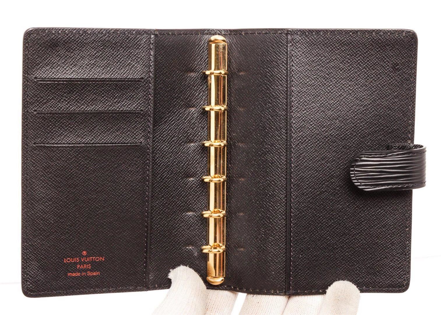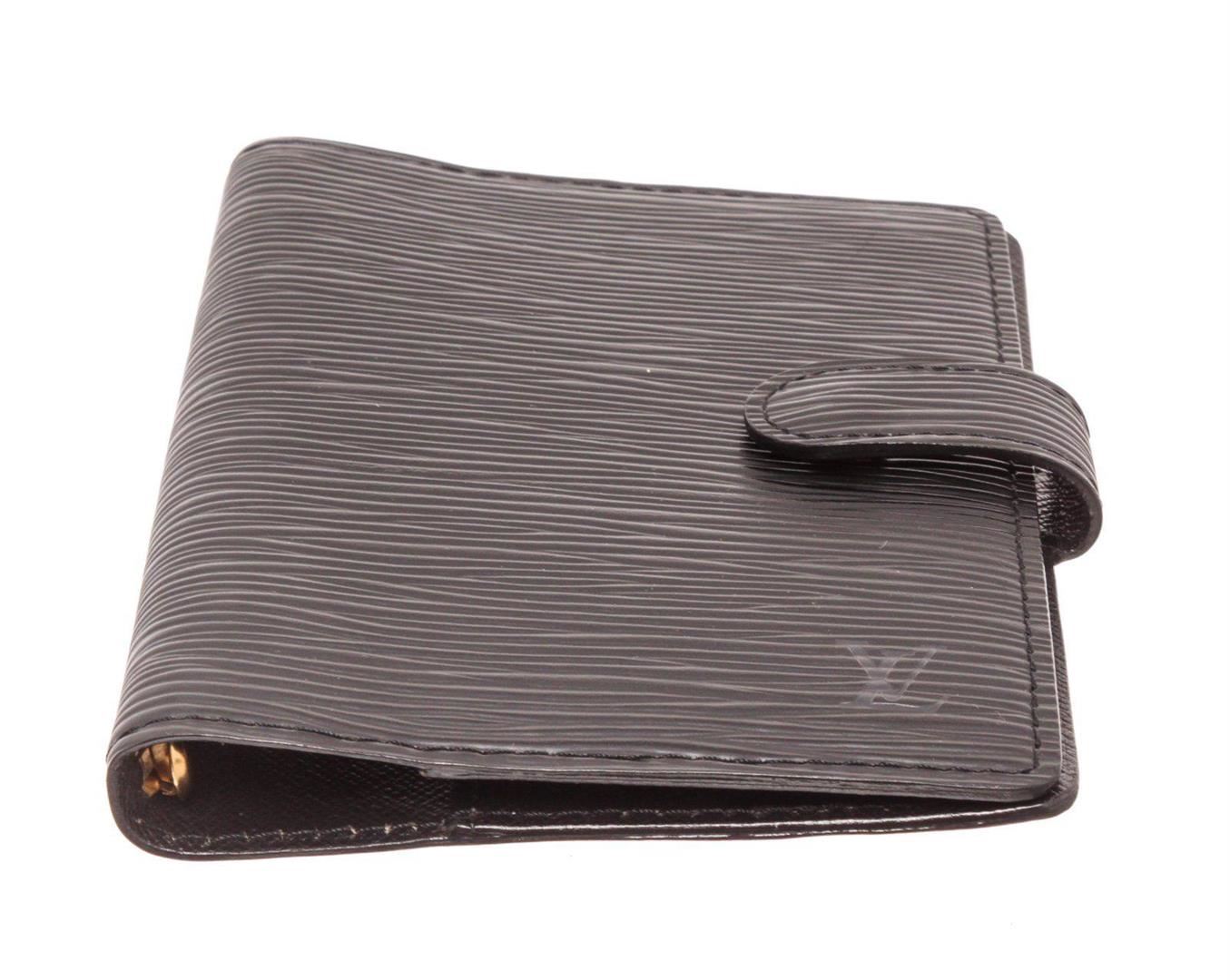 Louis Vuitton Black Monogram Agenda PM Wallet with gold-tone hardware, monogram material, tan vachetta leather trim, and flap closure. Condition: Pre-Owned Good overall, please see photographs for detail.