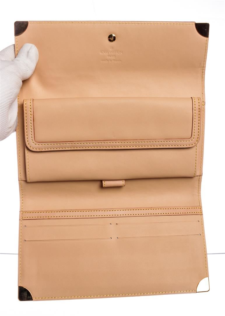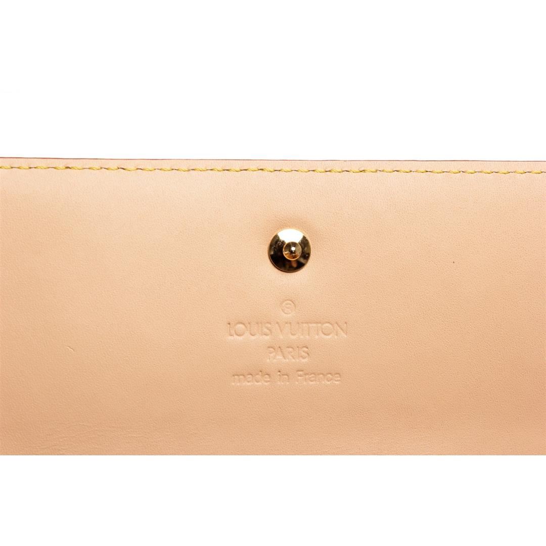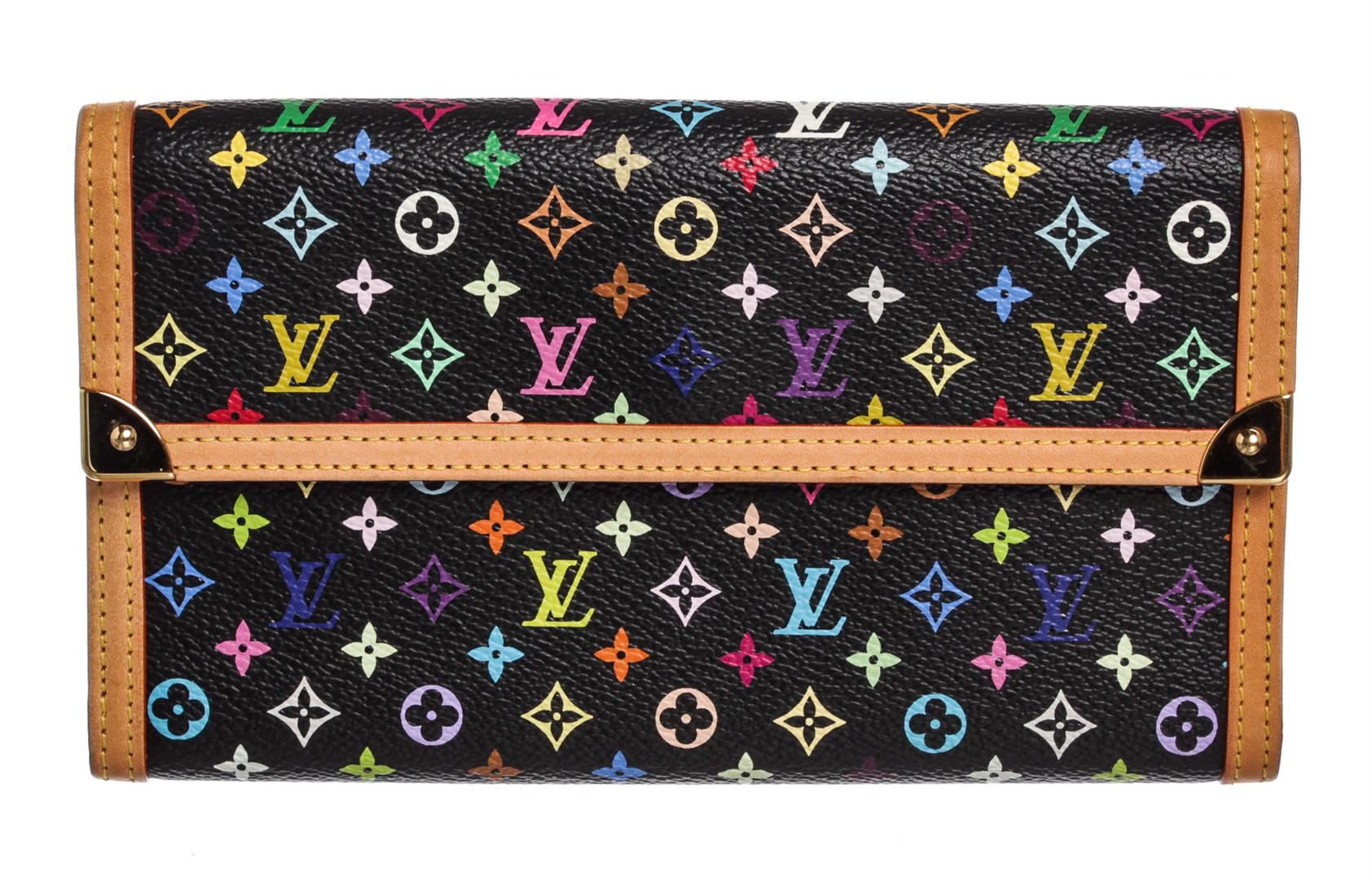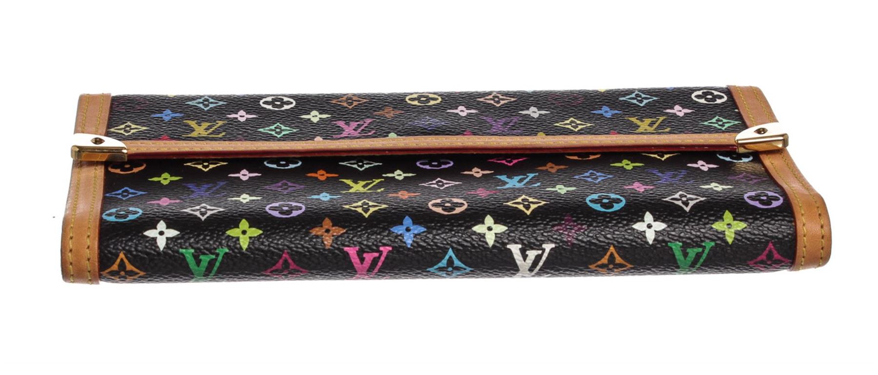 Black multicolore monogram coated canvas Louis Vuitton Porte Tresor wallet with brass hardware, tan vachetta leather trim, tan leather interior lining, four card slots, two bill compartments, single change compartment with snap closure and snap closure at front. Authentic.