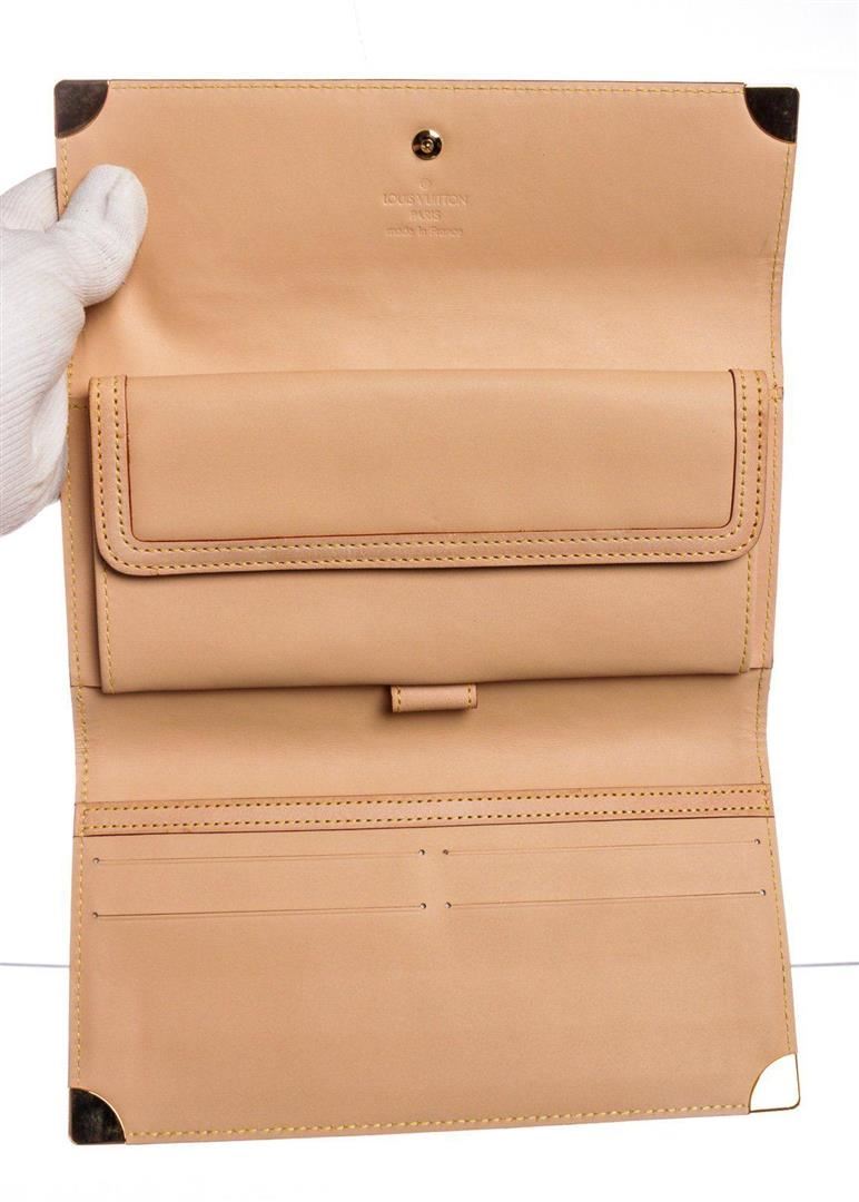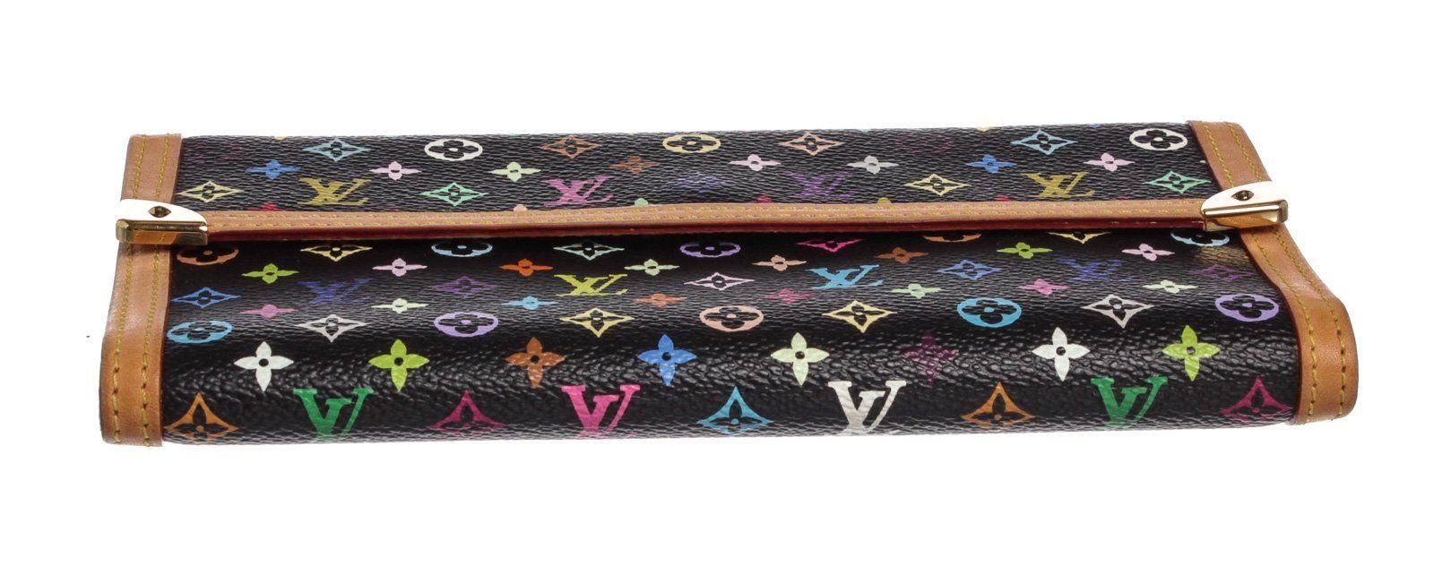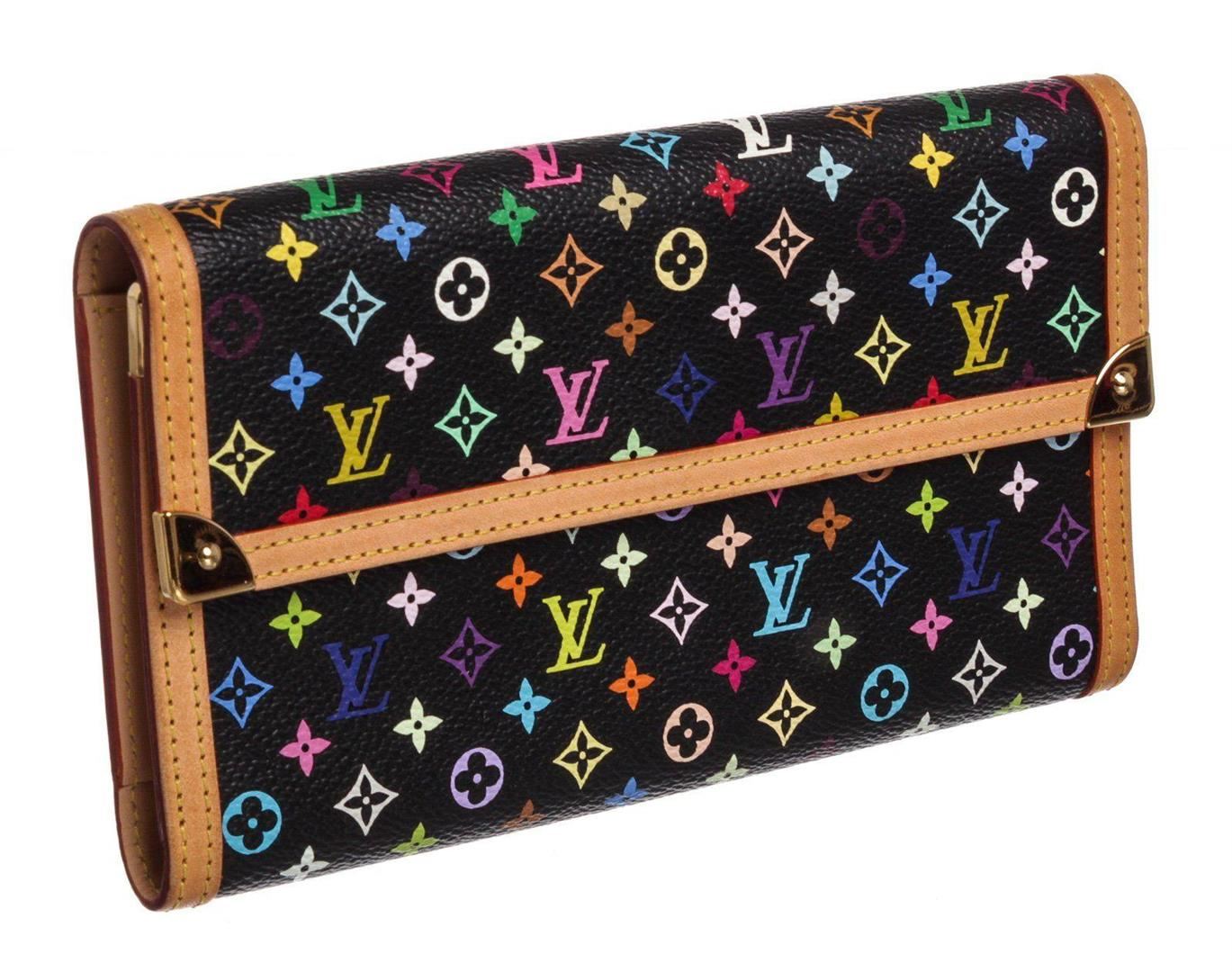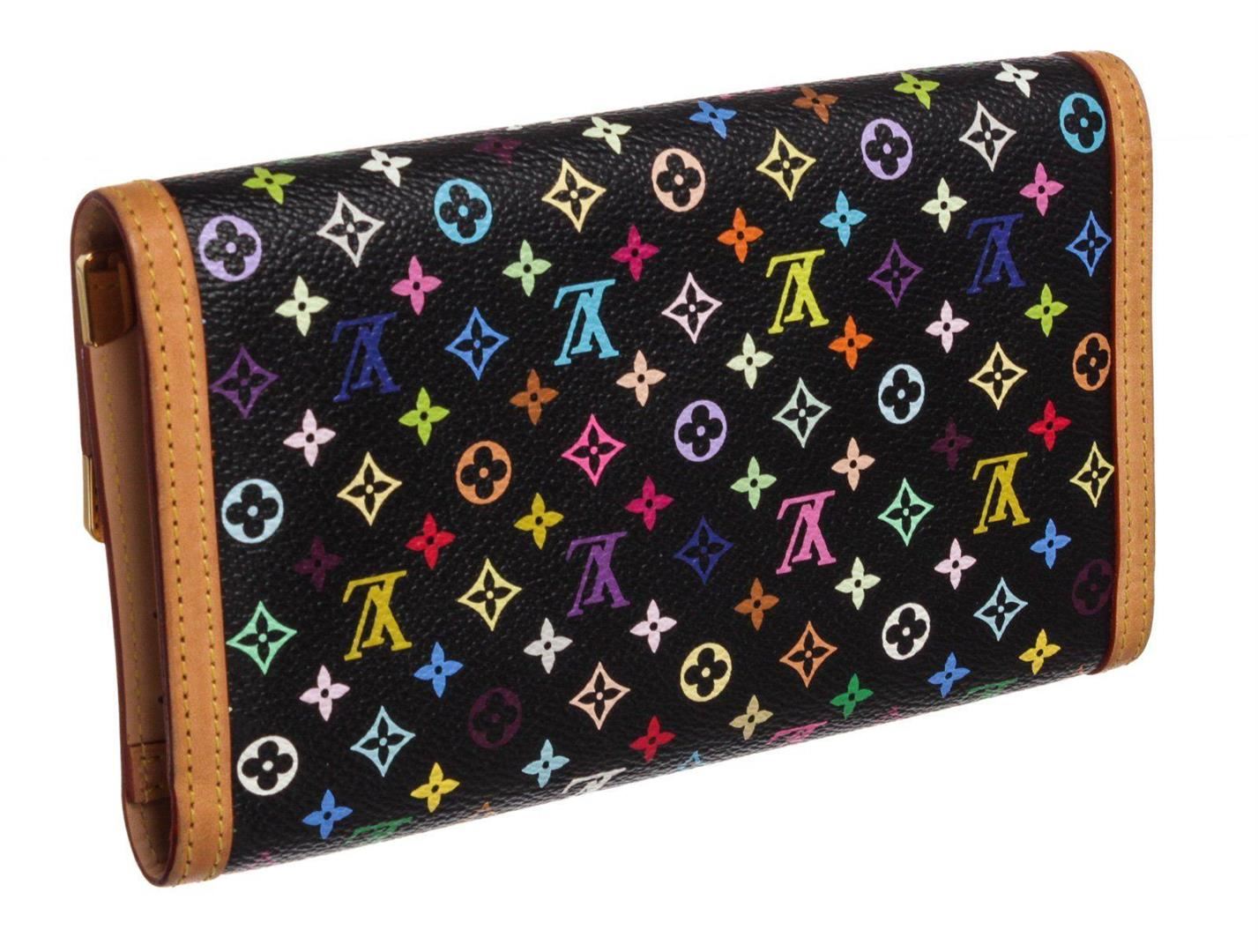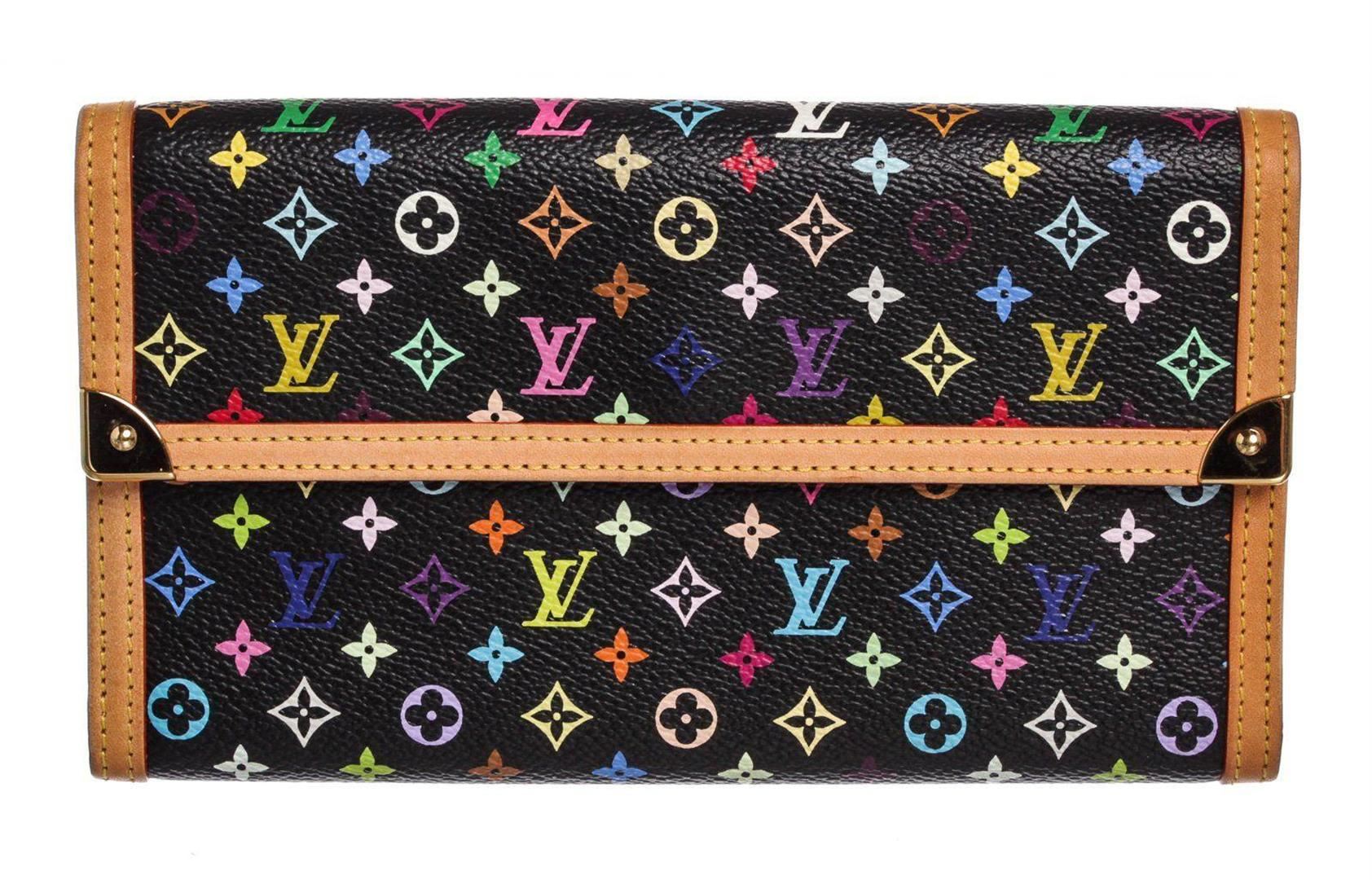 Black multicolored monogram coated canvas Louis Vuitton Porte Tresor wallet with brass hardware, tan vachetta leather trim, tan leather interior lining, four card slots, two bill compartments, single change compartment with snap closure and snap closure at front. Measurements: Length 7.5 in / 19 cm Width 1 in / 3 cm Height 4 in / 10 cm Condition: Pre-Owned Good overall, please see photographs for detail.