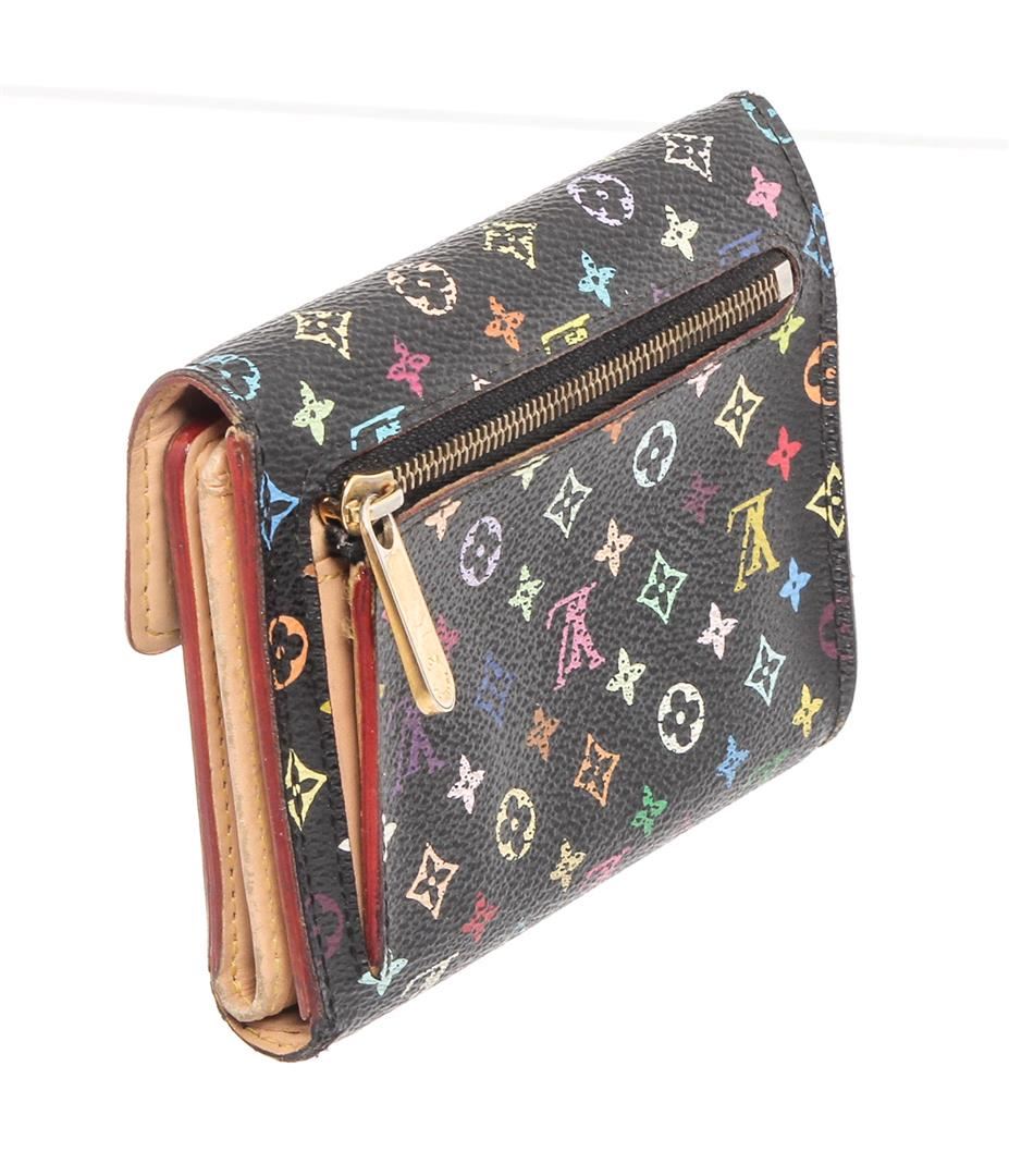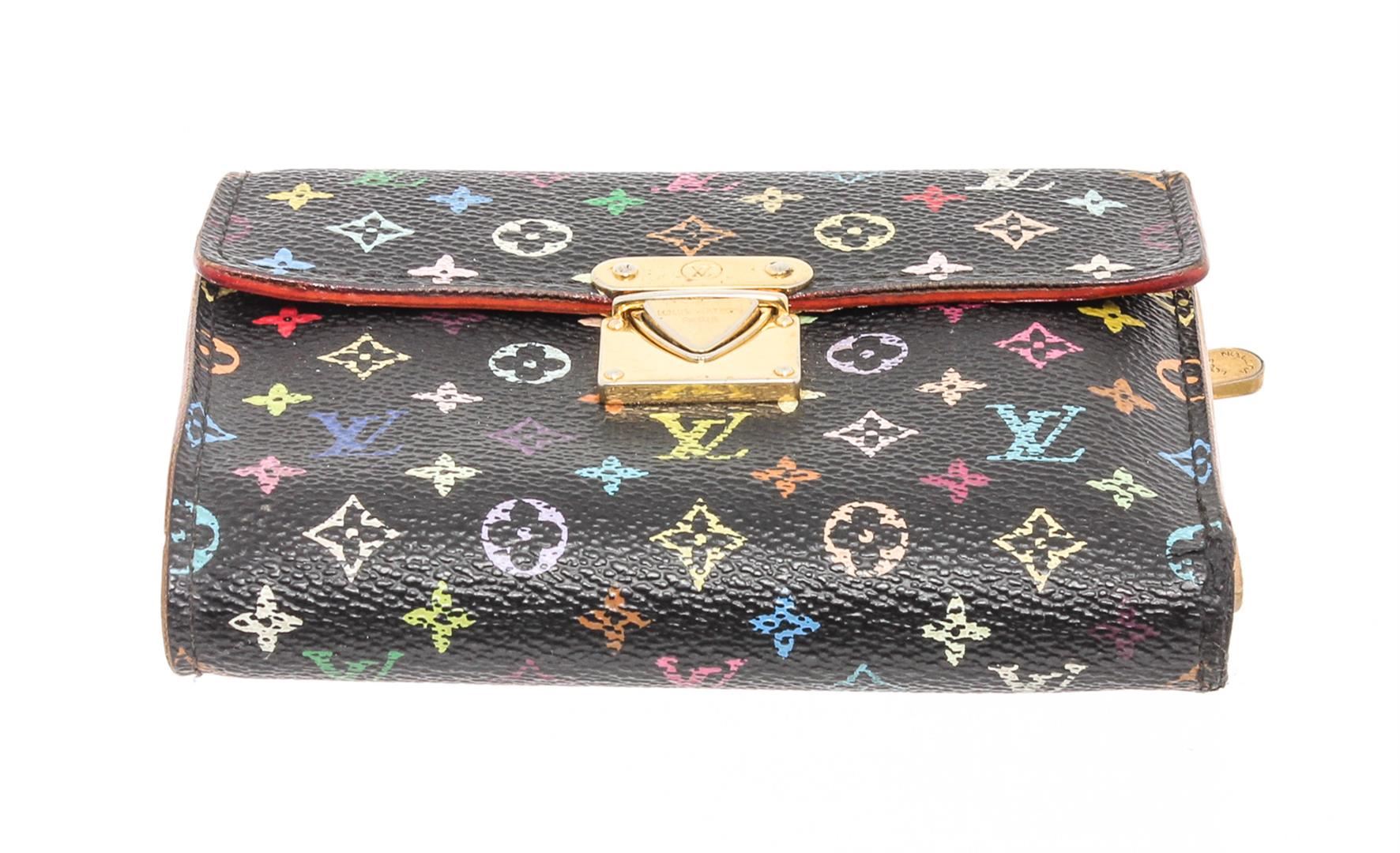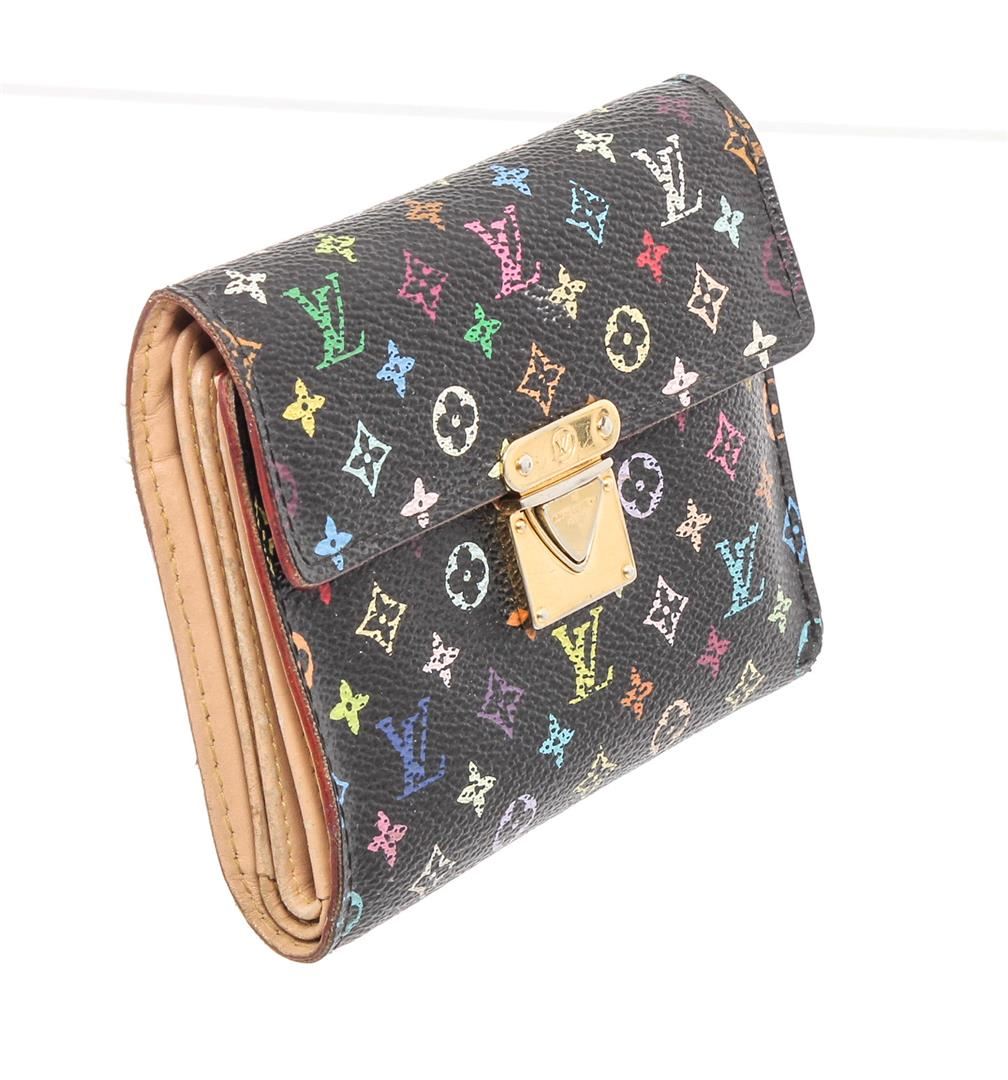 Black and multicolore monogram coated canvas Louis Vuitton Koala wallet with brass hardware, zip pocket at back, tan vachetta leather lining, single bill compartment, nine card slots at interior walls, single ID window and push-lock closure at front flap.