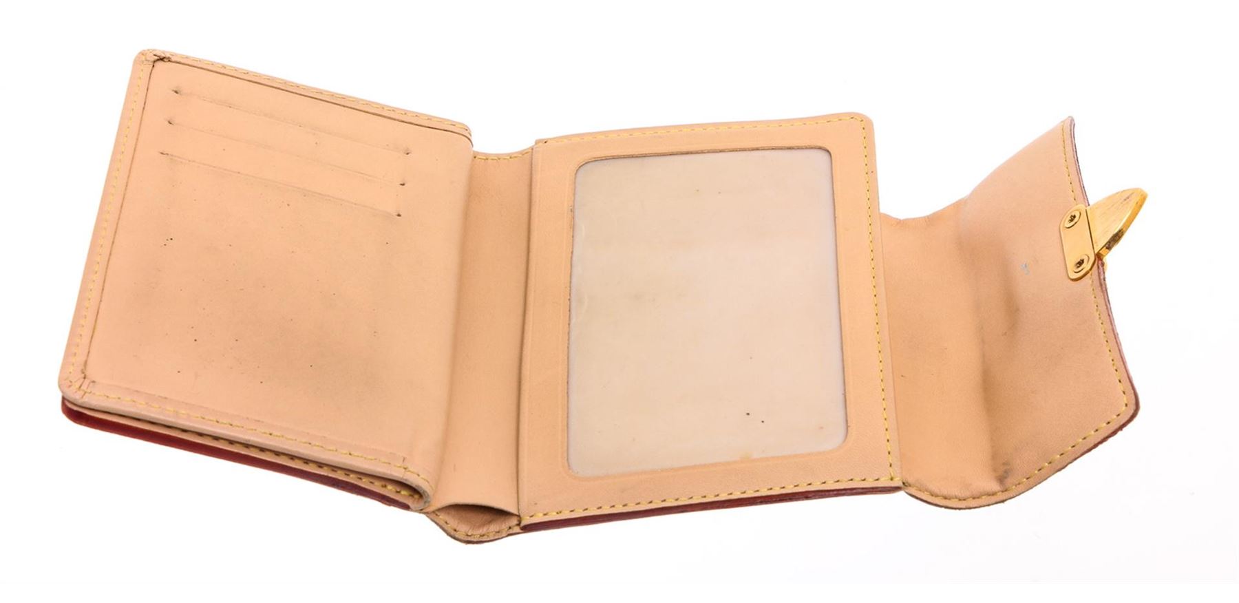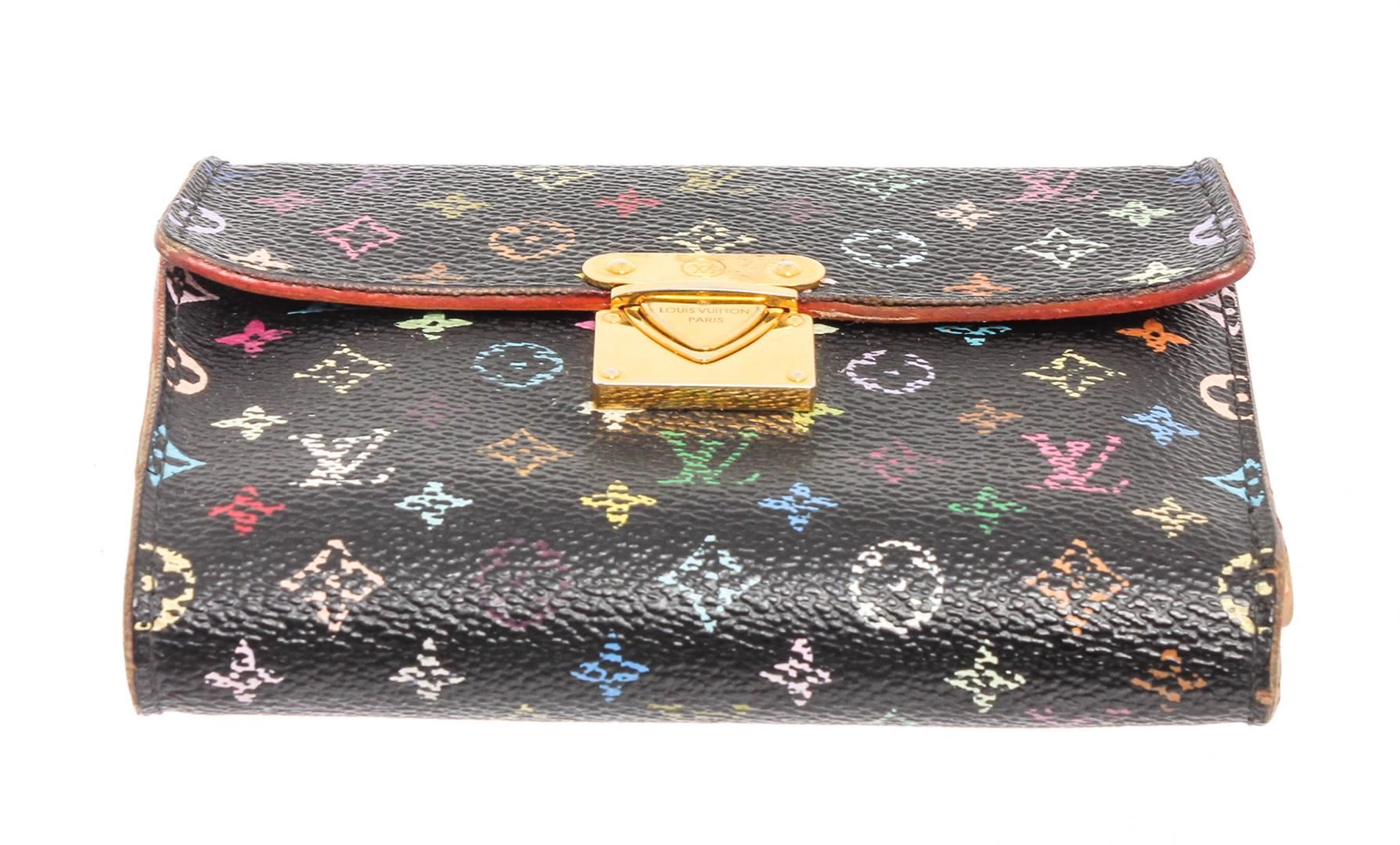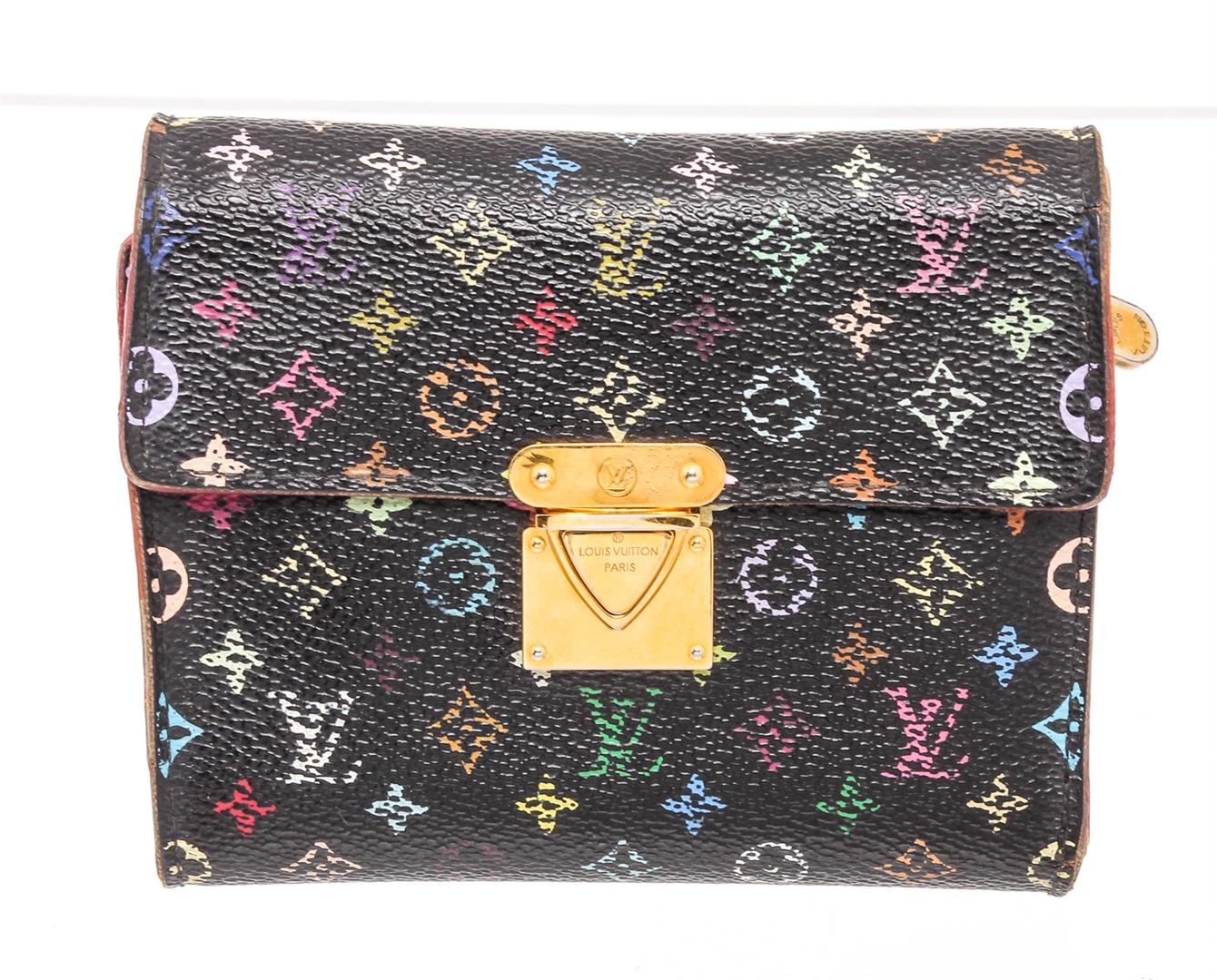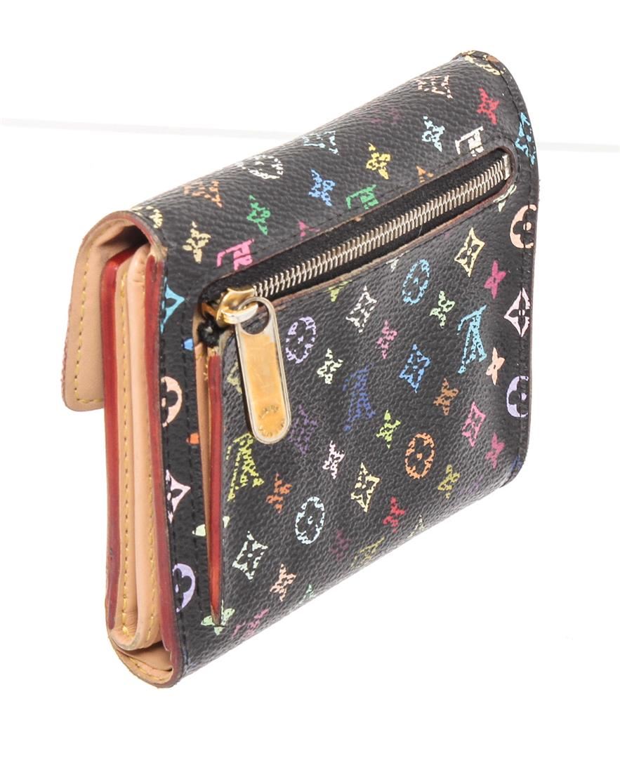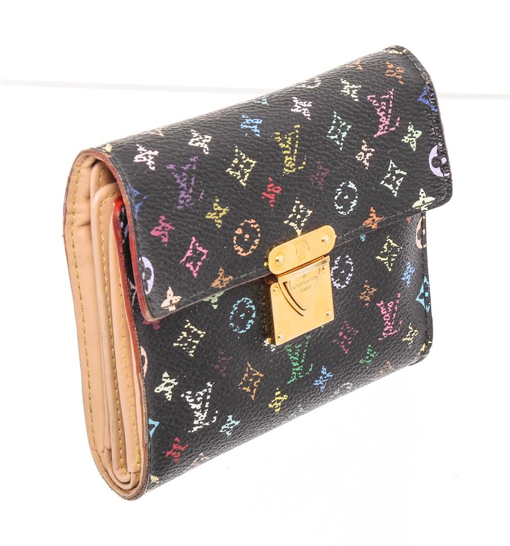 Black and multicolore monogram coated canvas Louis Vuitton Koala wallet with brass hardware, zip pocket at back, tan vachetta leather lining, single bill compartment, nine card slots at interior walls, single ID window and push-lock closure at front flap.