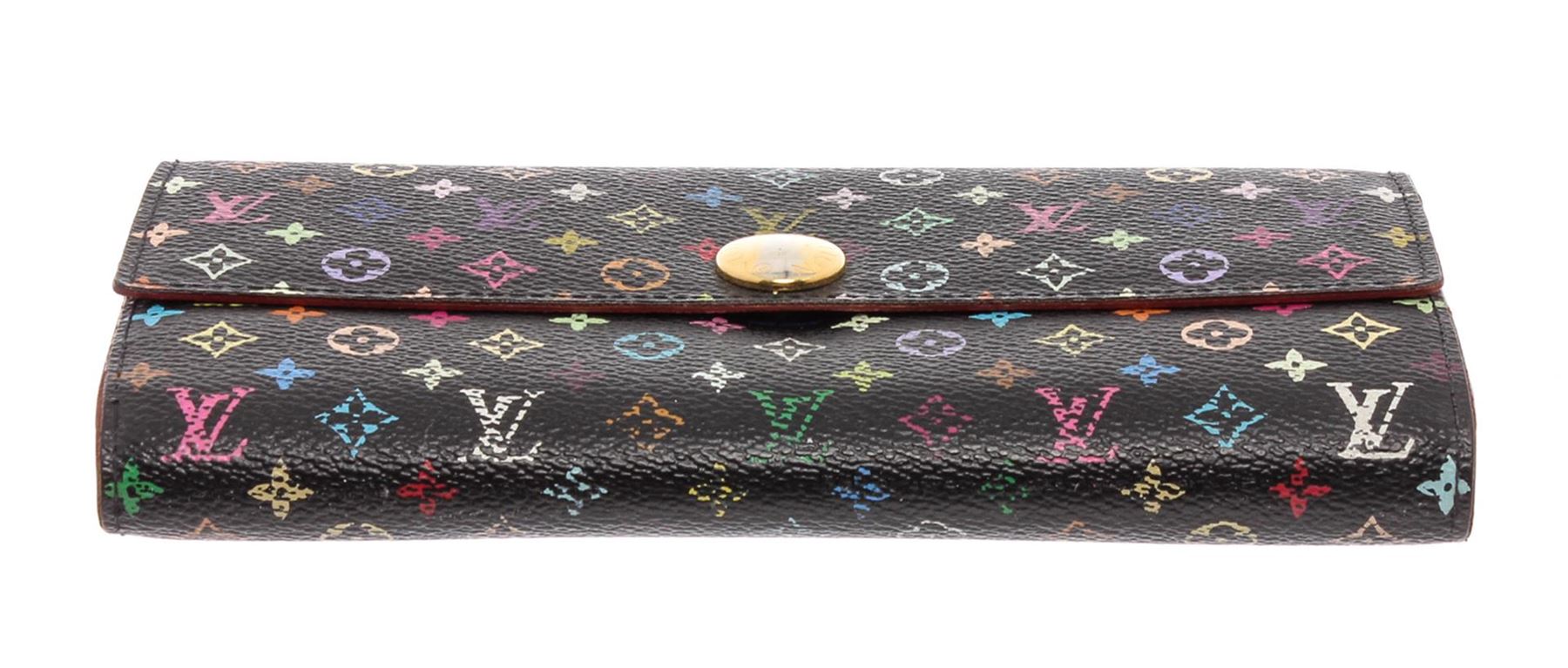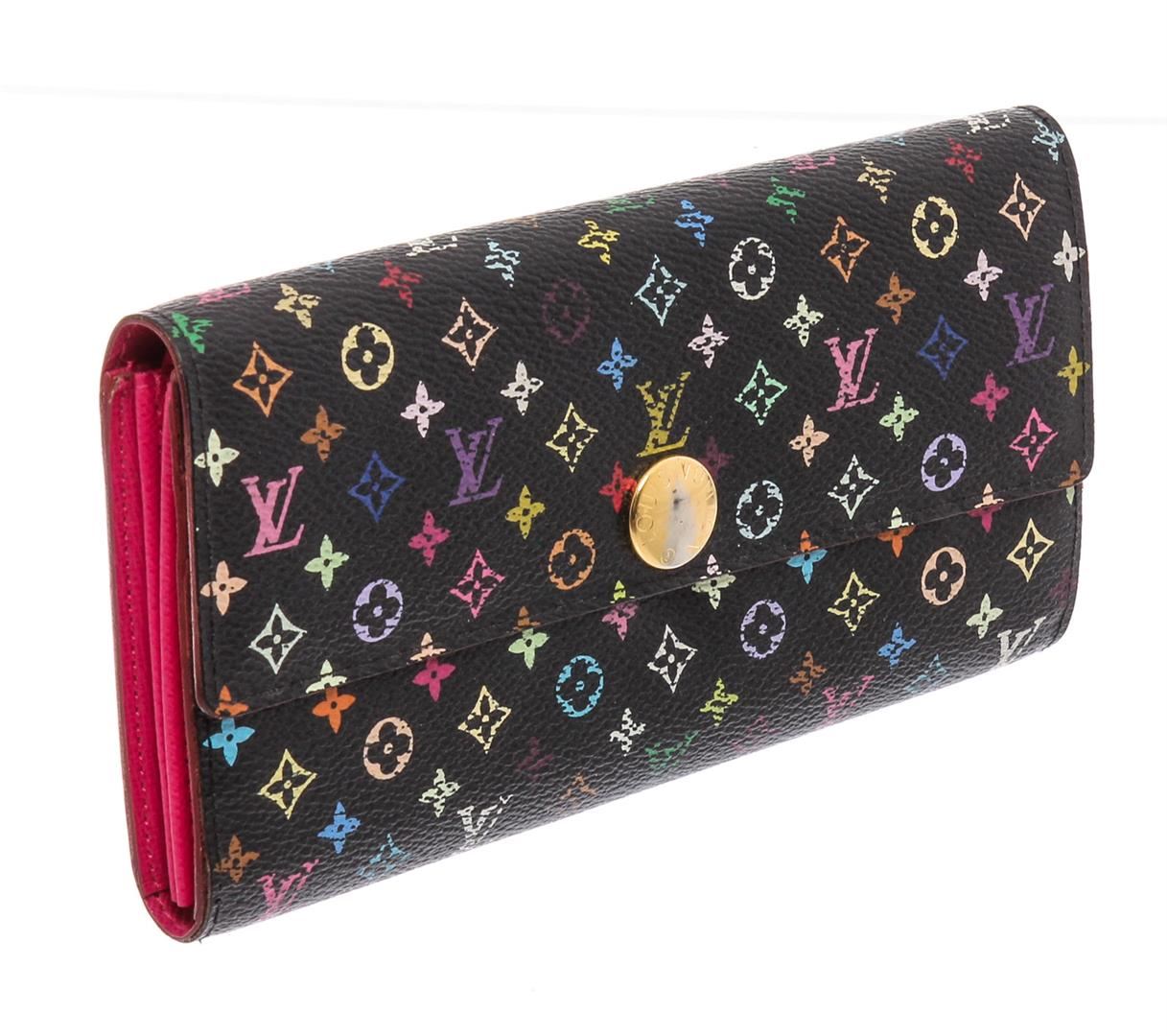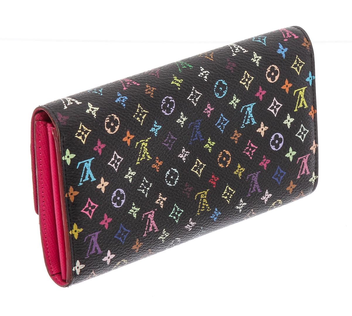 Black and Multicolore monogram coated canvas Louis Vuitton Sarah wallet with brass hardware, four card slots at flap underside, four interior compartments; one with zip closure, pink leather lining, six card slots and snap closure at front flap.