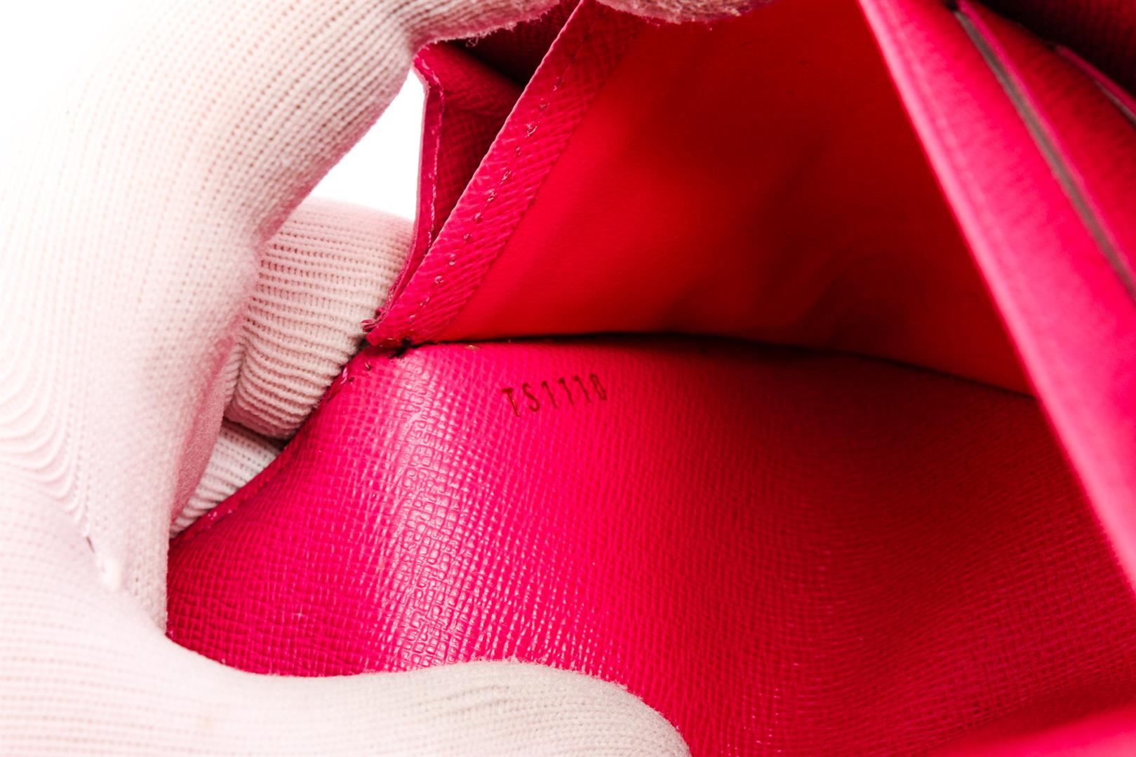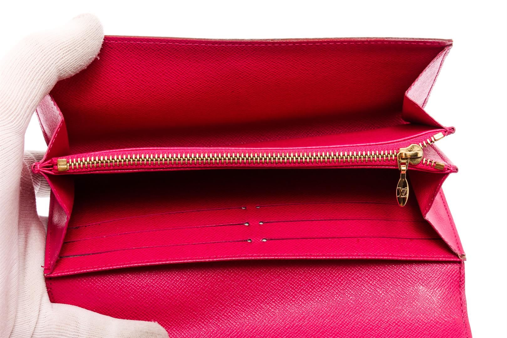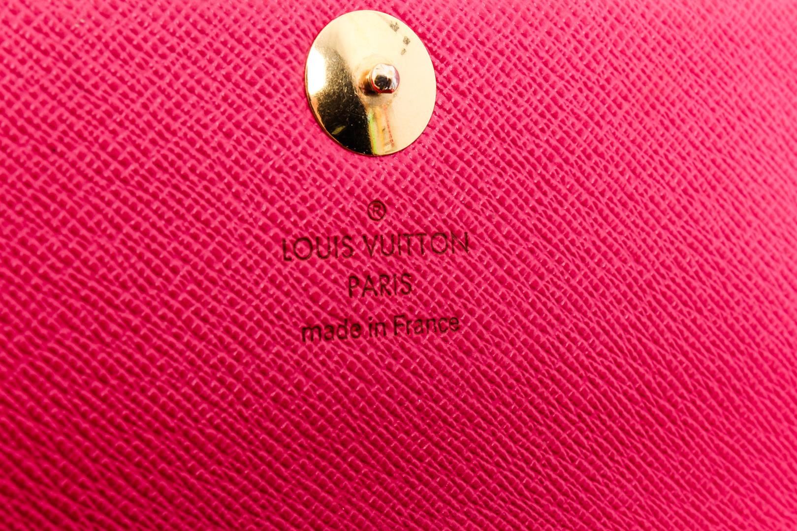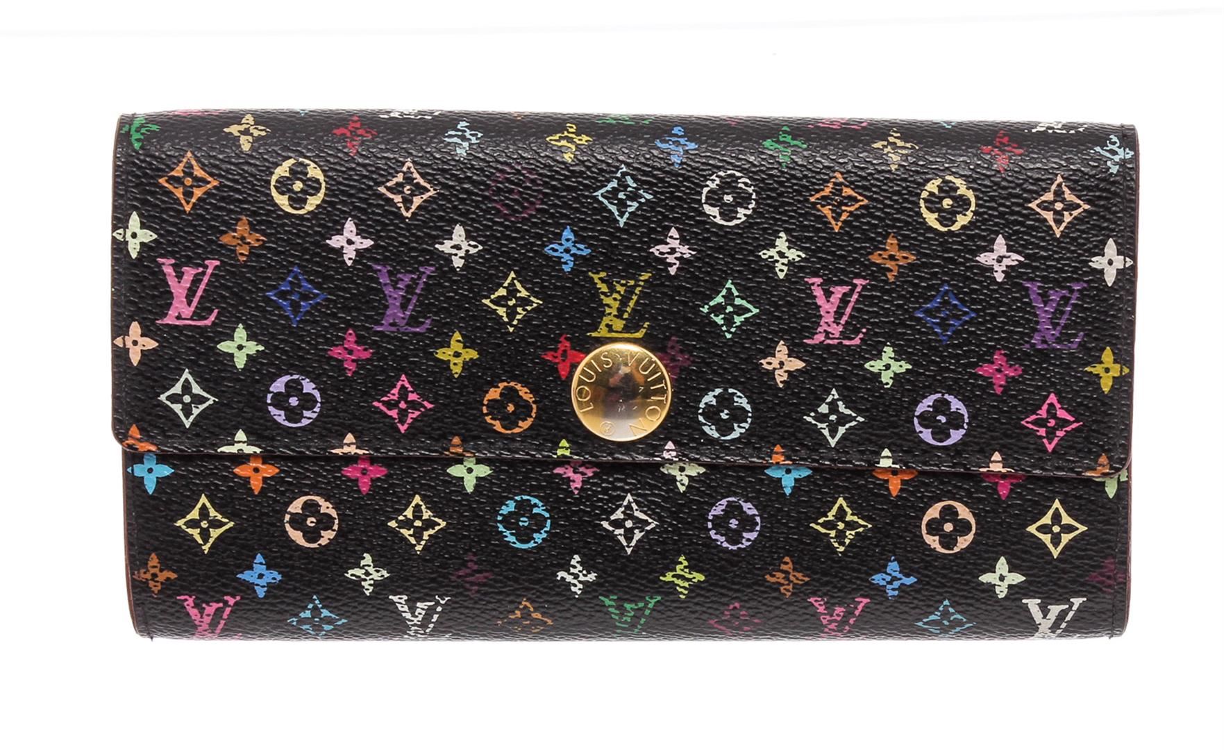 Black and Multicolore monogram coated canvas Louis Vuitton Sarah wallet with brass hardware, four card slots at flap underside, four interior compartments; one with zip closure, pink leather lining, six card slots and snap closure at front flap.