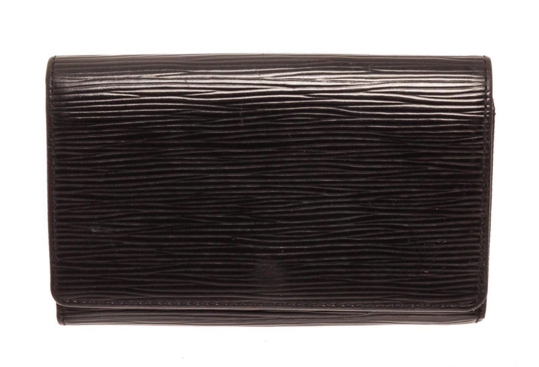 Louis Vuitton Black Porte Monnaie Wallet. Louis Vuitton Black Porte Monnaie Wallet with material epi leather, gold-tone hardware, trim tan vachetta leather, interior three compartments pocket and snap closure. MEASUREMENTS: Length 1 in / 3 cm Width 5
