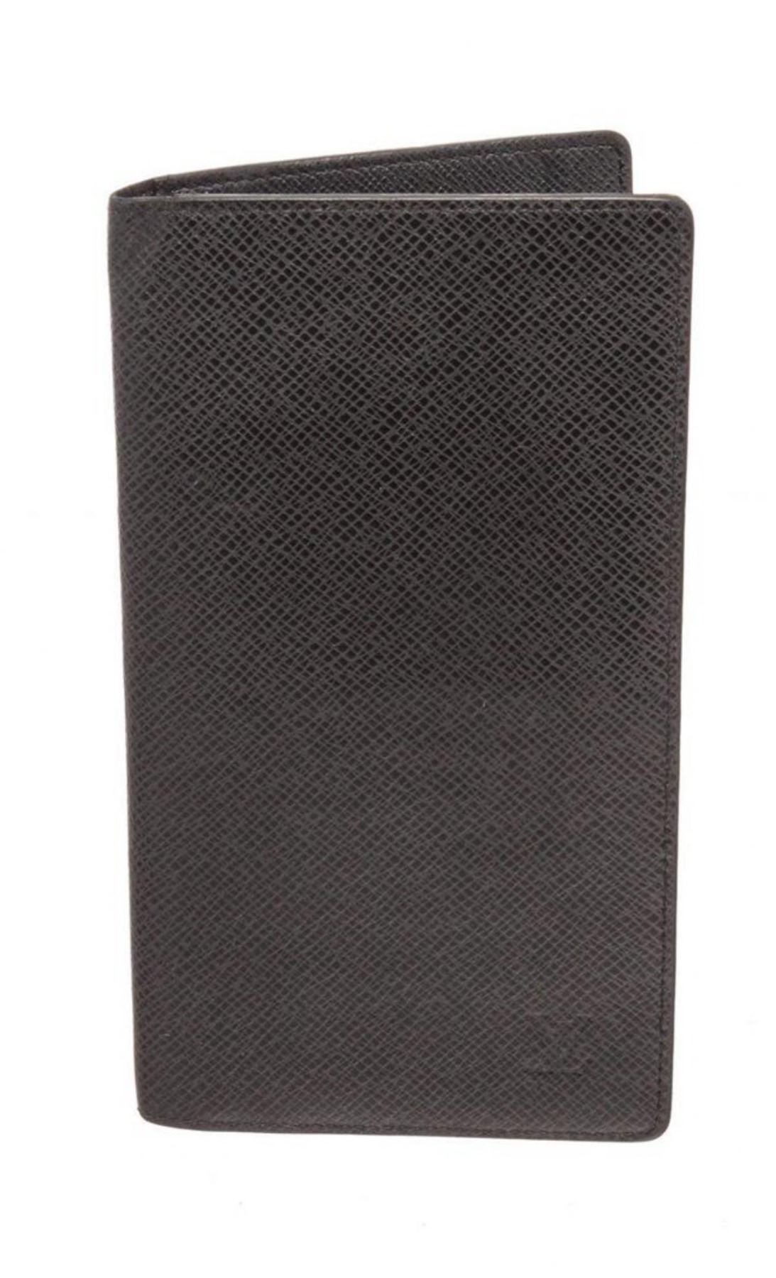 Louis Vuitton Black Ron Checkbook Long Wallet with gold-tone hardware, trim tan vachetta leather, three interior compartments pockets and snap closure. Measurements: Length: 0.5 in / 1 cm Width: 4.25 in / 11 cm 7 in / 18 cmCONDITION: Pre-Owned Good overall, please see photographs for detail.