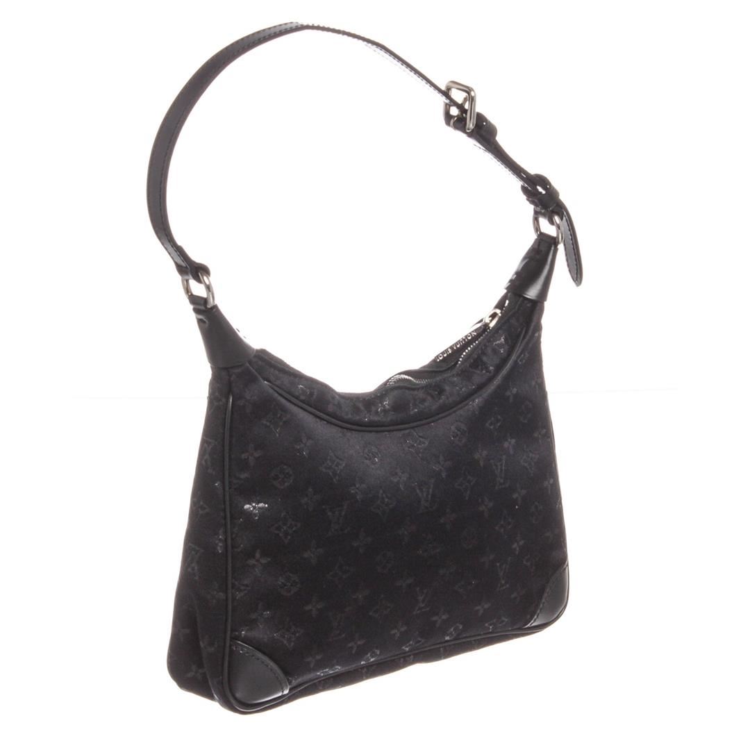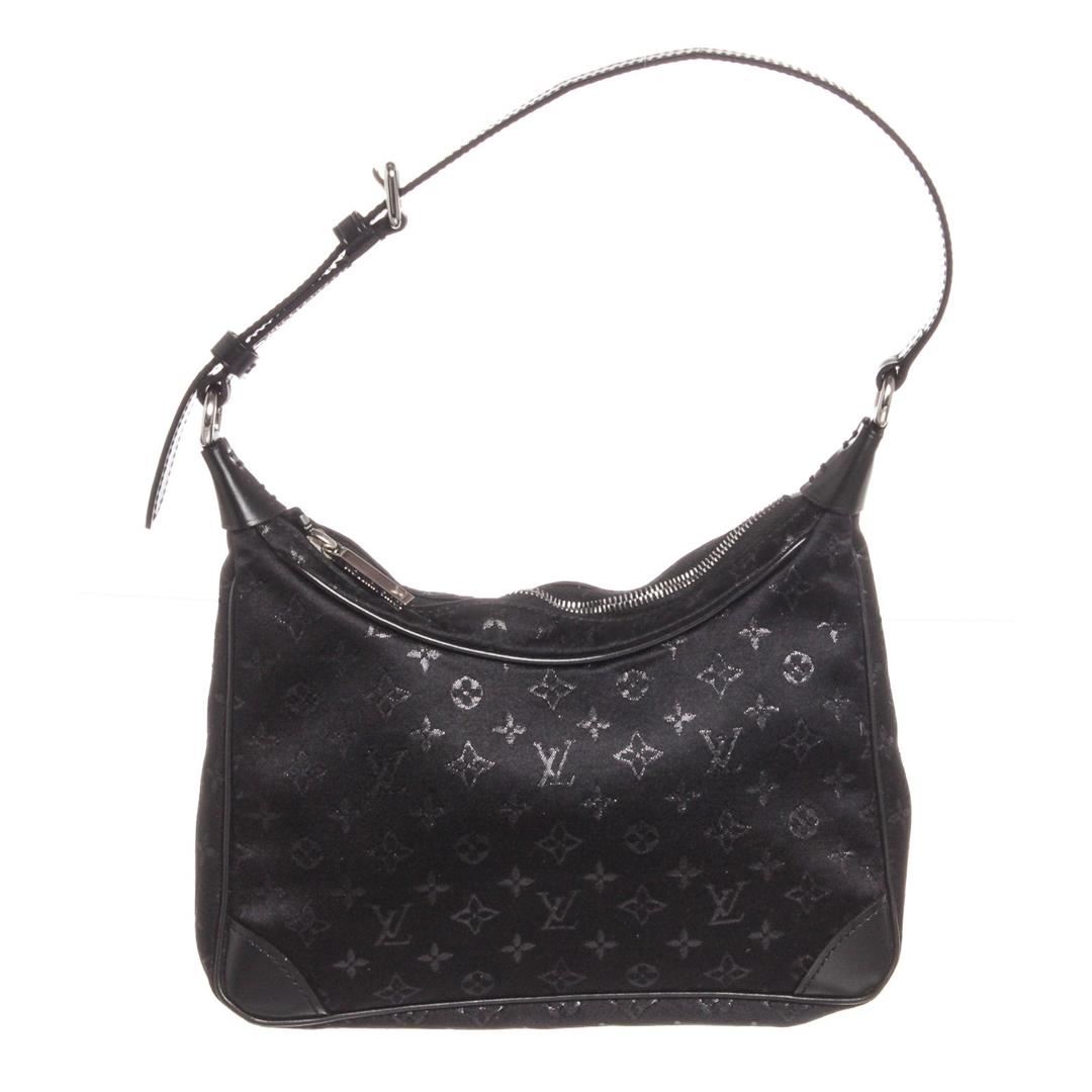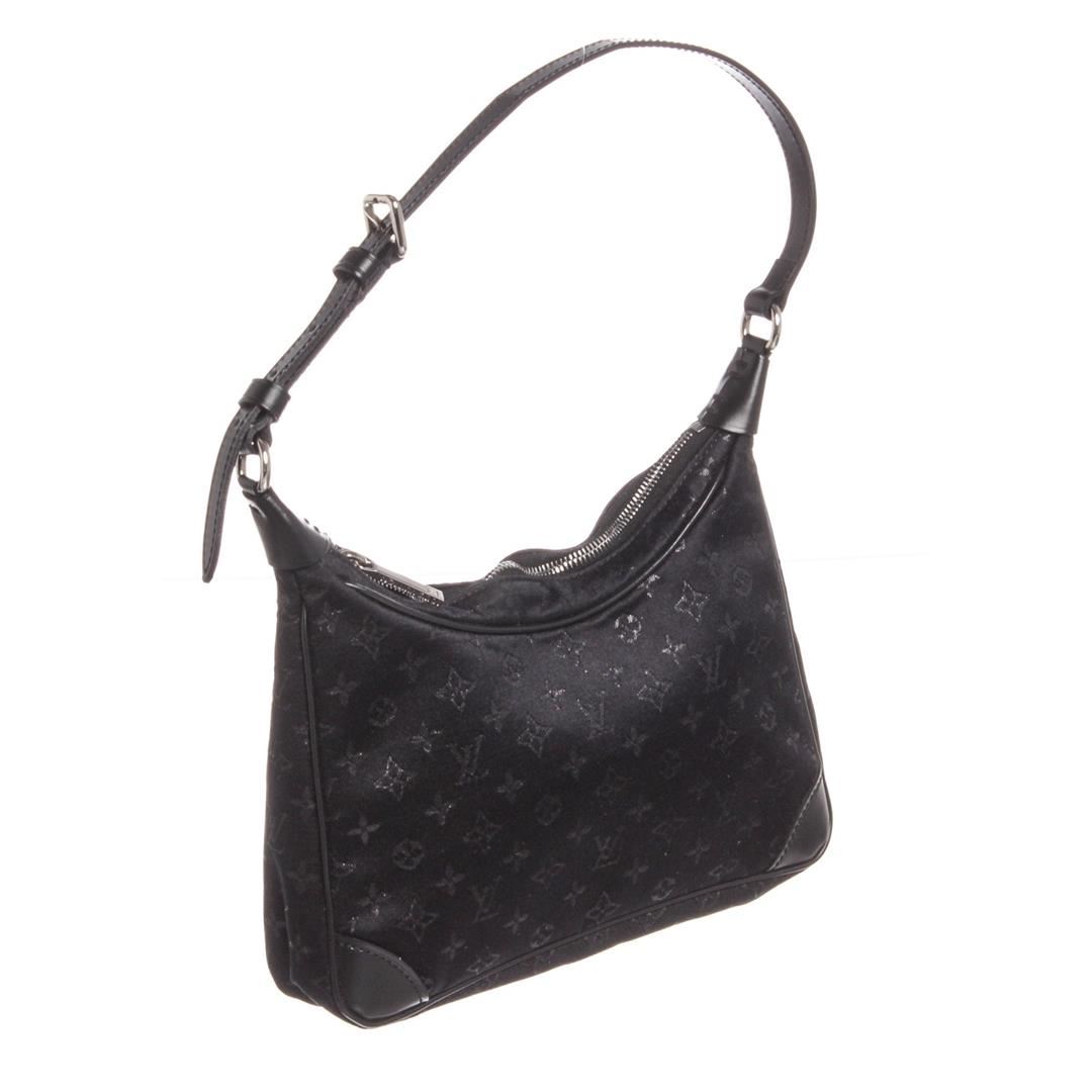 Black monogram satin Louis Vuitton Mini Boulogne bag with silver-tone hardware, black leather trim throughout, adjustable flat shoulder strap, tonal satin interior lining and zip closure at top.