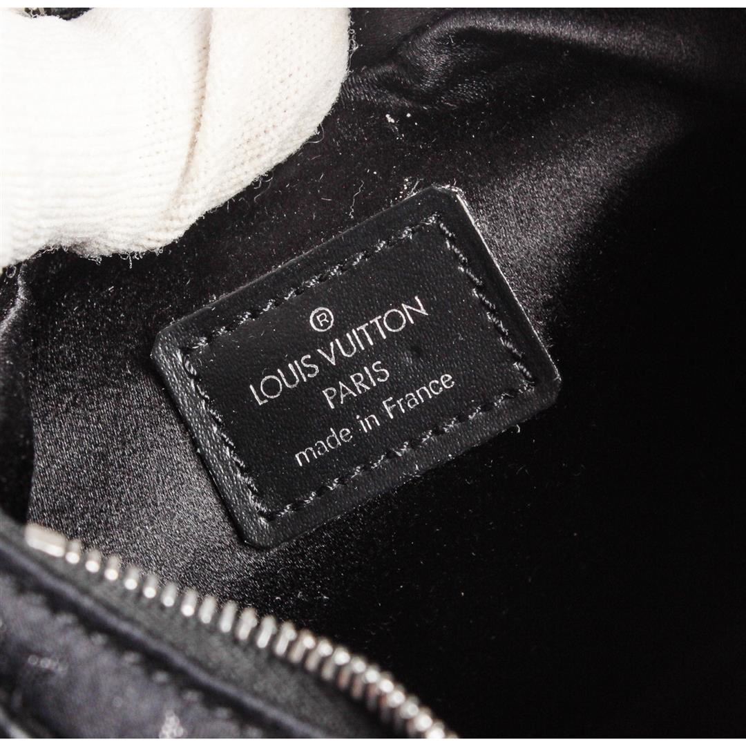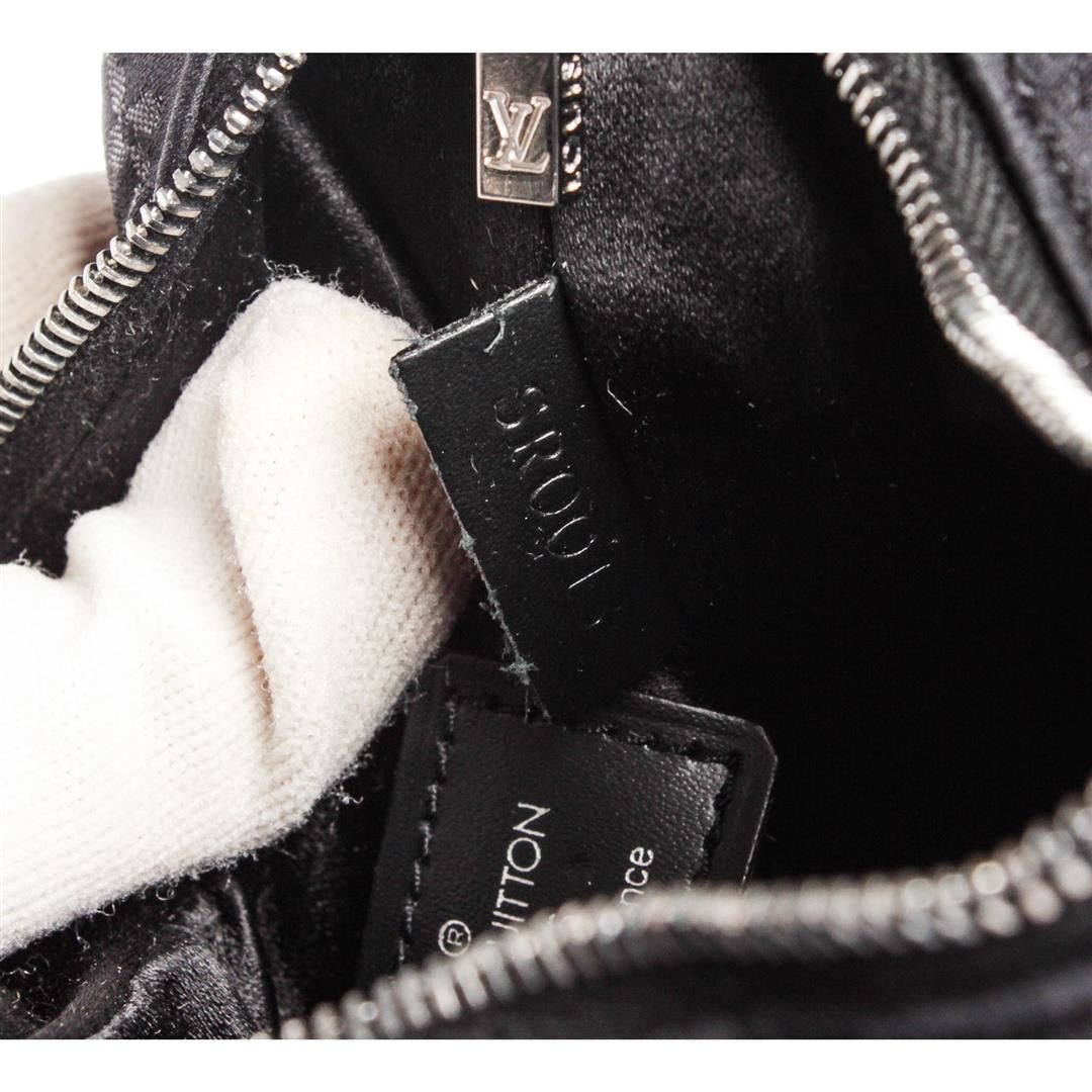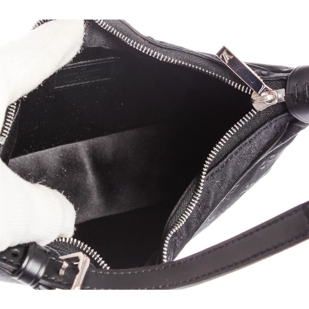 Black monogram satin Louis Vuitton Mini Boulogne bag with silver-tone hardware, black leather trim throughout, adjustable flat shoulder strap, tonal satin interior lining and zip closure at top.