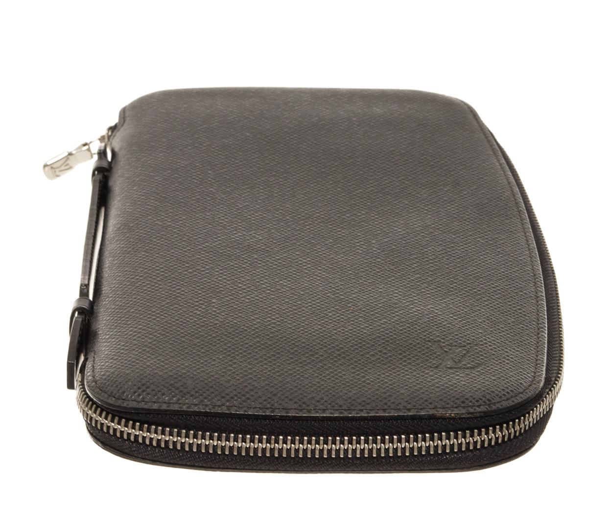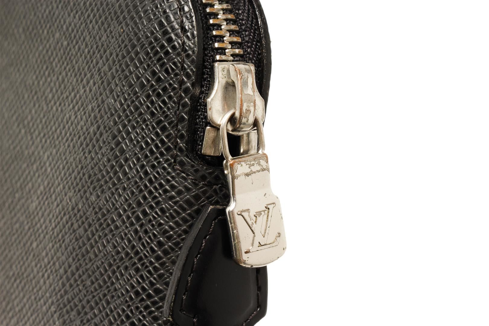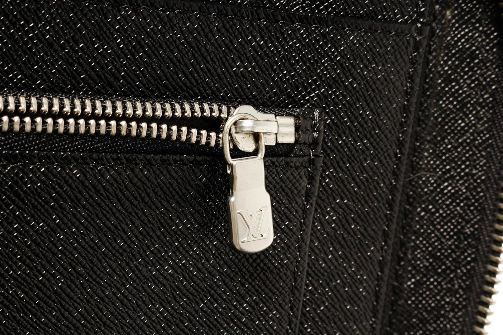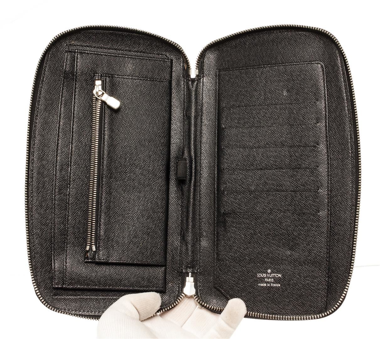 Louis Vuitton Black Taiga Leather Atoll Organizer Wallet. All available information is listed in the description and shown in the photos. Louis Vuitton Black Taiga Leather Atoll Organizer Wallet with silver tone hardware, black leather trim, black leather lining, interior zip pocket, six card slots, and a zipper closure.