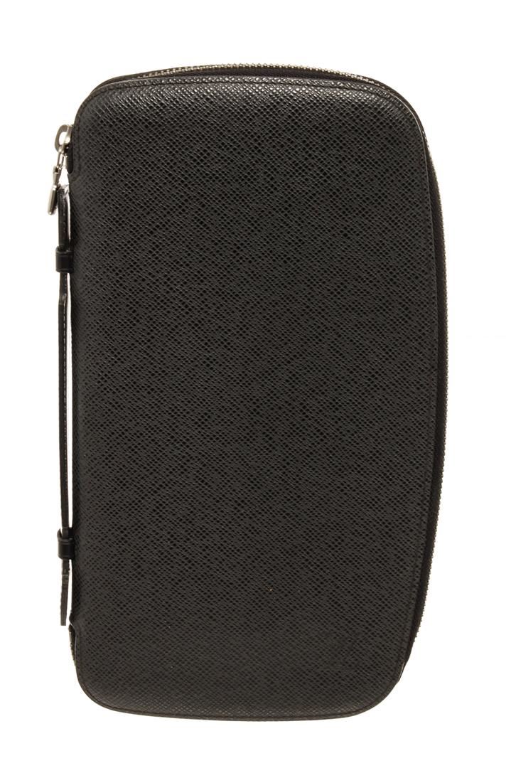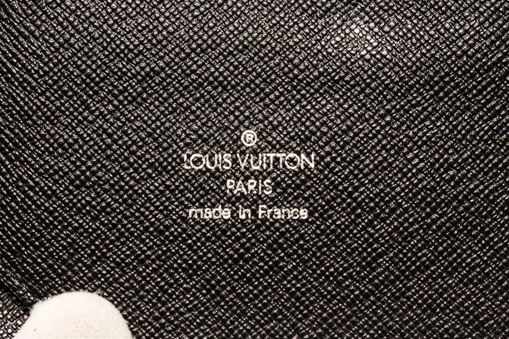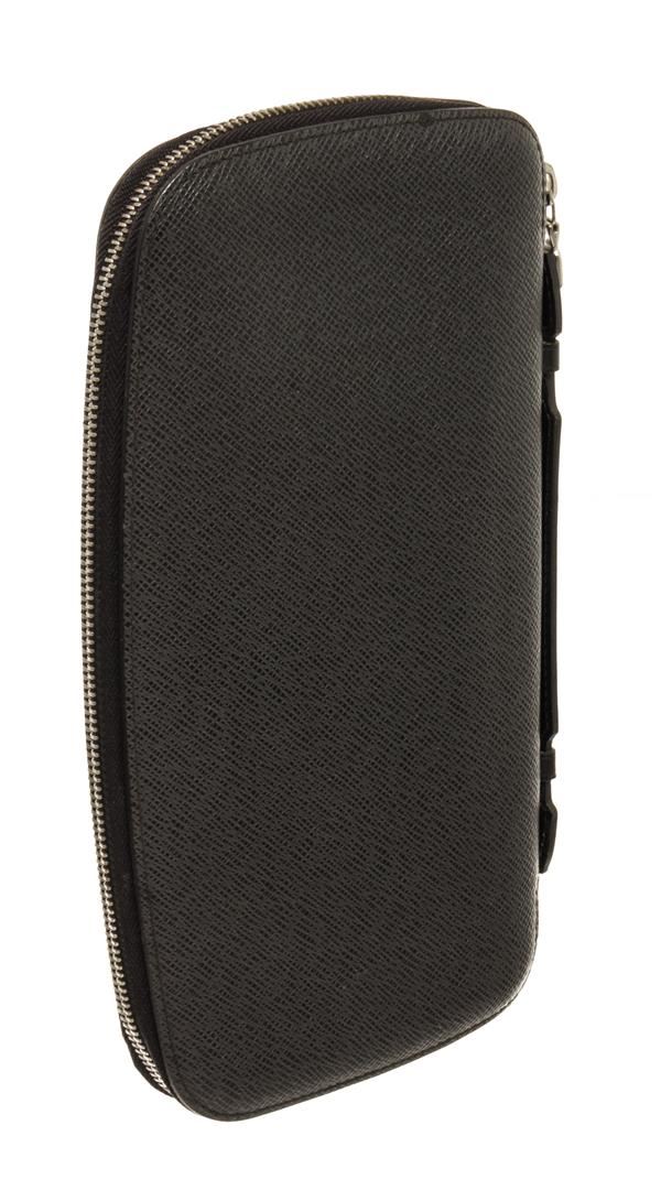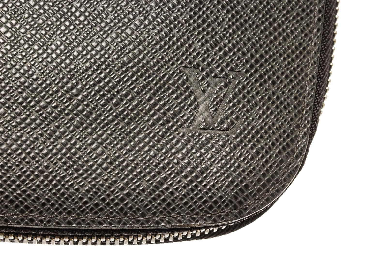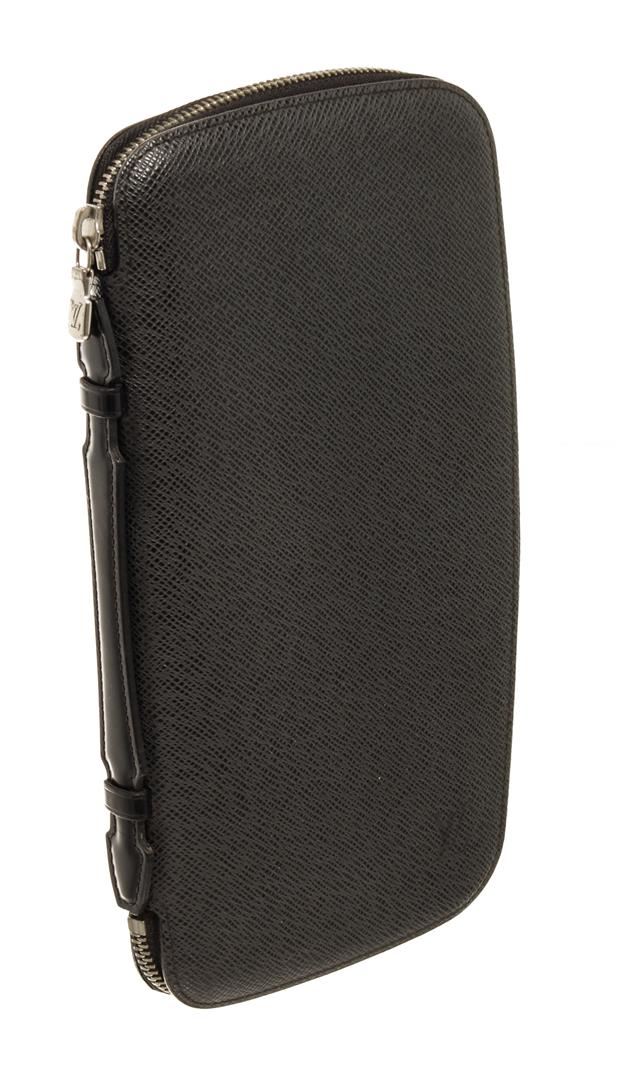 Louis Vuitton Black Taiga Leather Atoll Organizer Wallet. All available information is listed in the description and shown in the photos. Louis Vuitton Black Taiga Leather Atoll Organizer Wallet with silver tone hardware, black leather trim, black leather lining, interior zip pocket, six card slots, and a zipper closure.