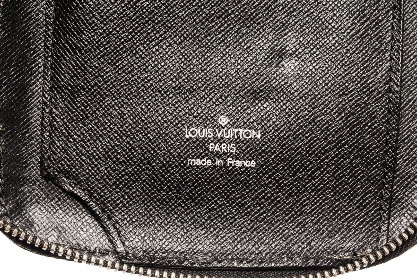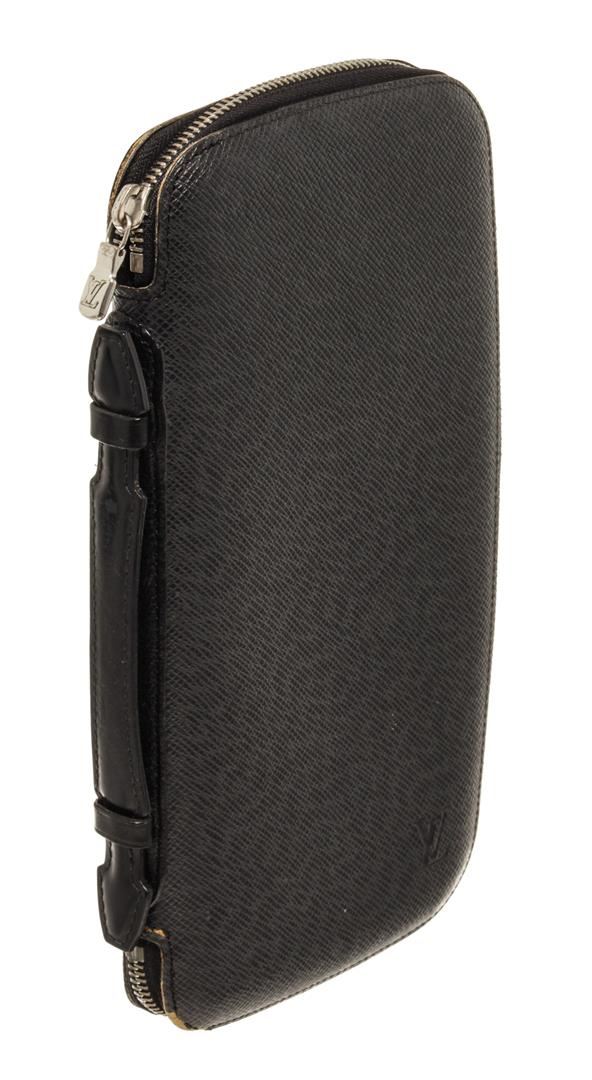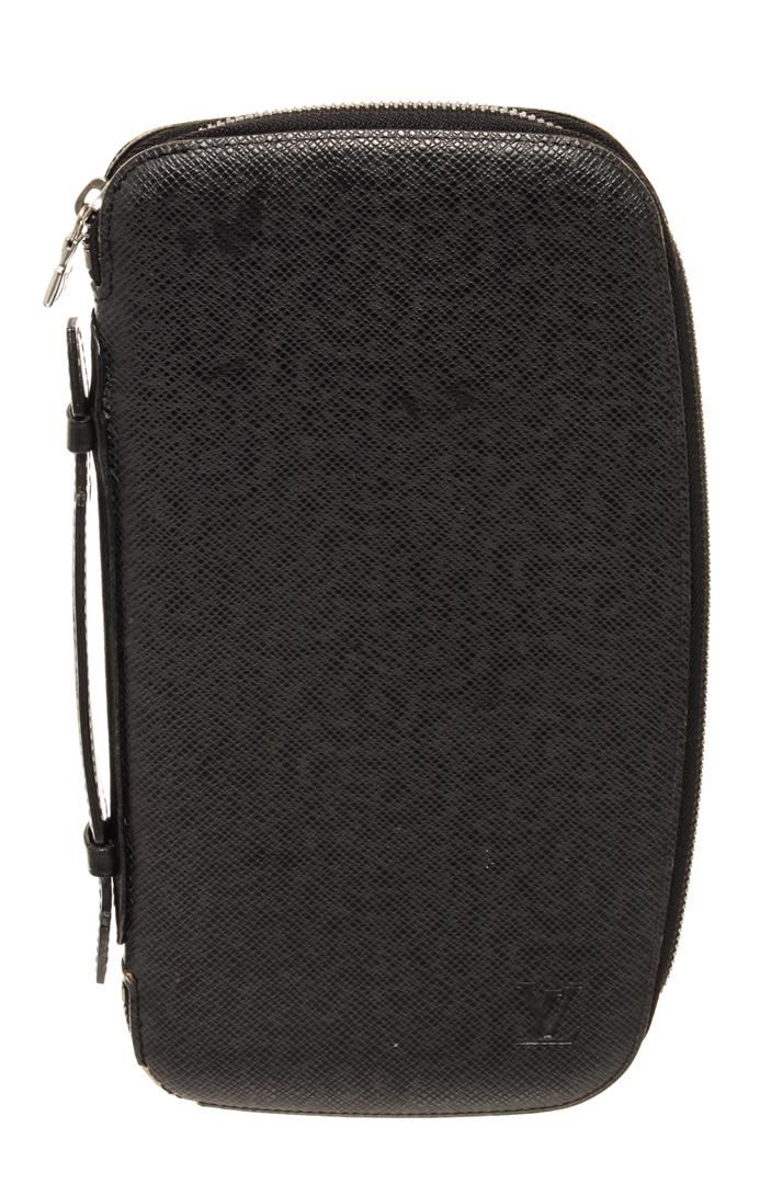 One Louis Vuitton Black Taiga Leather Atoll Organizer Wallet. Item is sold AS-IS. All available information is listed in the description and shown in the photo. Louis Vuitton Black Taiga Leather Atoll Organizer Wallet with silver tone hardware, black leather trim, black leather lining, interior zip pocket, open slot pockets, and zipper closure.
