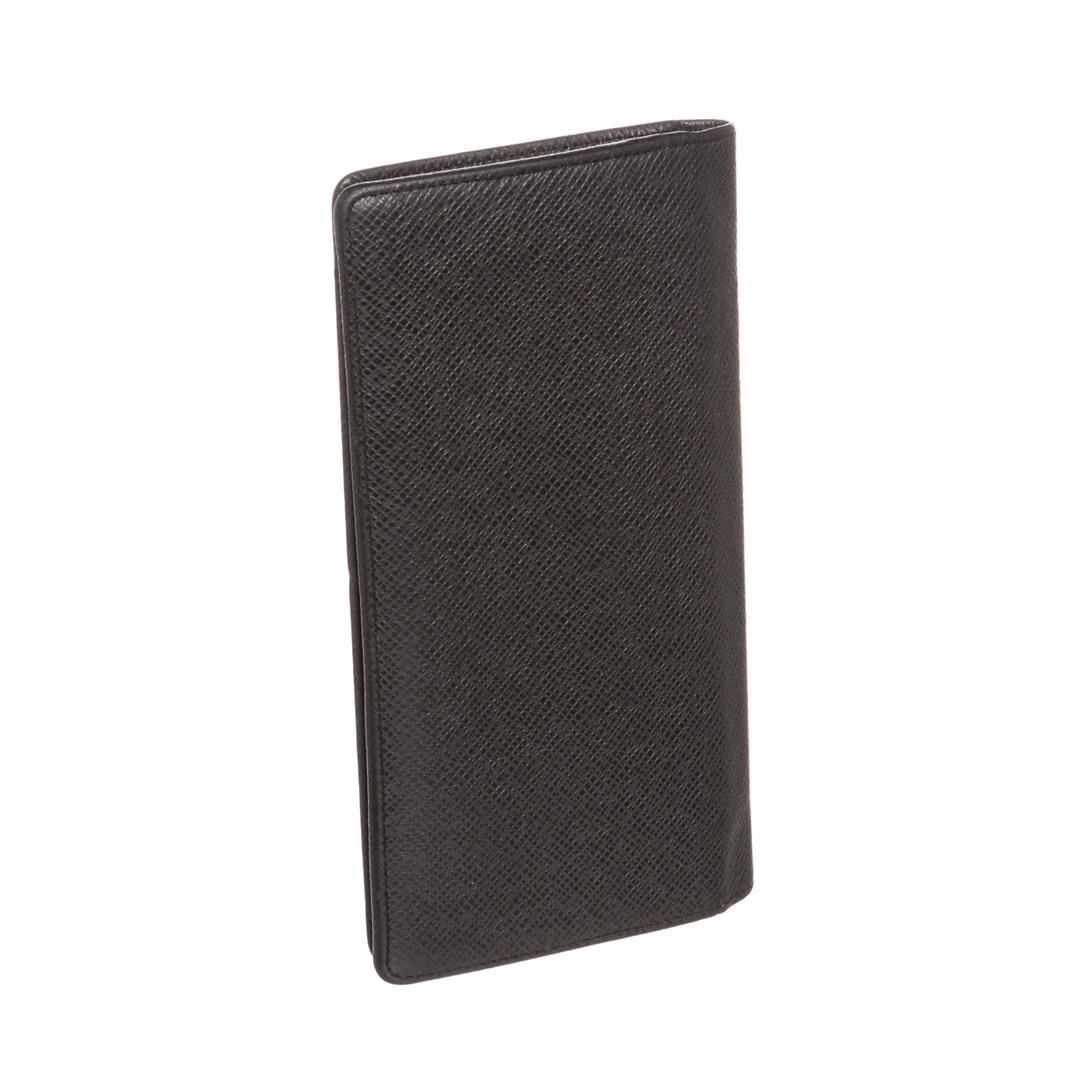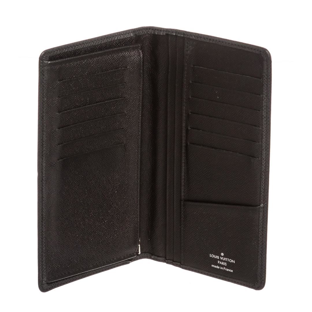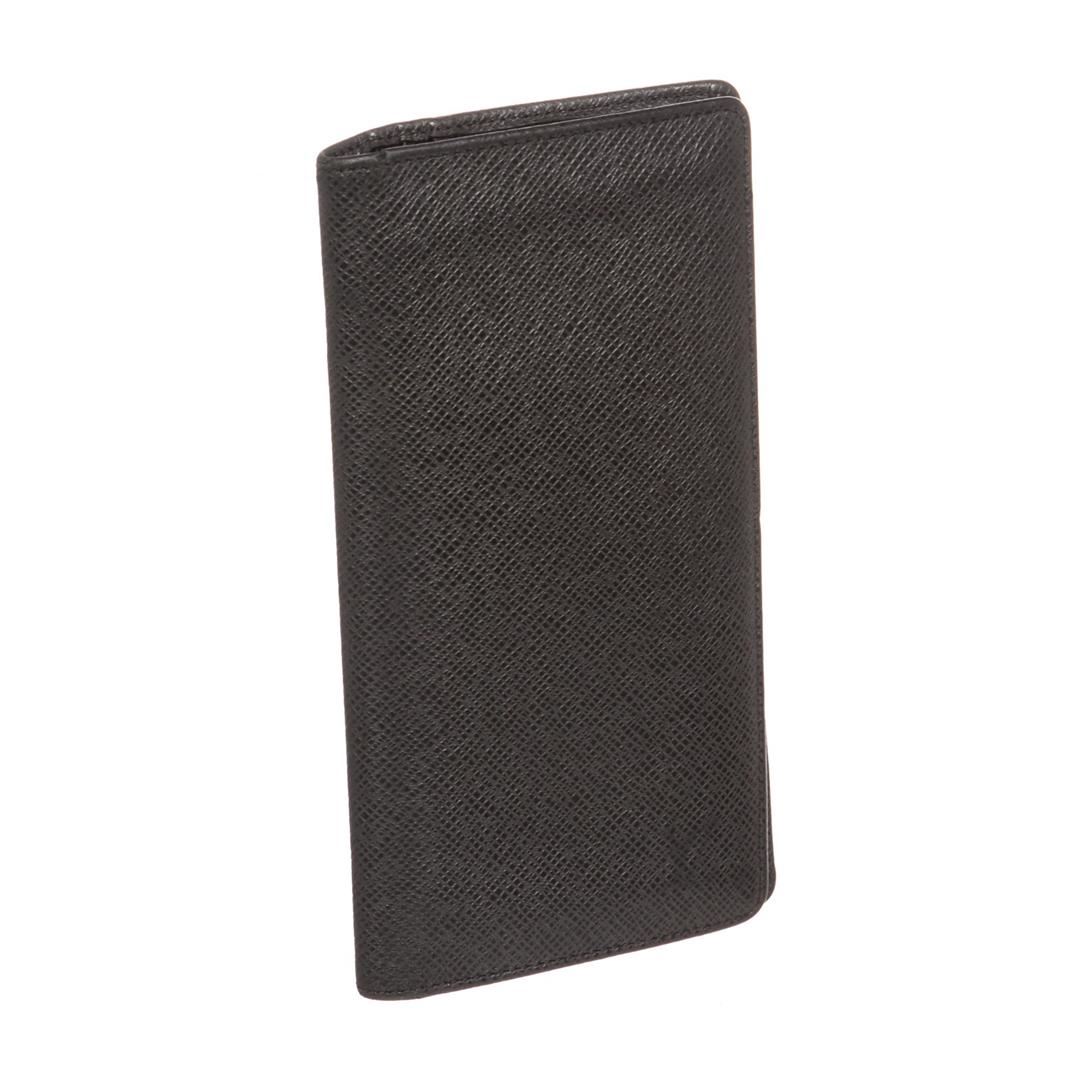 Taiga leather Louis Vuitton Brazza wallet with silver-tone hardware, 12 card slots, single zip pouch, three bill compartments and fold-over closure.