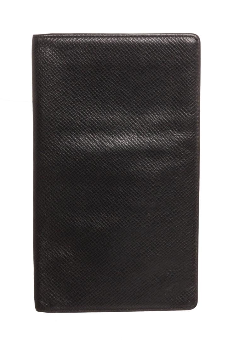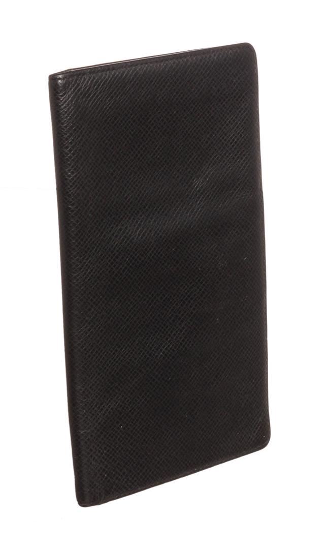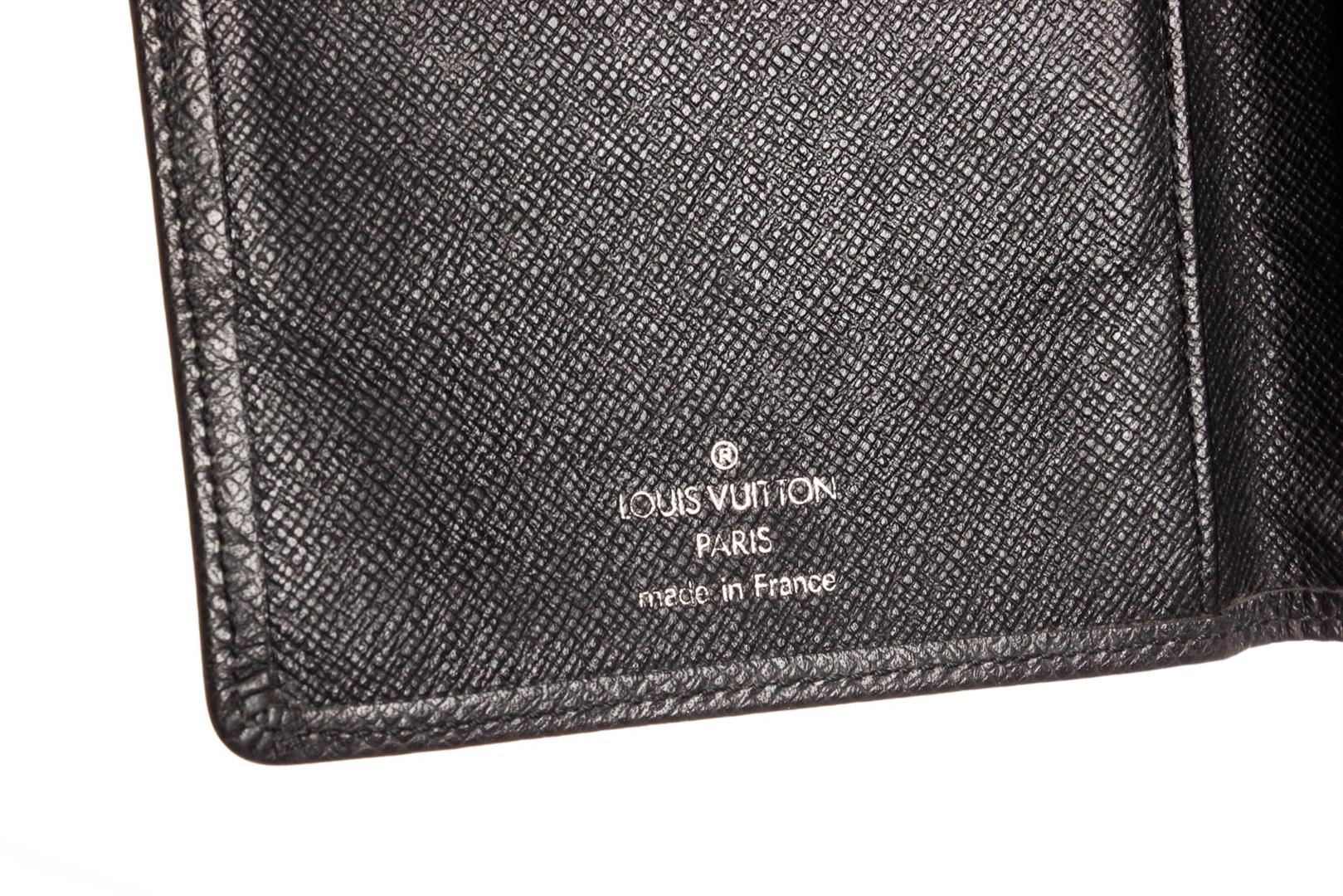 Black taiga leather Louis Vuitton checkbook wallet with tonal leather lining, six card slots, two side slip pockets, and an open side.