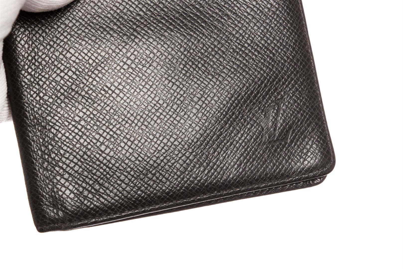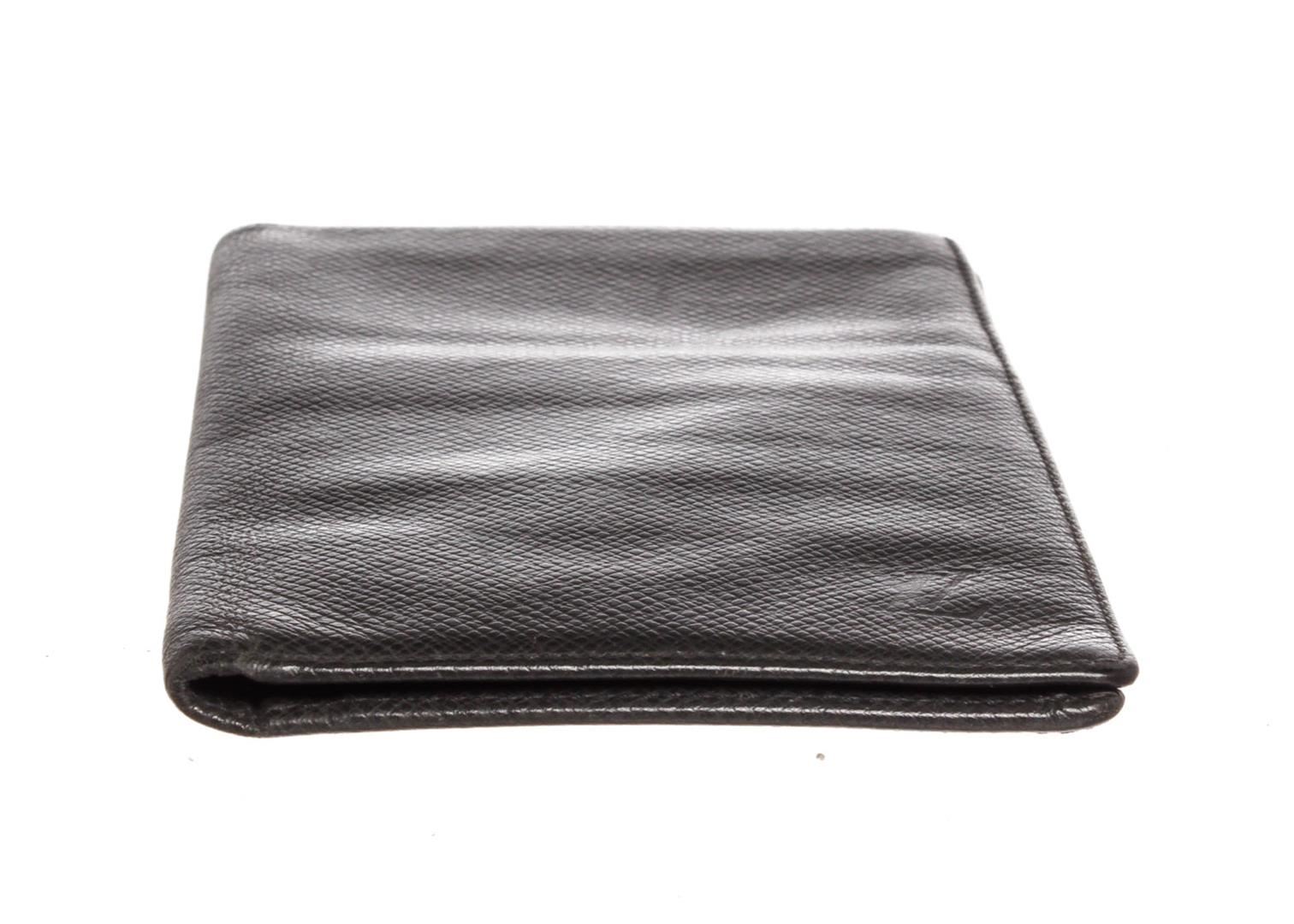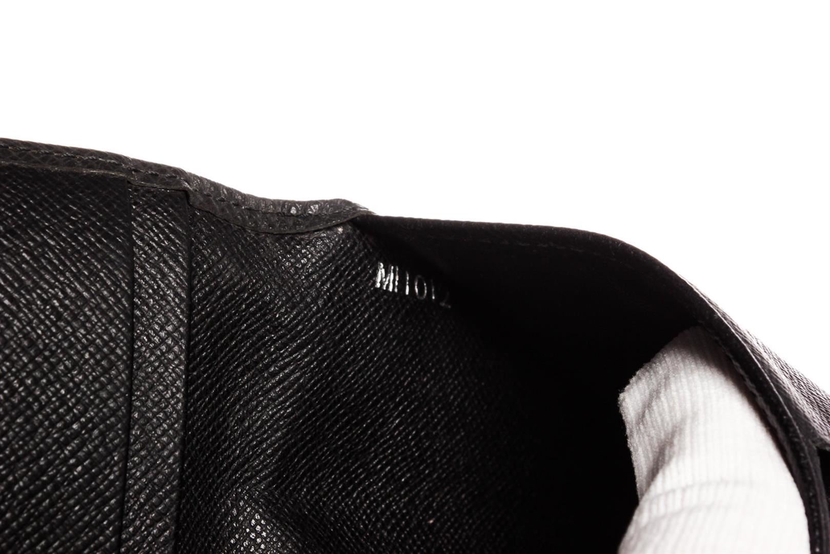 Black taiga leather Louis Vuitton checkbook wallet with tonal leather lining, six card slots, two side slip pockets, and an open side.