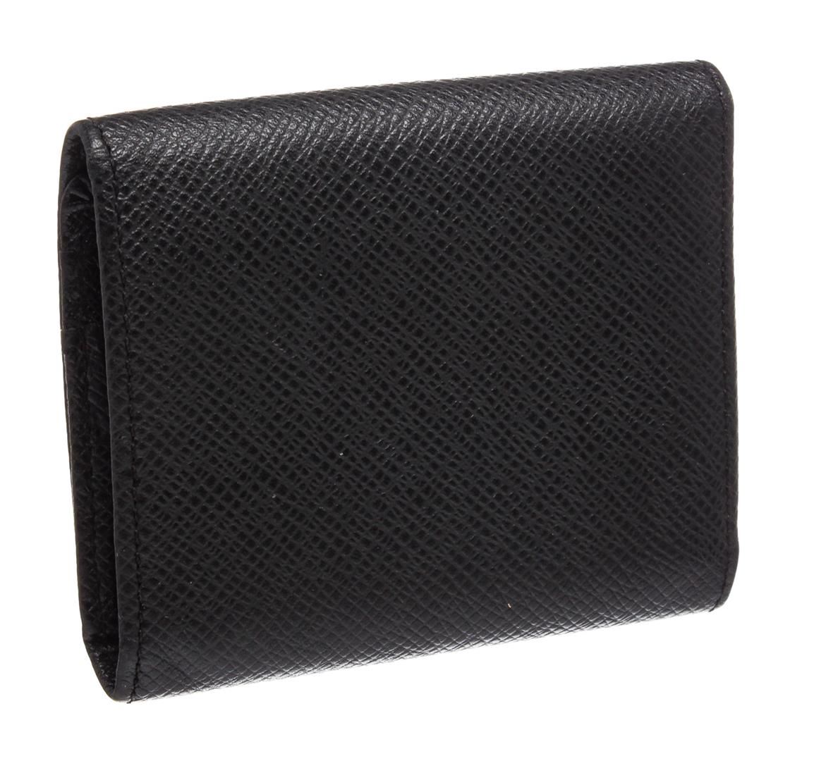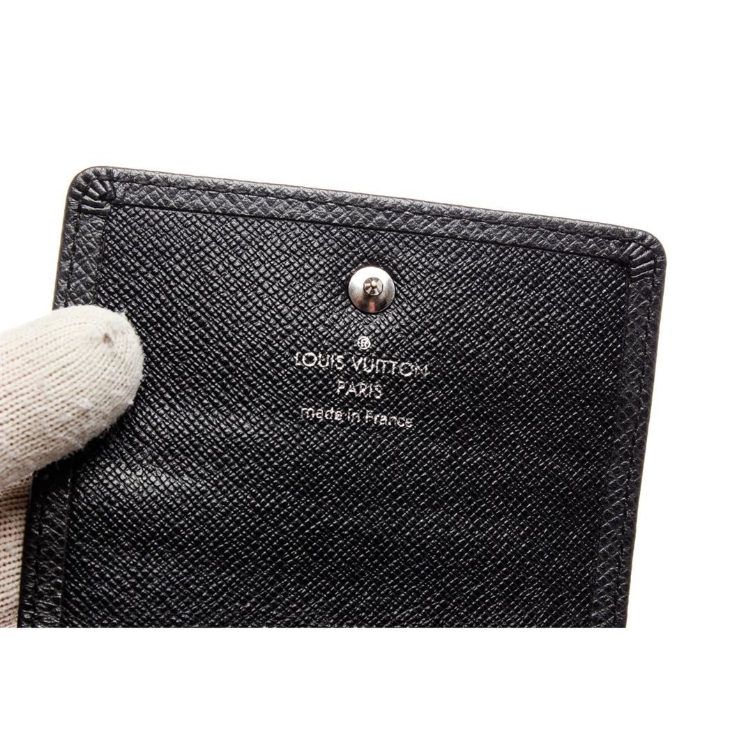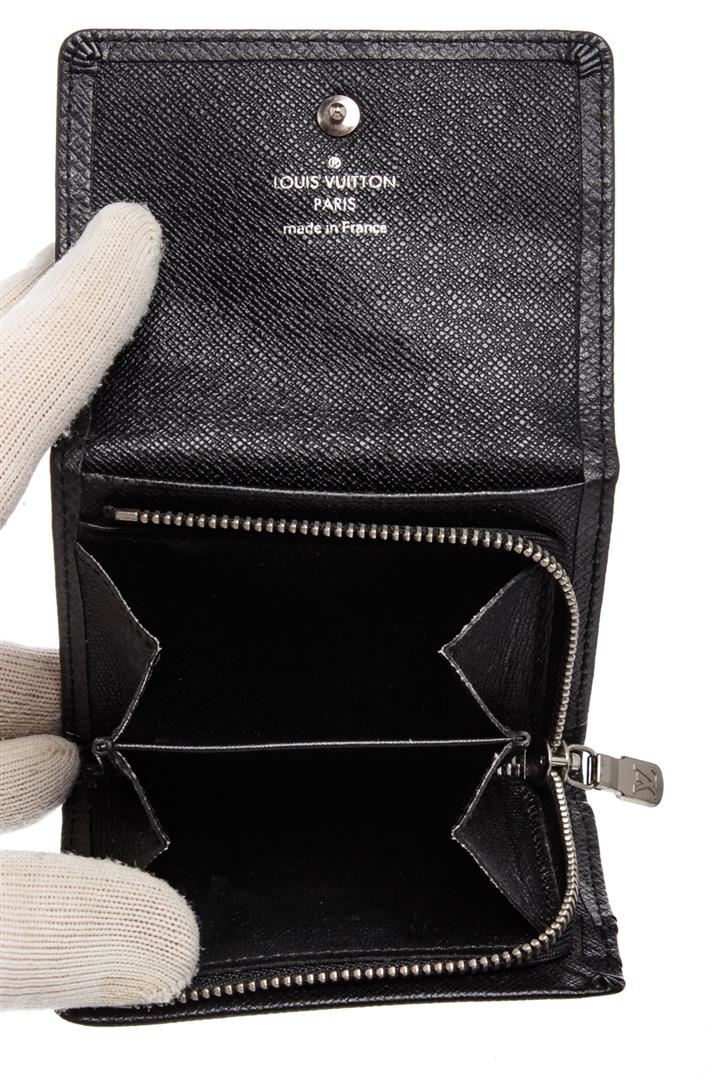 Louis Vuitton black Taiga leather coin purse compact wallet with slit pocket on interior back, dual compartments with zip around closure, and two card slots on exterior under flap with snap closure.