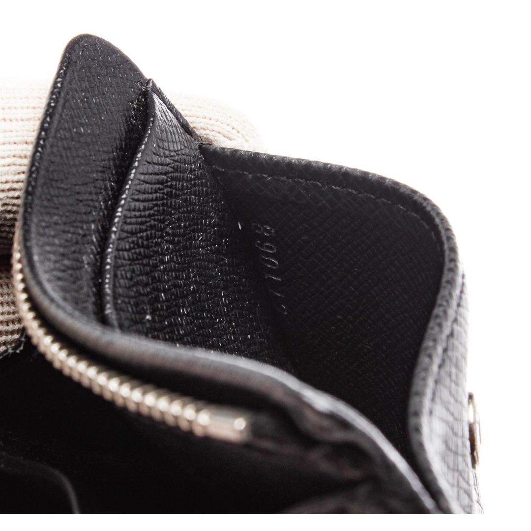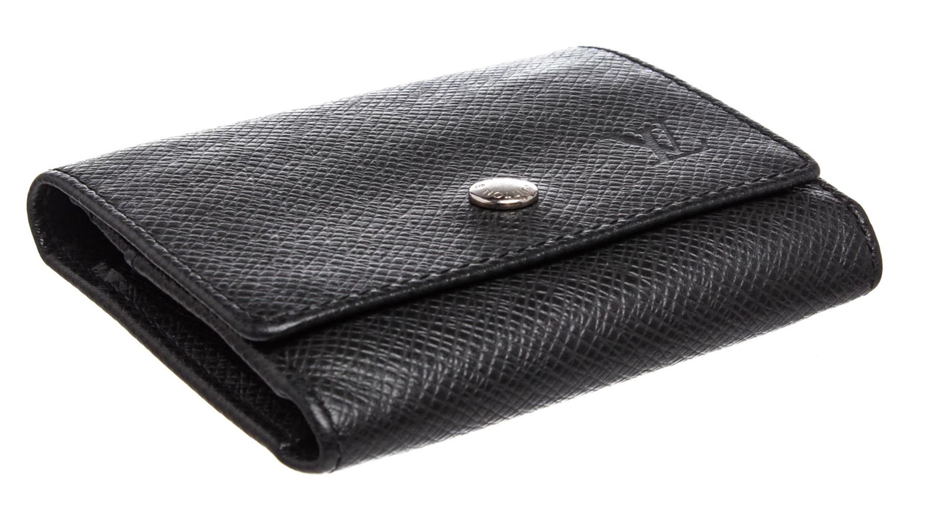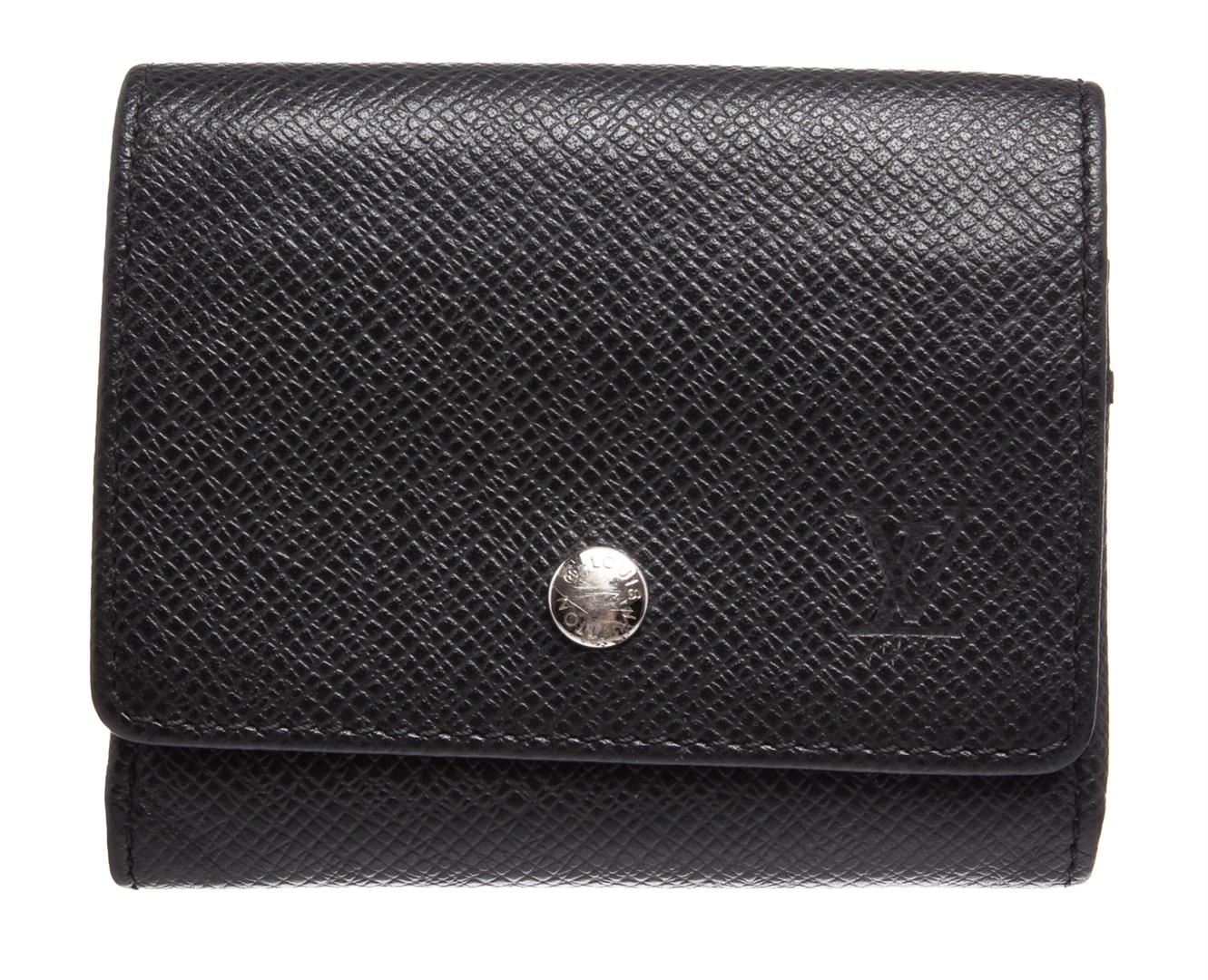 Louis Vuitton black Taiga leather coin purse compact wallet with slit pocket on interior back, dual compartments with zip around closure, and two card slots on exterior under flap with snap closure.