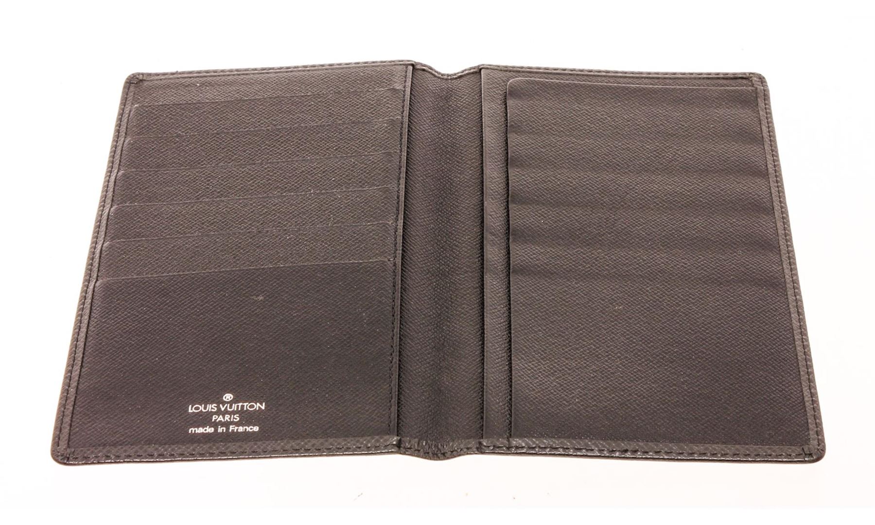Louis Vuitton black taiga leather long checkbook wallet with debossed logo accent at front, tonal Taiga leather lining, foil-stamped logo accent, three interior slit compartments, six card slots and bifold closure.