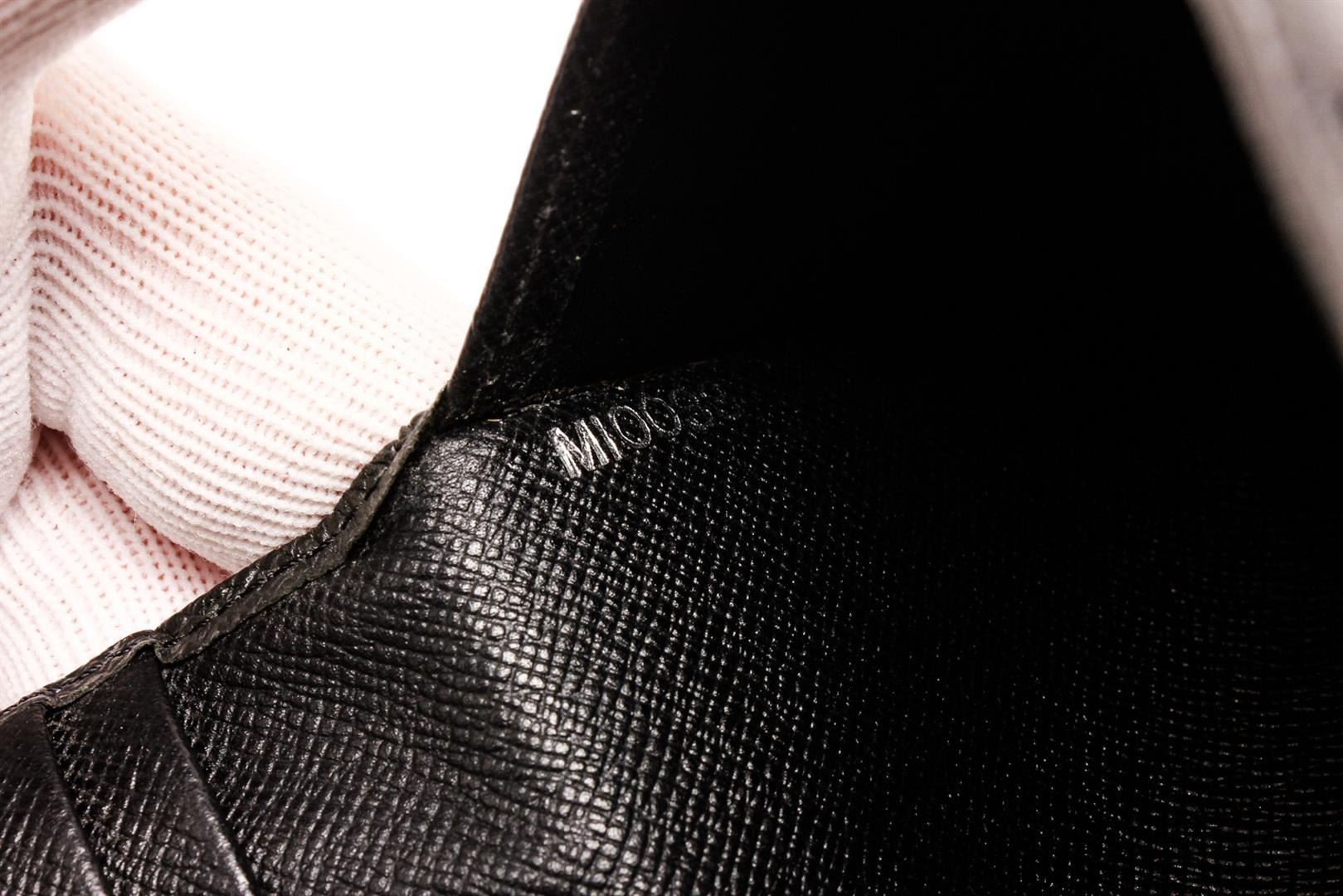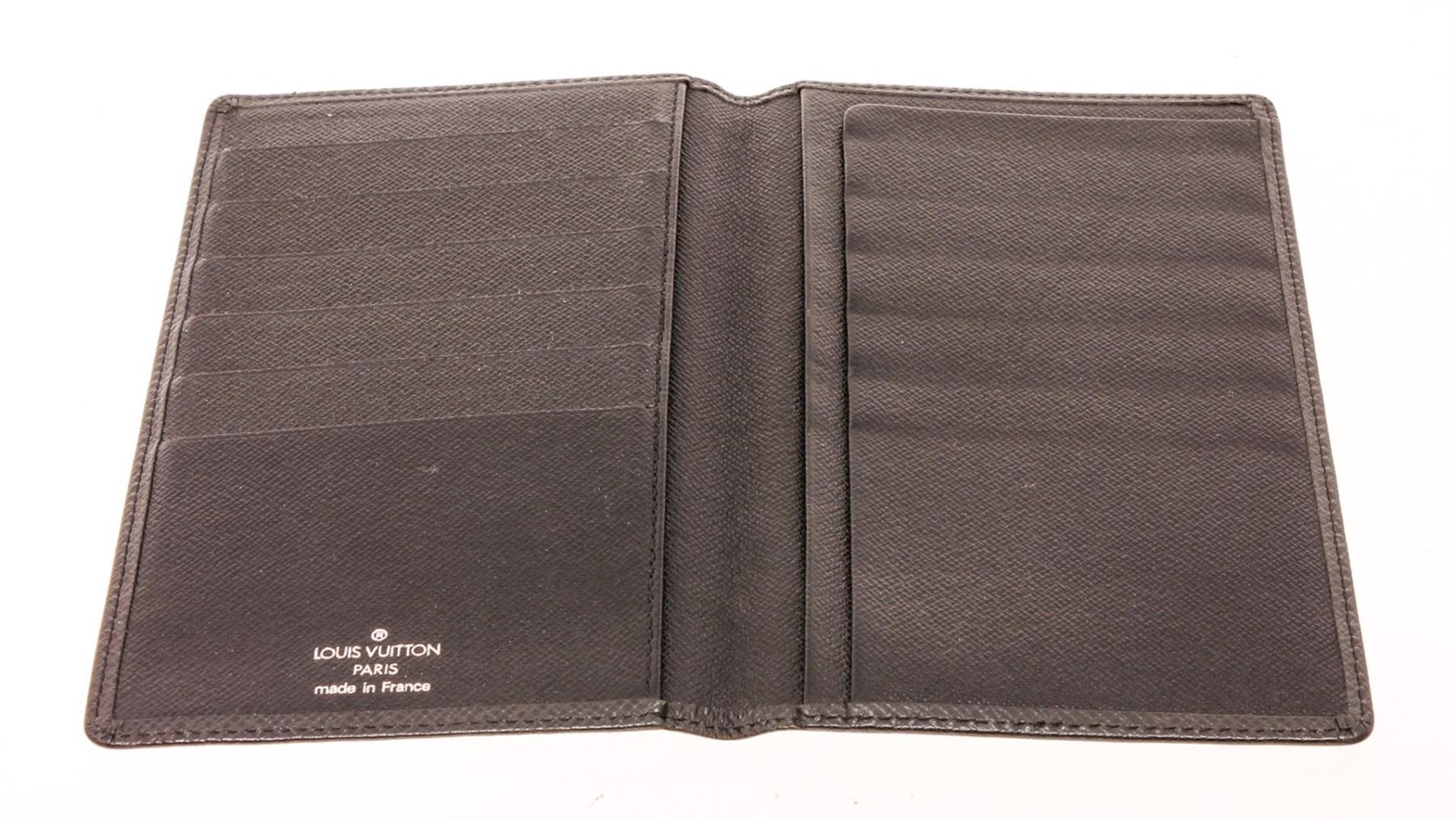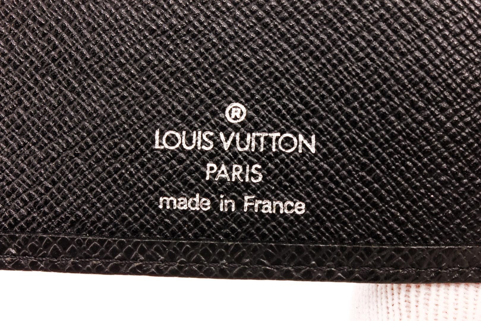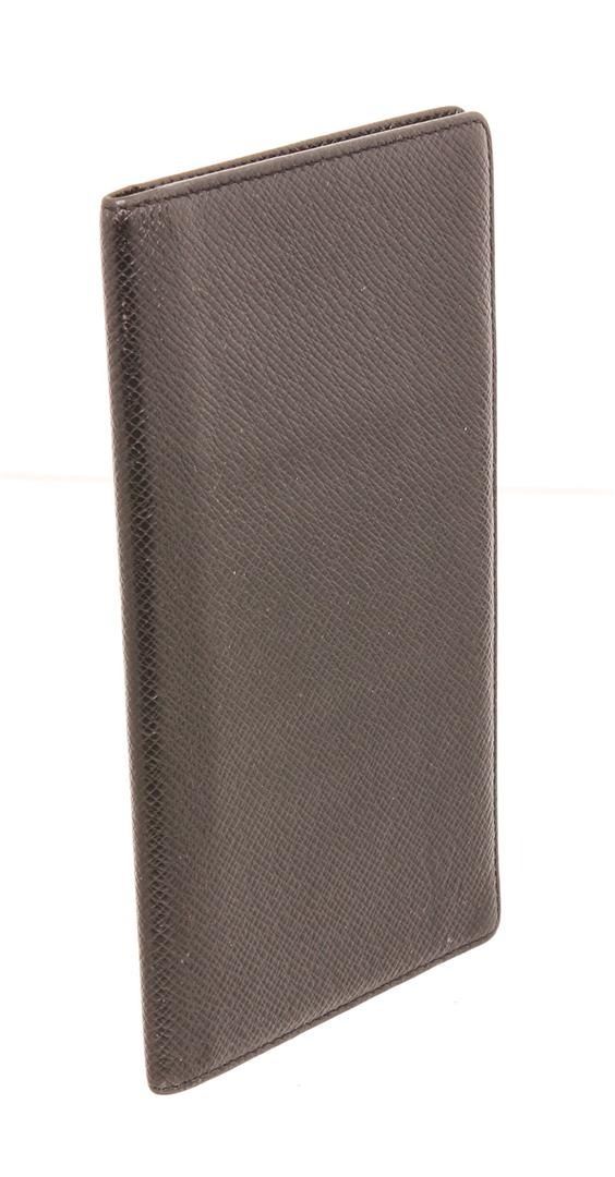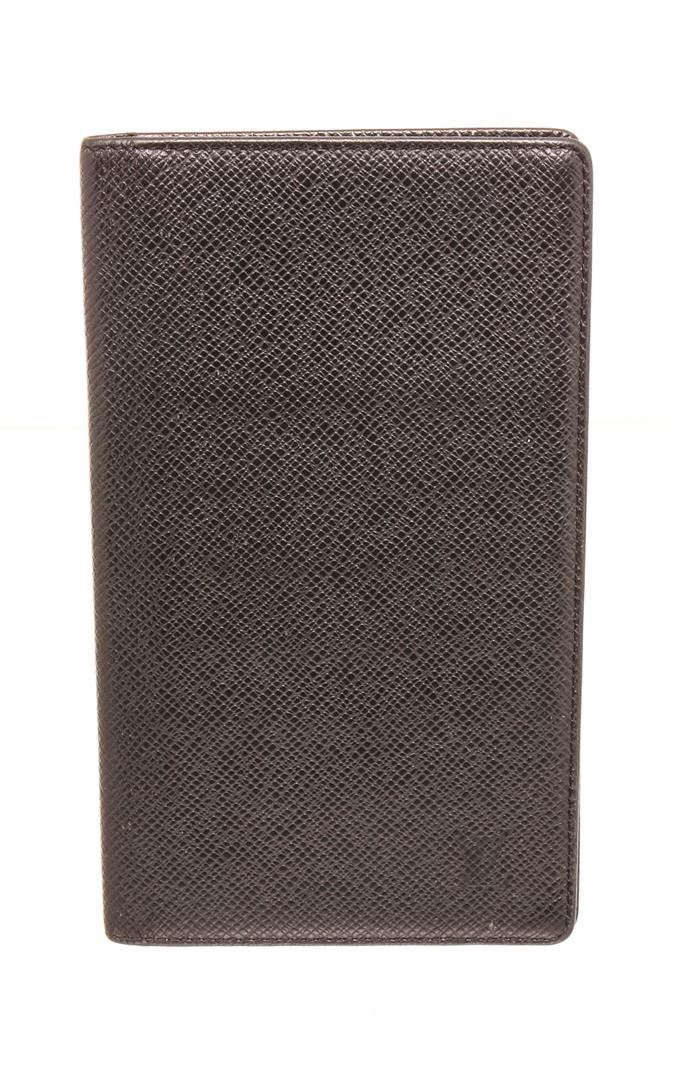 Louis Vuitton black taiga leather long checkbook wallet with debossed logo accent at front, tonal Taiga leather lining, foil-stamped logo accent, three interior slit compartments, six card slots and bifold closure.