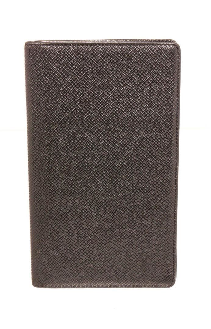 Louis Vuitton black taiga leather long checkbook wallet with debossed logo accent at front, tonal Taiga leather lining, foil-stamped logo accent, three interior slit compartments, six card slots and bifold closure. Measurements: Length: 4.25 in / 11 cm Width: 0.25 in / 1 cm 7.5 in / 19 cmCONDITION: Pre-Owned Good overall, please see photographs for detail.