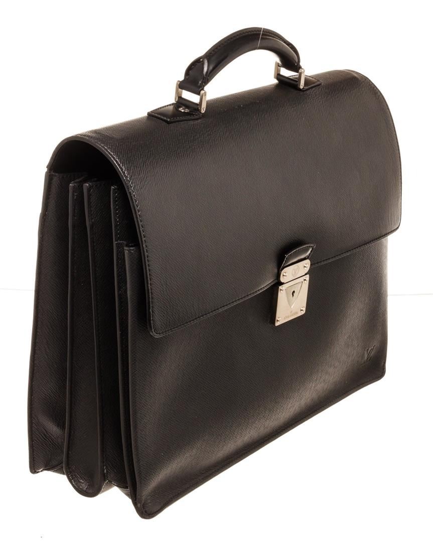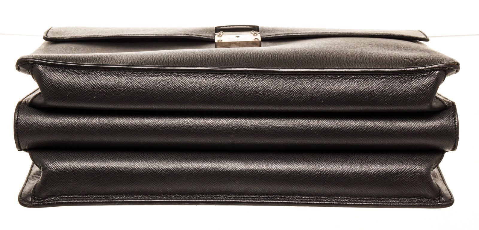 Louis Vuitton Black Taiga Leather Robusto 3 Briefcase Bag with taiga leather, silver-tone hardware, single rolled top handle, embossed logo accent at front corner, back exterior slit pocket, grey tonal canvas lining, three interior compartments; one with zip closure.